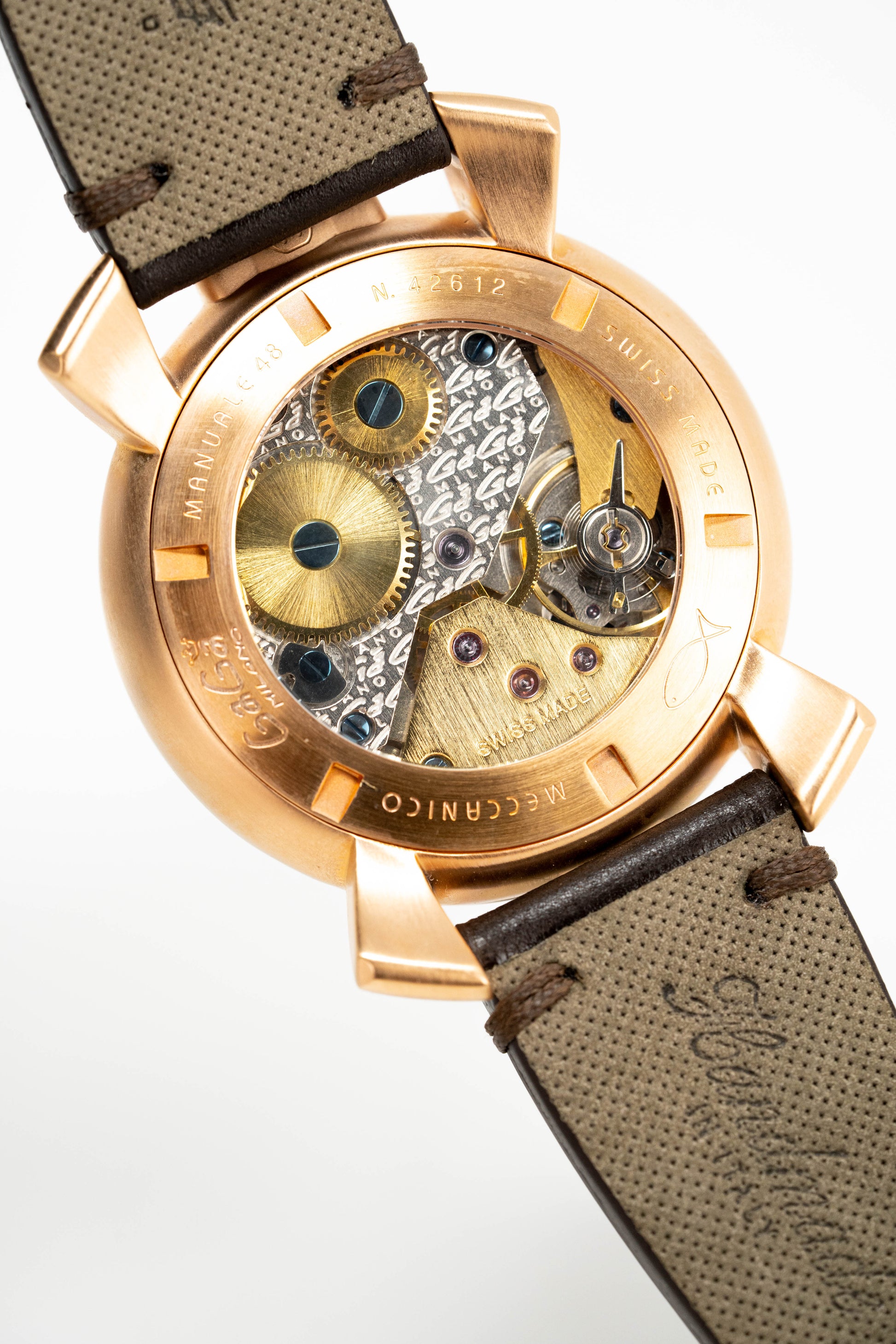 48mm x 16mm Rose Gold PVD Stainless Steel Case - Sapphire Crystal Case Back which shows off the balance spring, the Wind Mechanism and The GaGà Milano Craftsmanship.