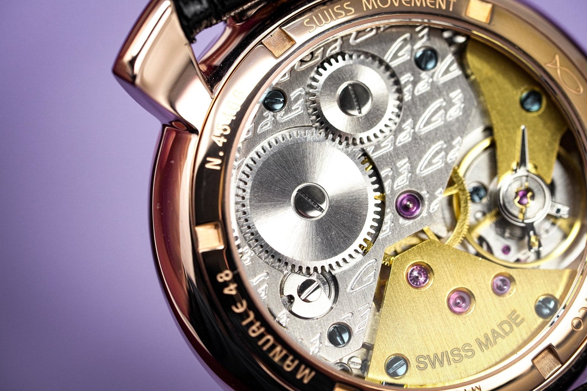 Swiss Made Mechanical, Hand Wound, GaGà 6497 Movement with a power reserve of 36 Hours - 21,600 bph - 21 Jewels - Screw Down Crown at 12 O'Clock - Open Sapphire Crystal Case Back which shows off the Mainspring, the Manual Wind Mechanism and The GaGà Milano craftsmanship