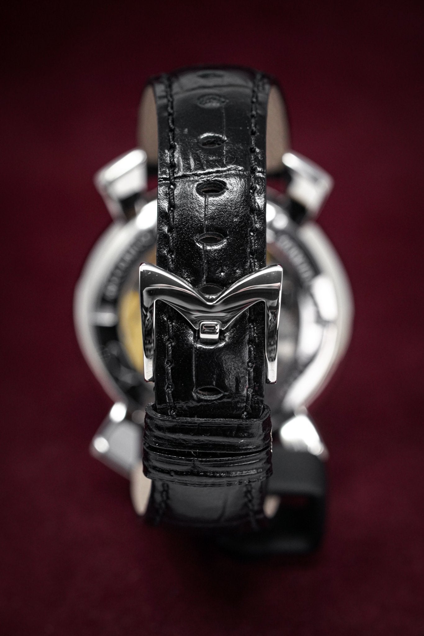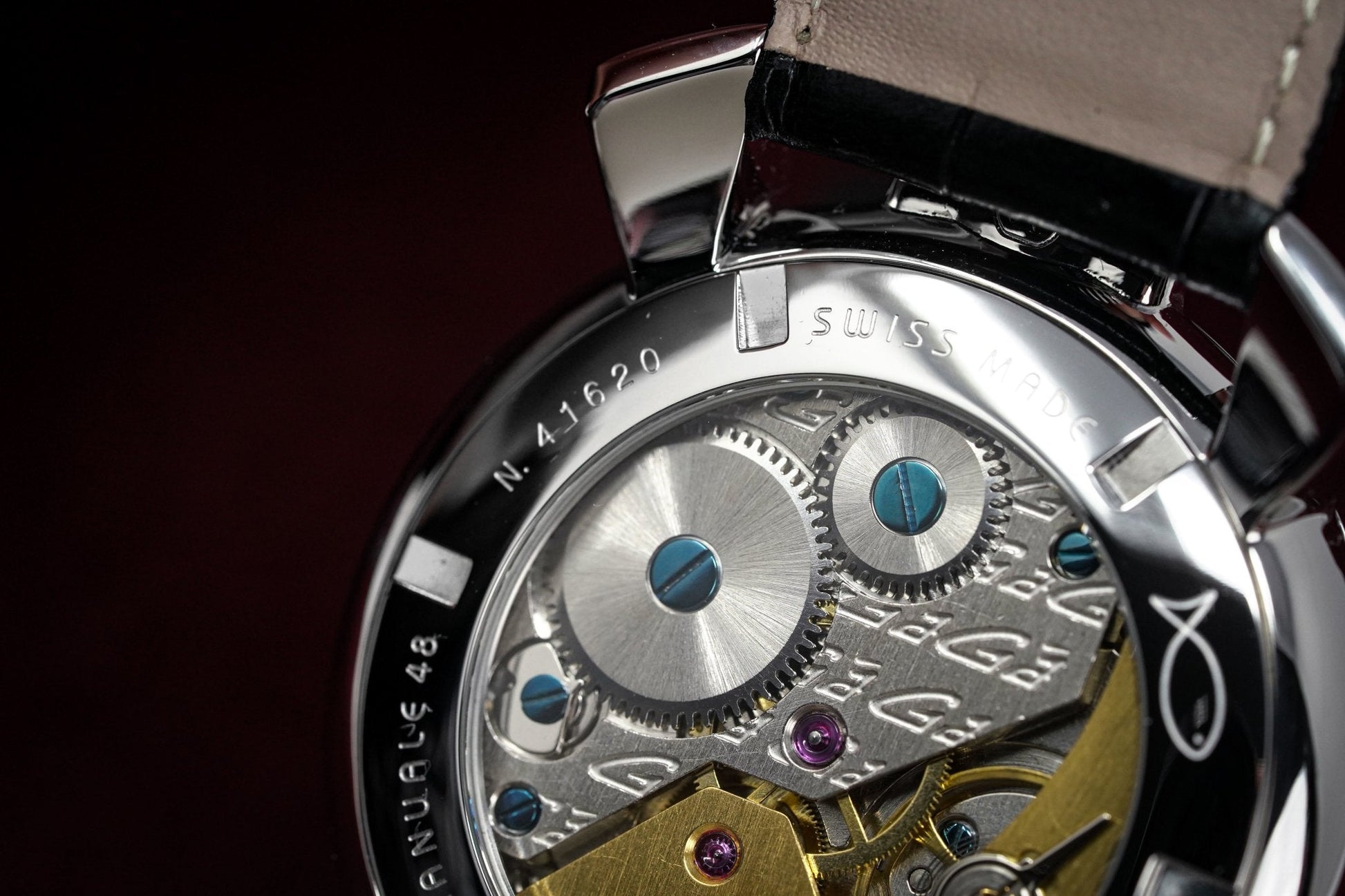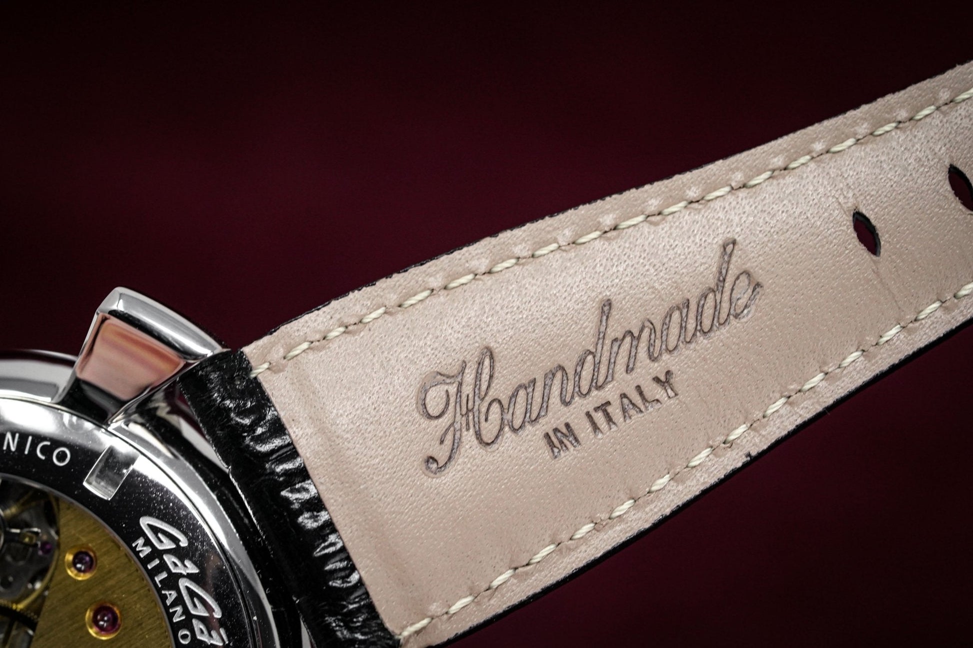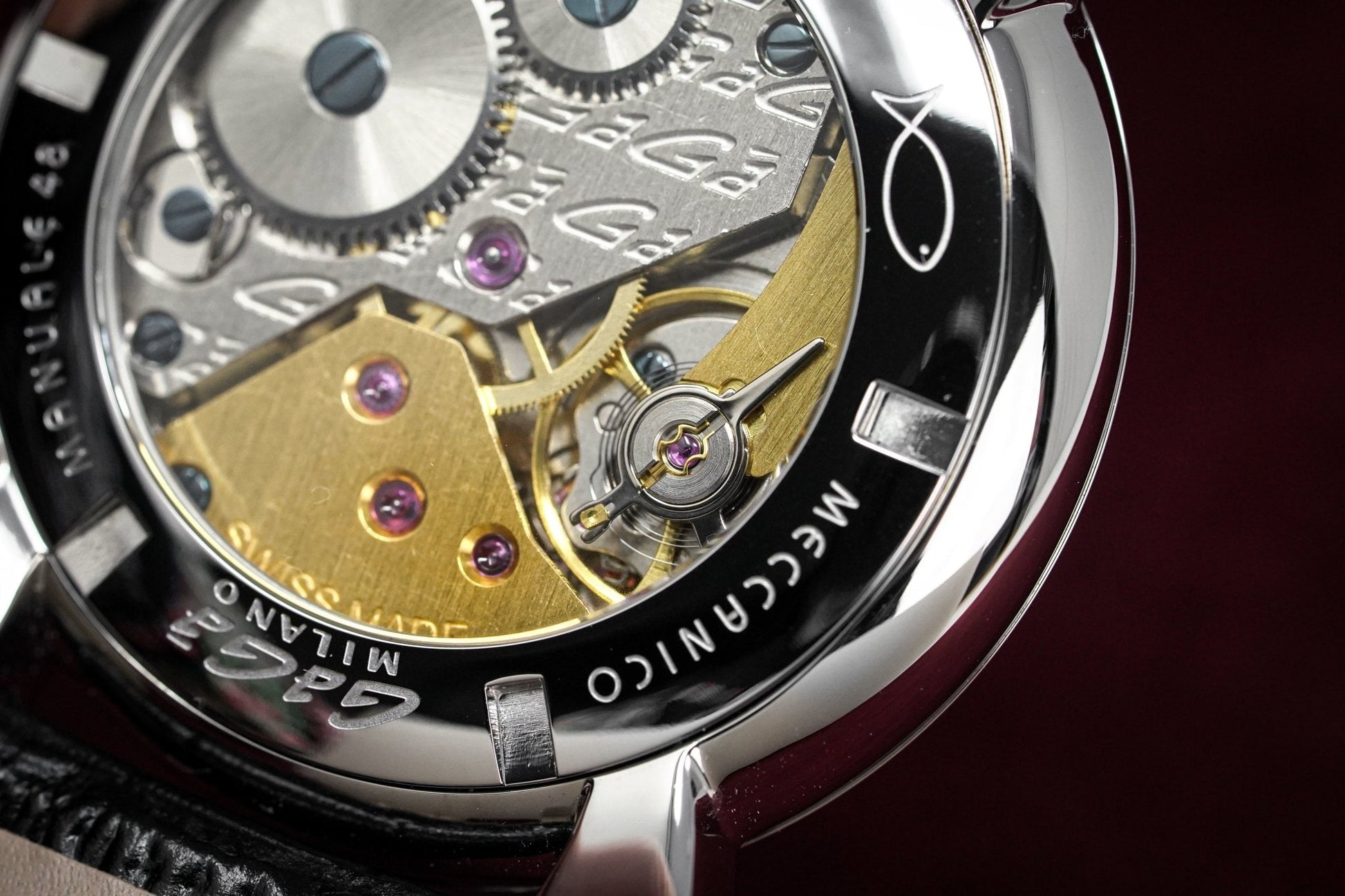 Swiss Made Mechanical, Hand Wound, GaGà 6497 Movement with a power reserve of 36 Hours - 21,600 bph - 21 Jewels - Screw Down Crown at 12 O'Clock - Open Sapphire Crystal Case Back which shows off the Mainspring, the Manual Wind Mechanism and The GaGà Milano craftsmanship