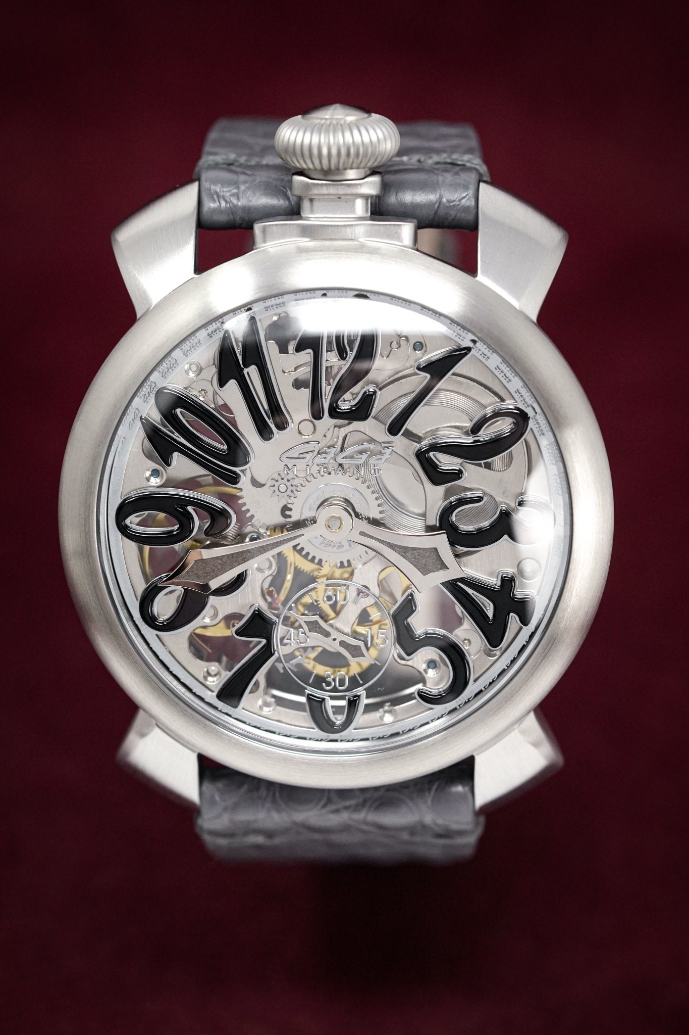 Swiss Made Mechanical, Hand Wound, GaGà 6497 Movement with a power reserve of 36 Hours - 21,600 bph - 21 Jewels - Screw Down Crown at 12 O'Clock - Open Sapphire Crystal Case Back which shows off the balance spring, the Manual Wind Mechanism and The GaGà Milano craftsmanship