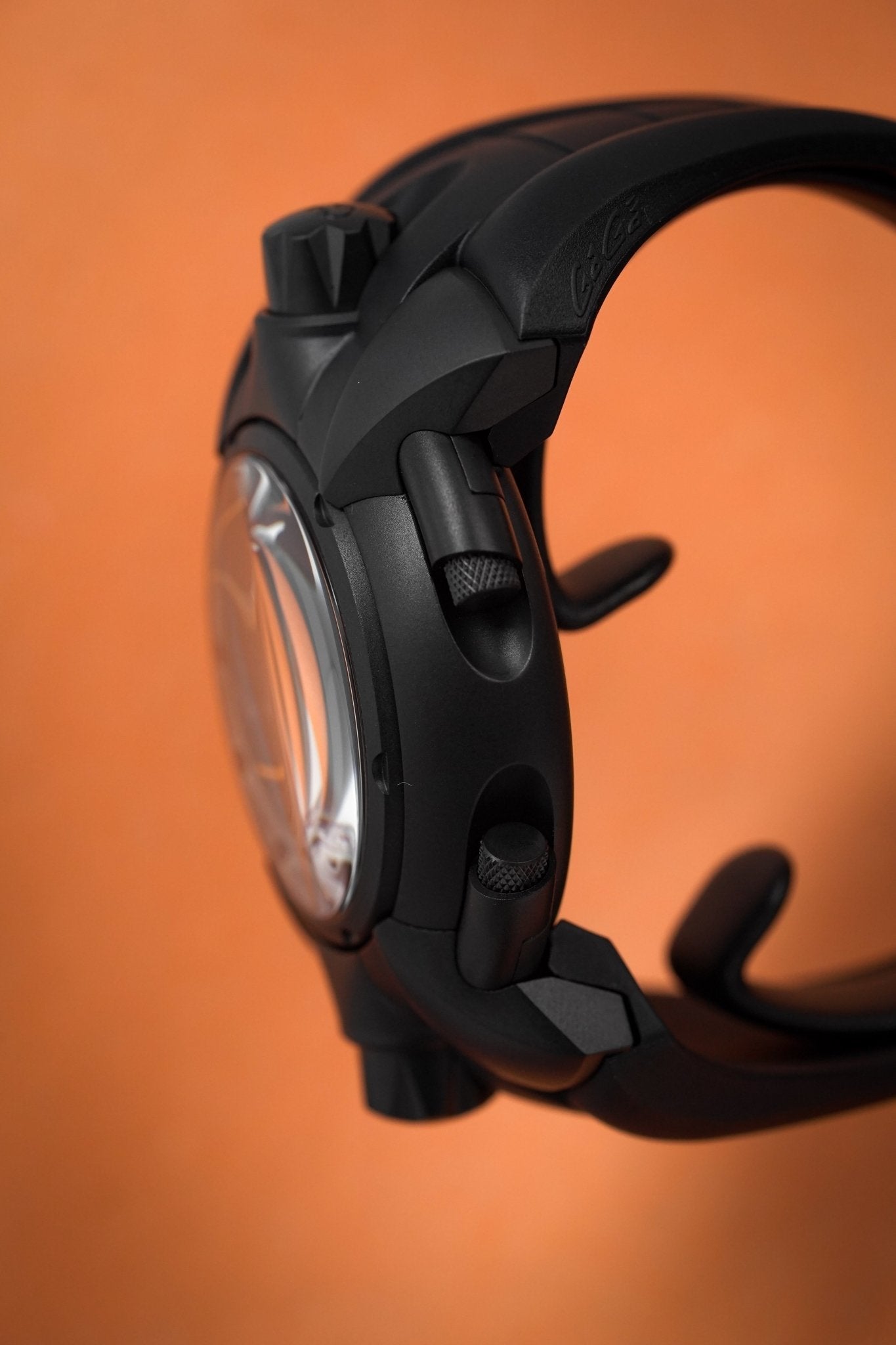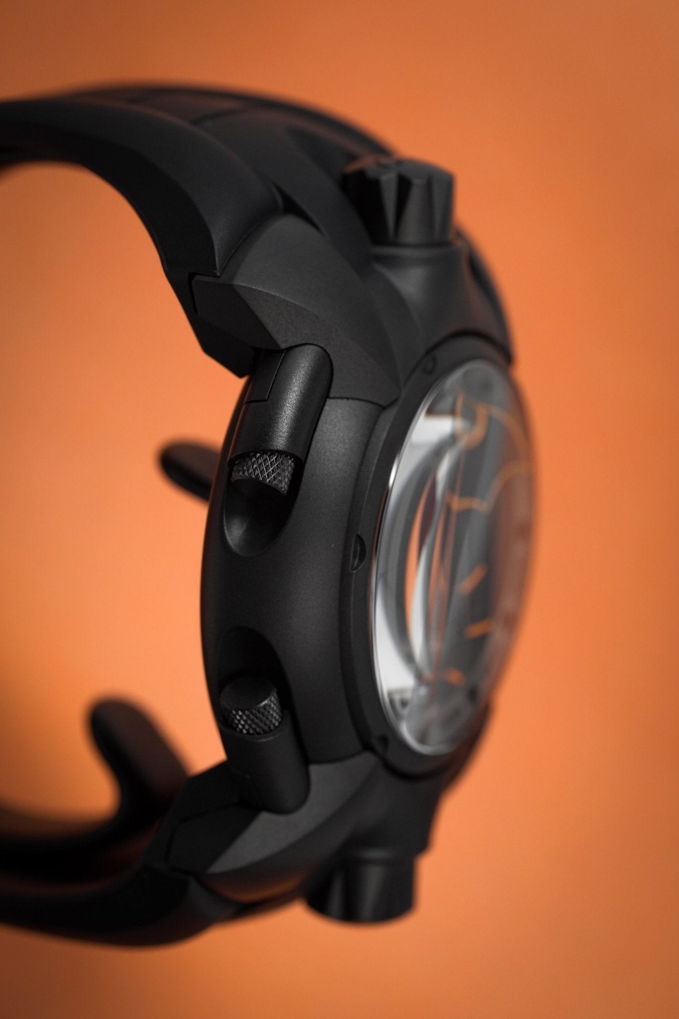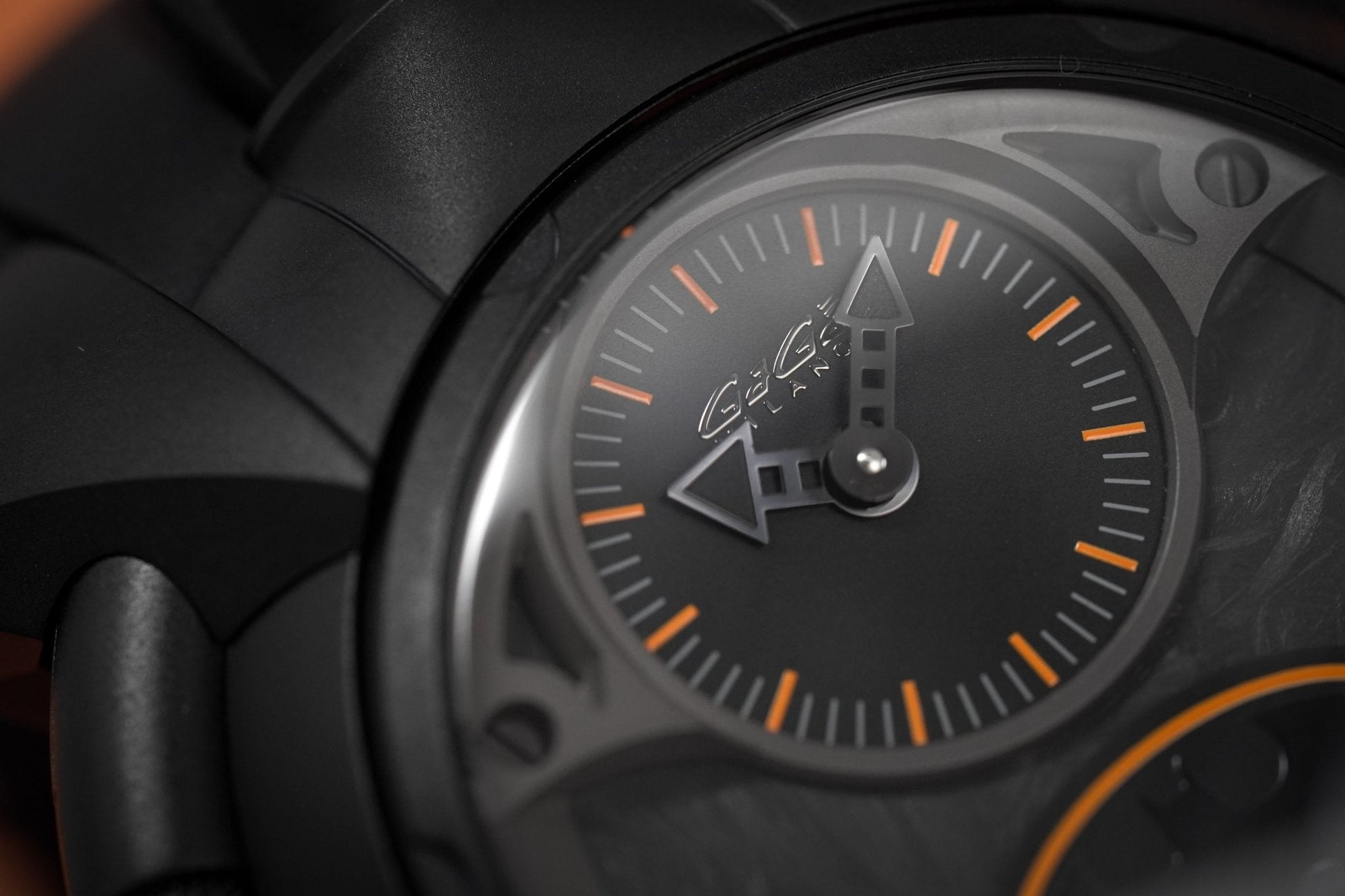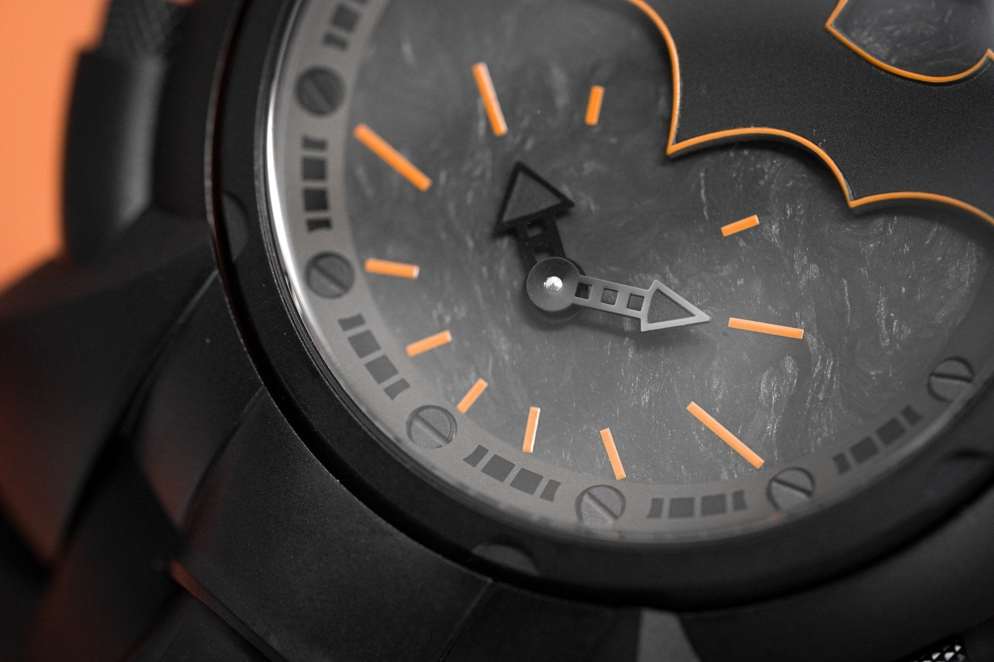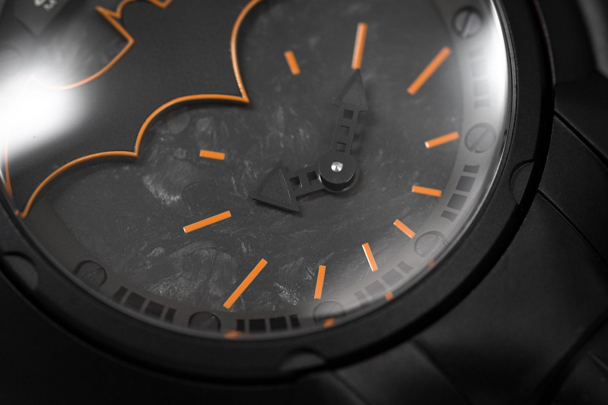 Dial 1: Back Forged Carbon Fibre Dial. Black PVD Plated Stainless Steel Hands. Orange Hour Indexes. Matte Black Batman at 12 with Orange Pinstripes.