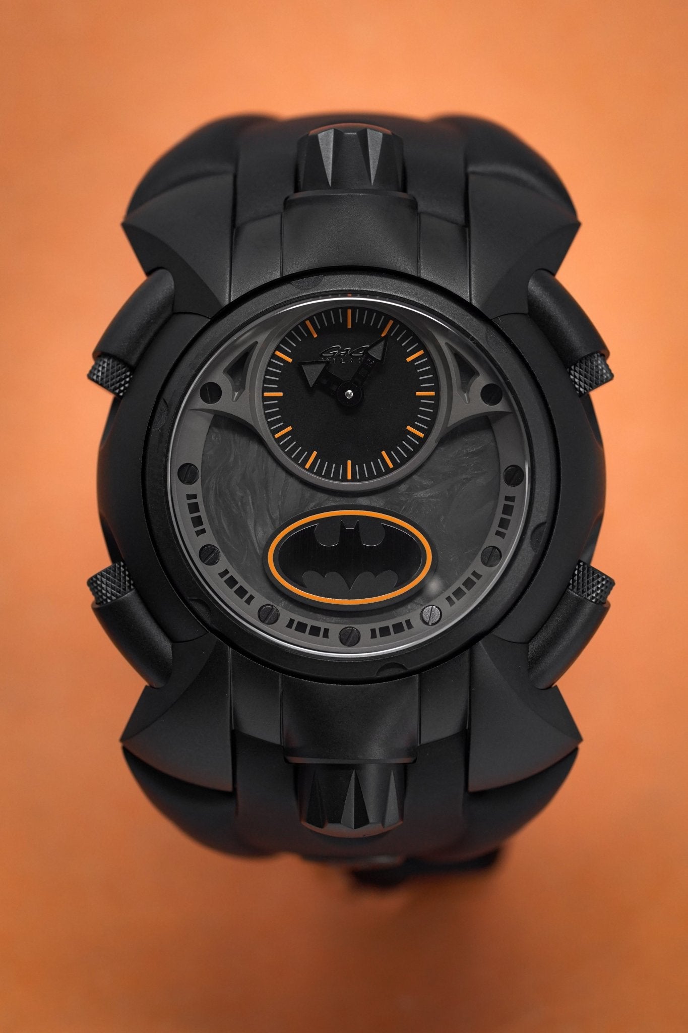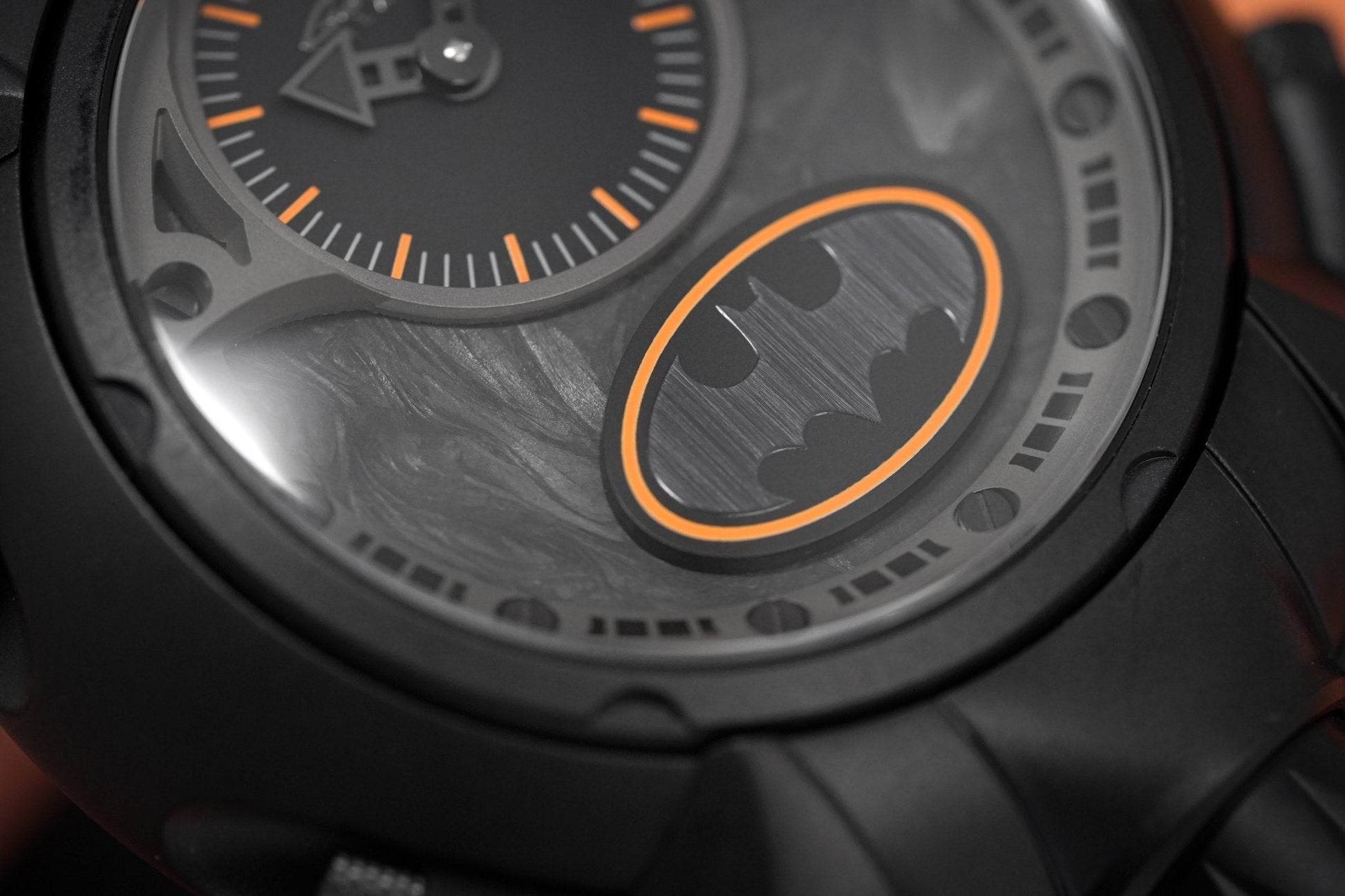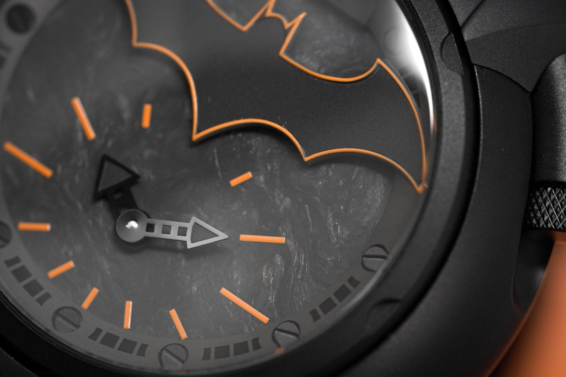 Dial 2: Back Forged Carbon Fibre Dial. Black PVD Plated Stainless Steel Hands. Orange Hour Indexes and White Subindexes. Matte Black Oval with Batman Logo at 12 with Orange Pinstripes.