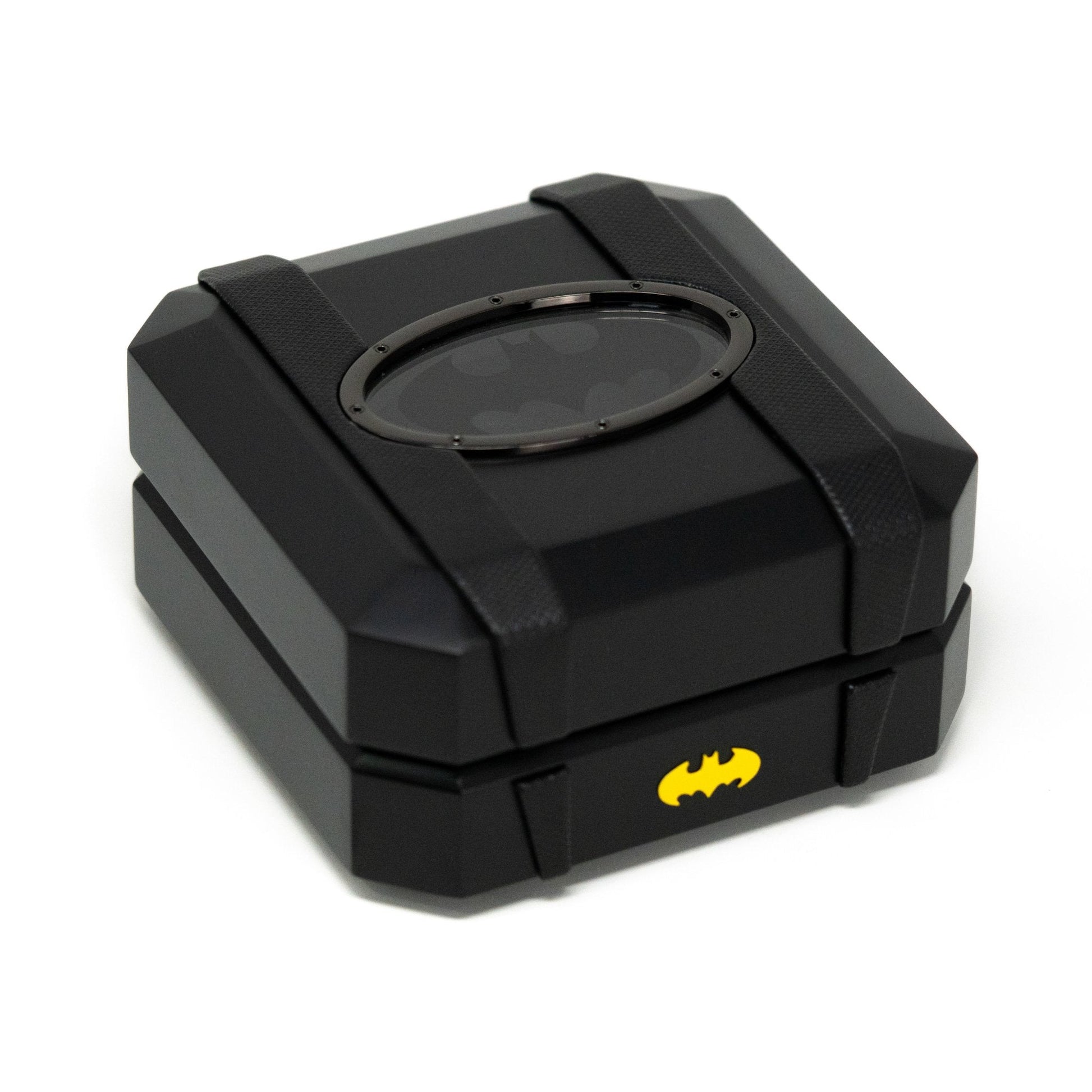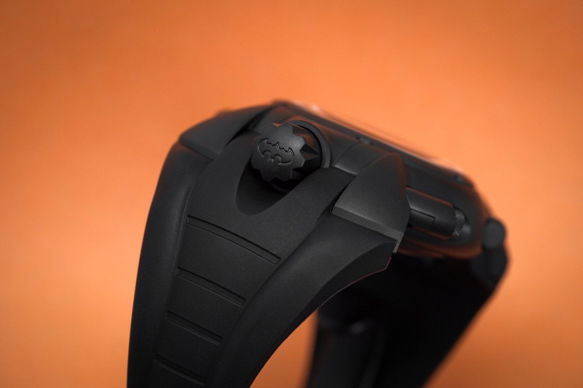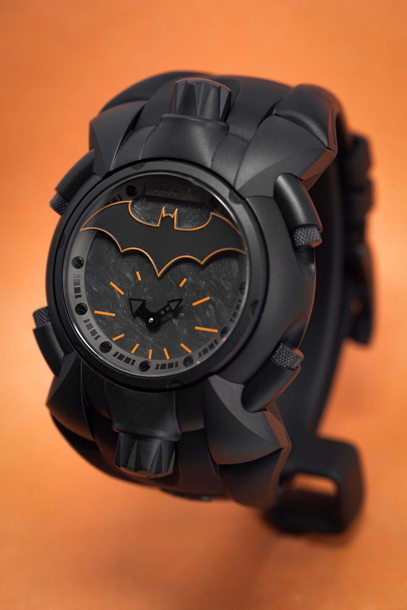 Dial 2: Back Forged Carbon Fibre Dial. Black PVD Plated Stainless Steel Hands. Orange Hour Indexes and White Subindexes. Matte Black Oval with Batman Logo at 12 with Orange Pinstripes.