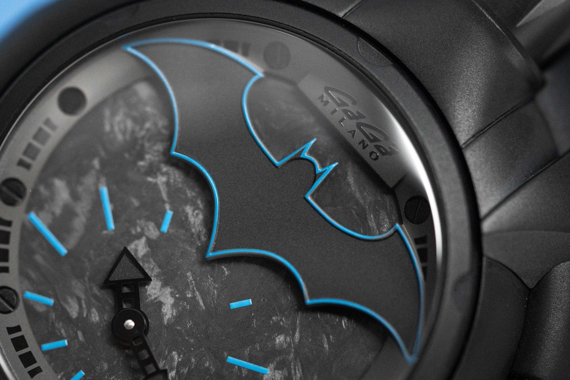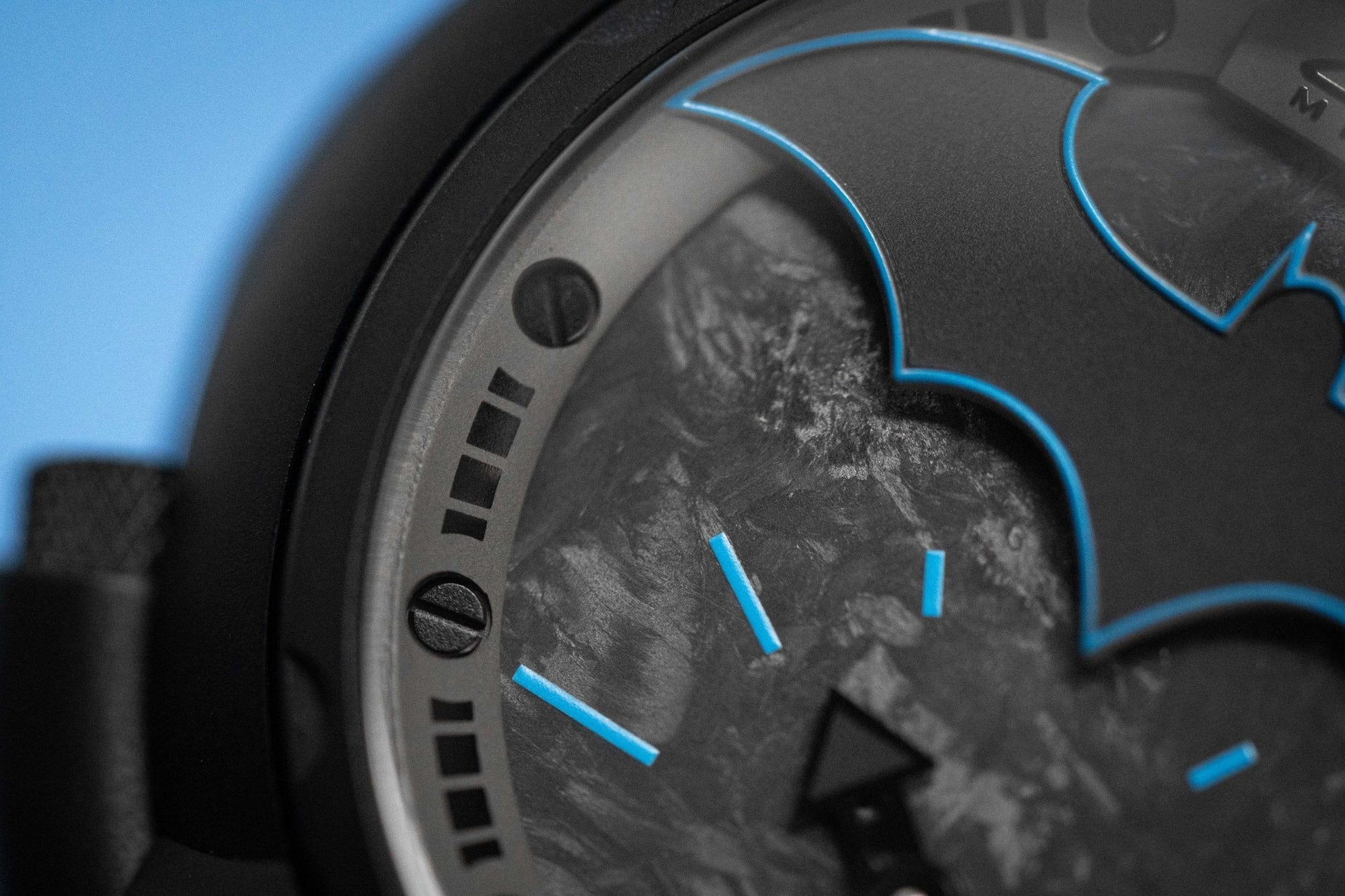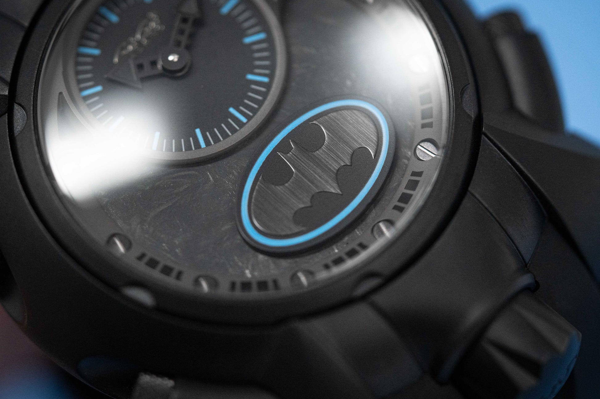 Dial 2: Back Forged Carbon Fibre Dial. Black PVD Plated Stainless Steel Hands. Blue Hour Indexes and White Subindexes. Matte Black Oval with Batman Logo at 12 with Blue Pinstripes.