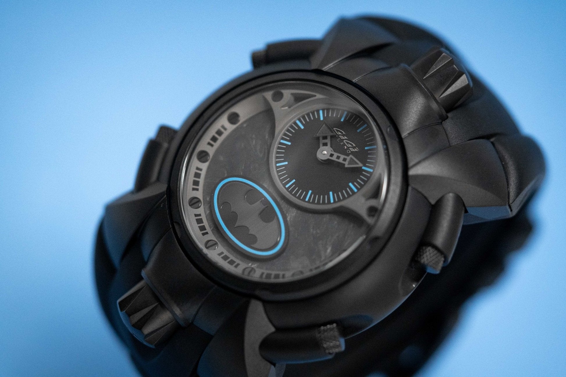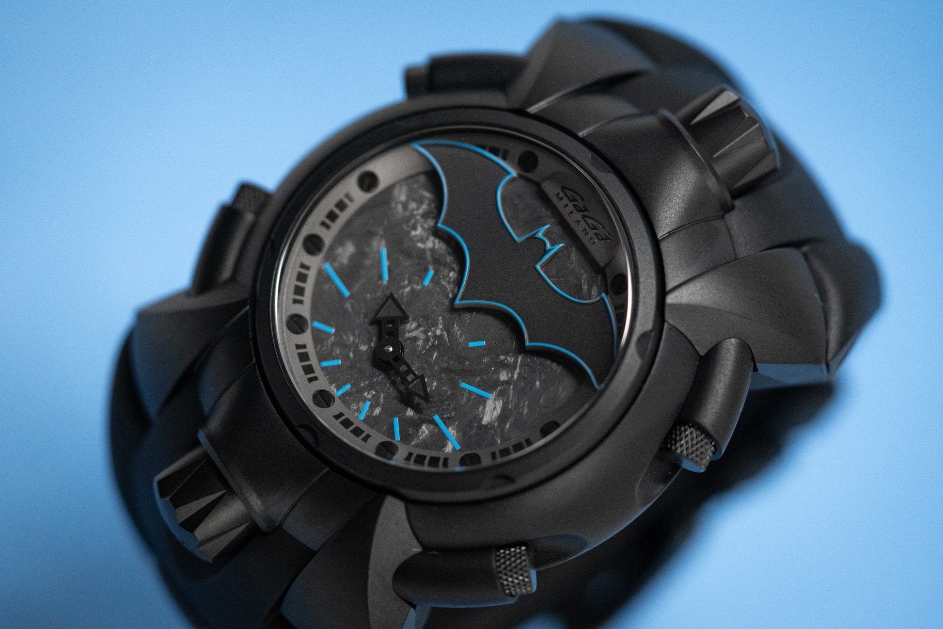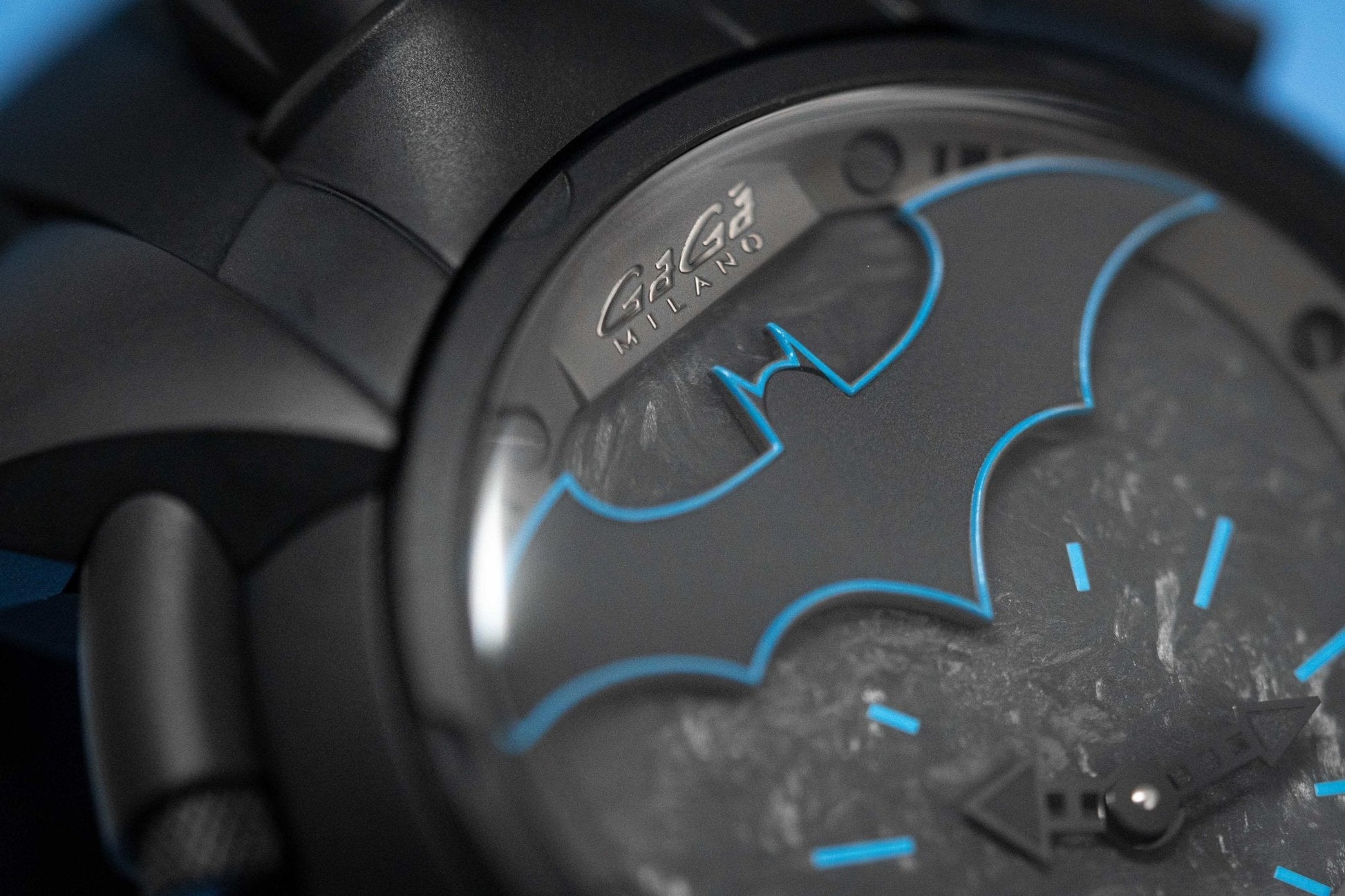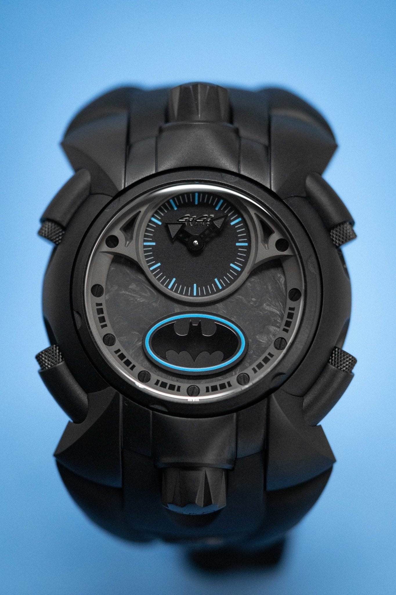 Dial 2: Back Forged Carbon Fibre Dial. Black PVD Plated Stainless Steel Hands. Blue Hour Indexes and White Subindexes. Matte Black Oval with Batman Logo at 12 with Blue Pinstripes.