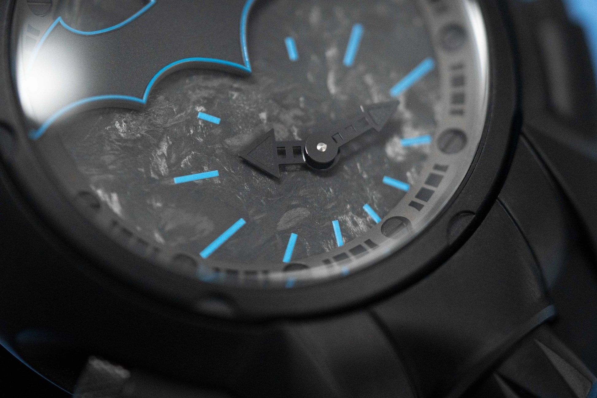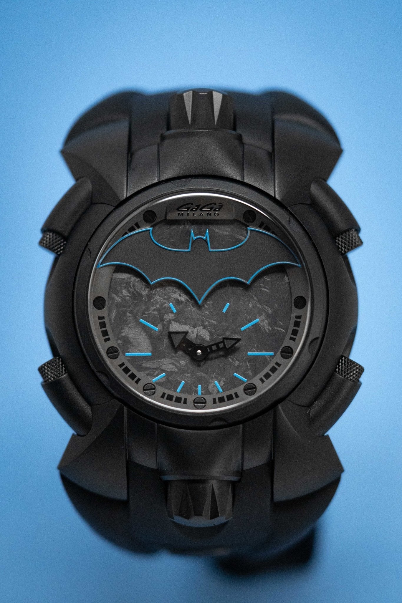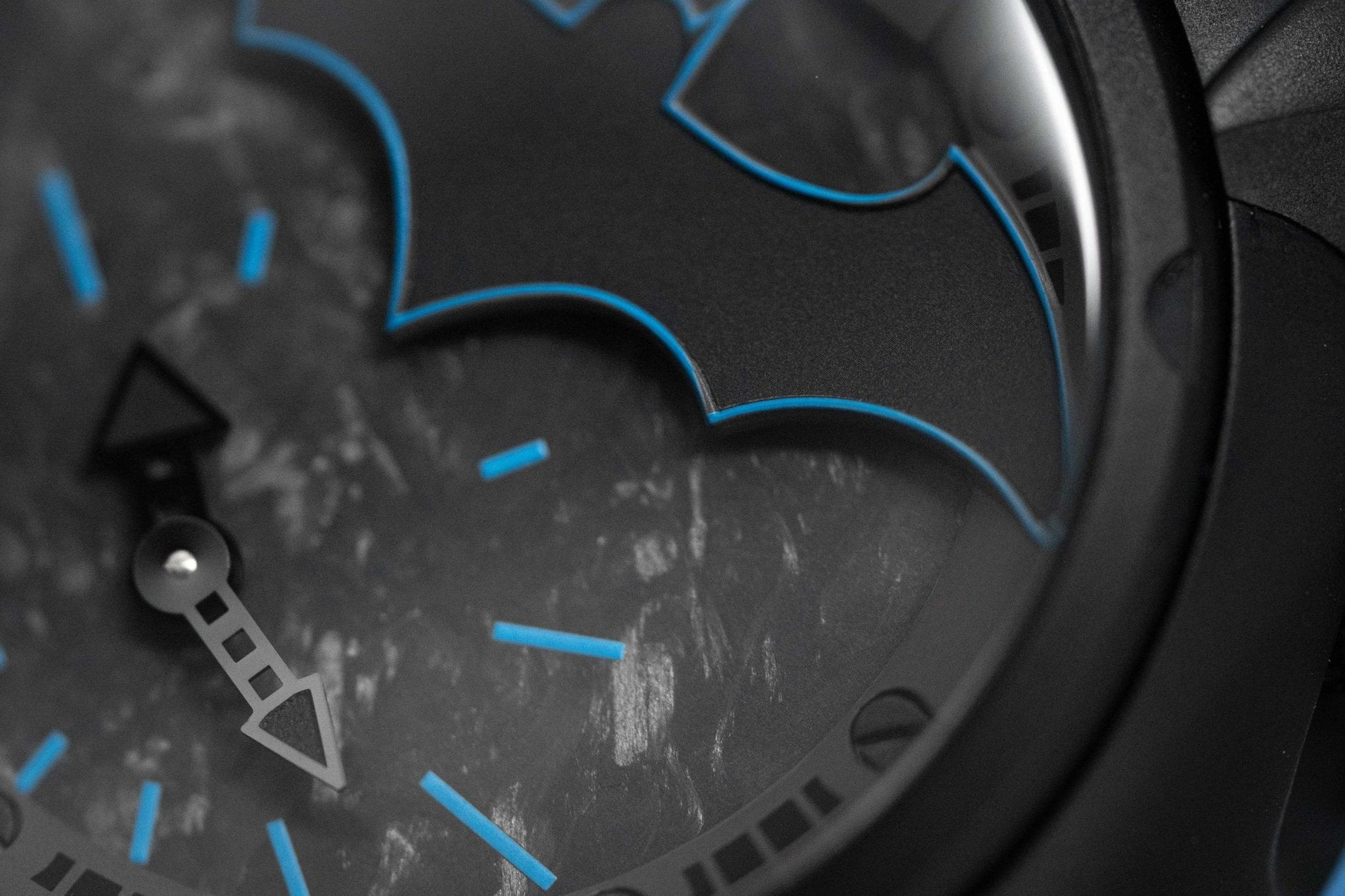 Dial 1: Back Forged Carbon Fibre Dial. Black PVD Plated Stainless Steel Hands. Blue Hour Indexes. Matte Black Batman at 12 with Blue Pinstripes.