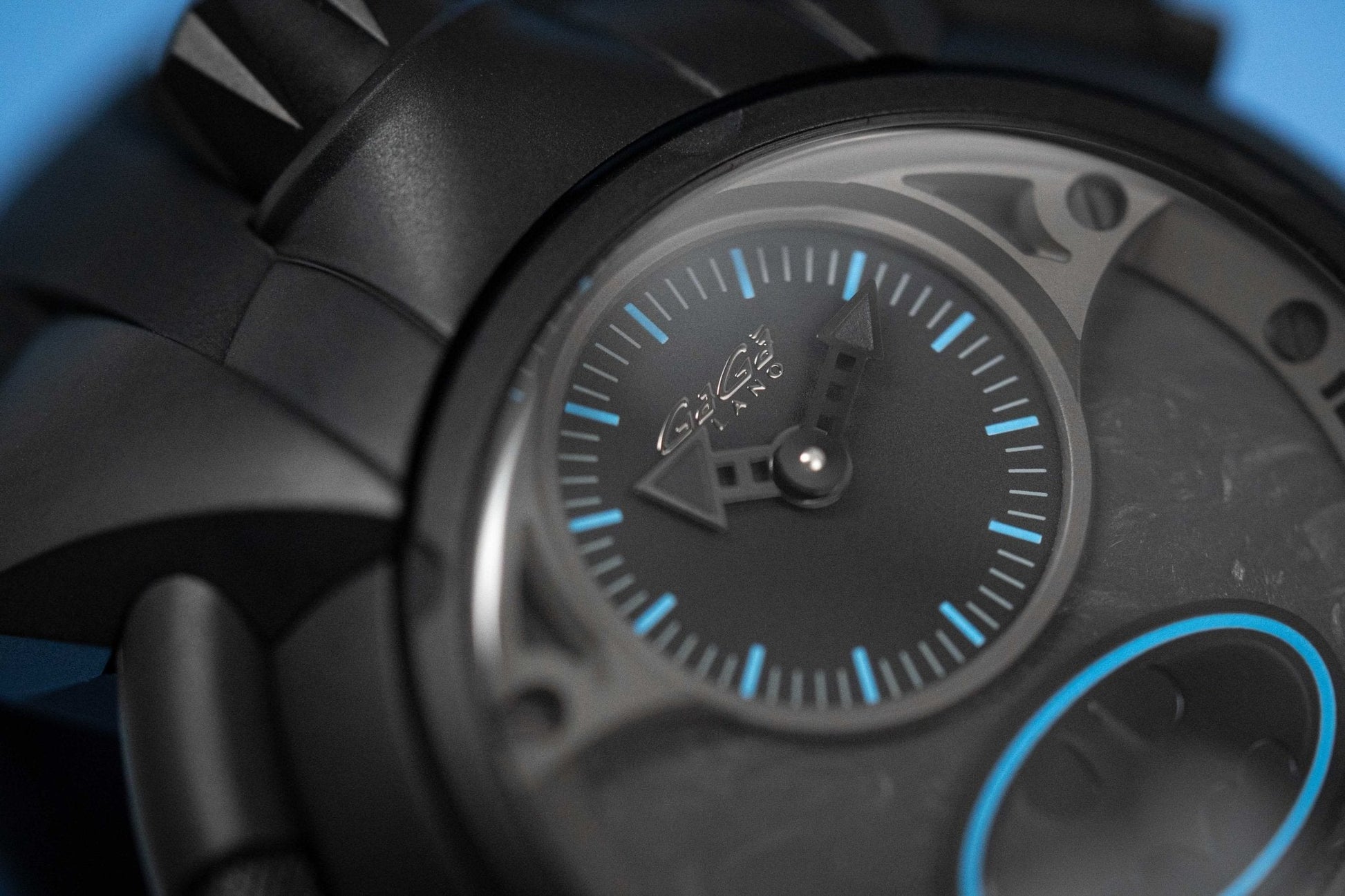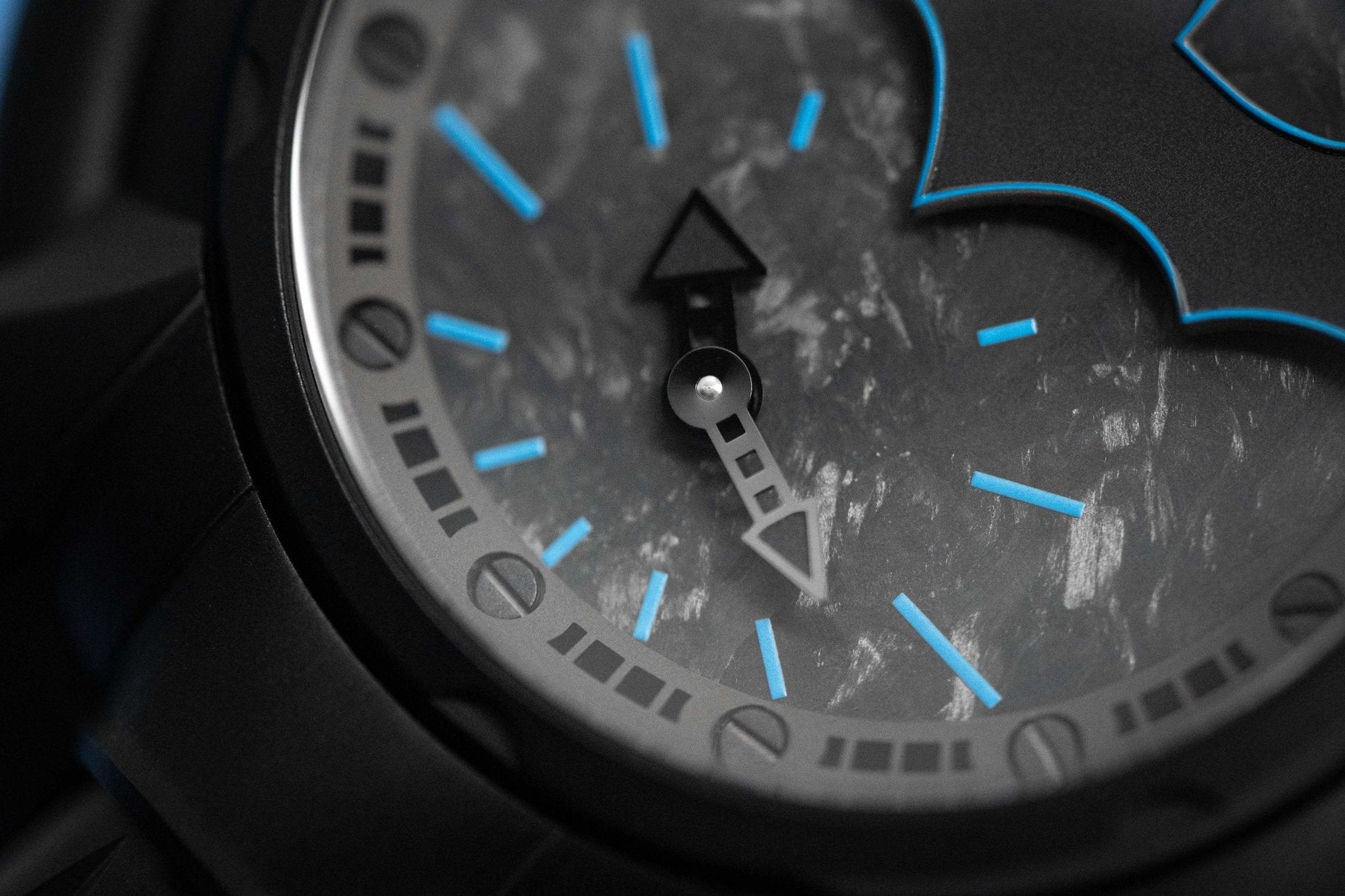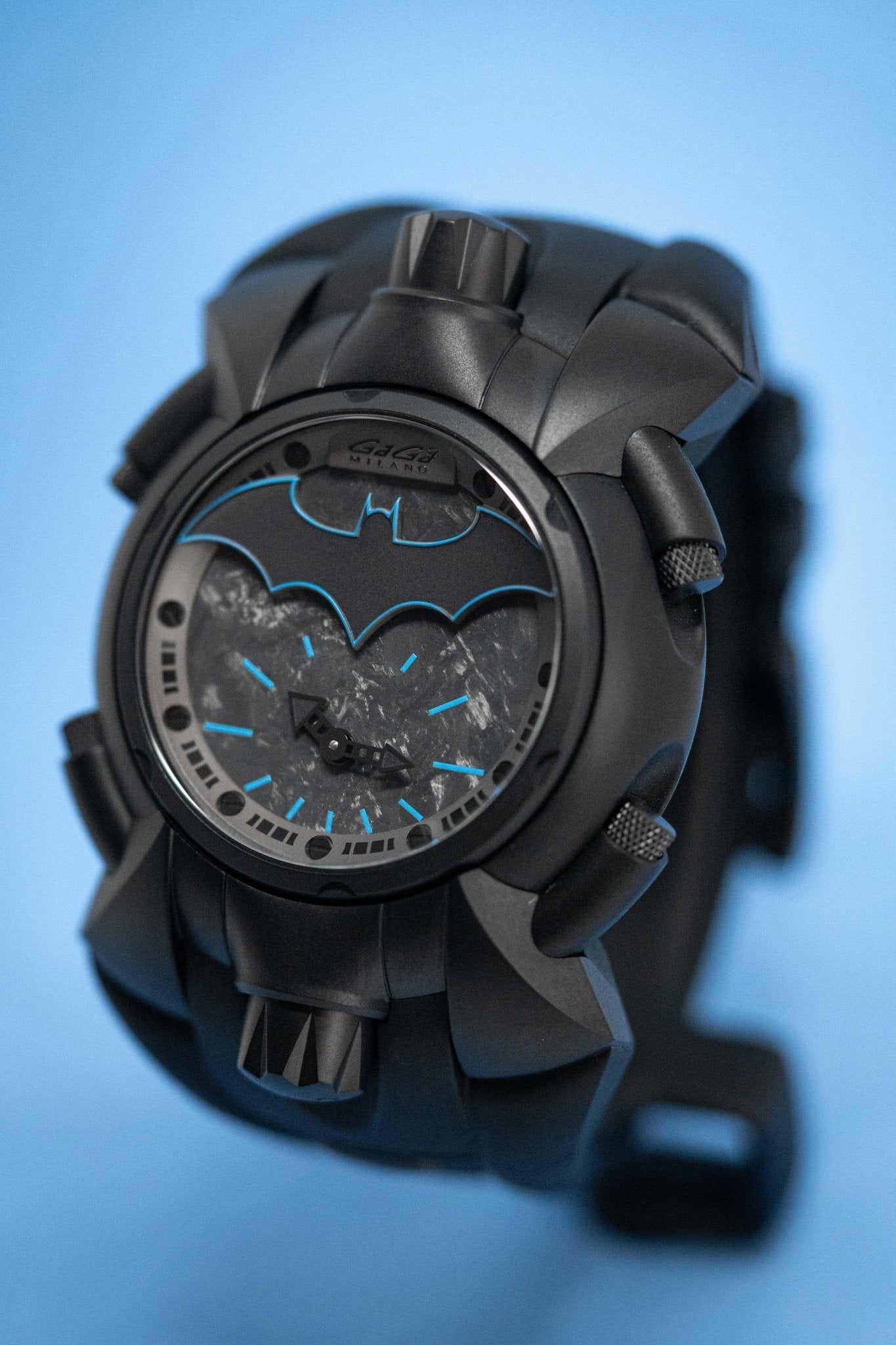 Dial 1: Back Forged Carbon Fibre Dial. Black PVD Plated Stainless Steel Hands. Blue Hour Indexes. Matte Black Batman at 12 with Blue Pinstripes.