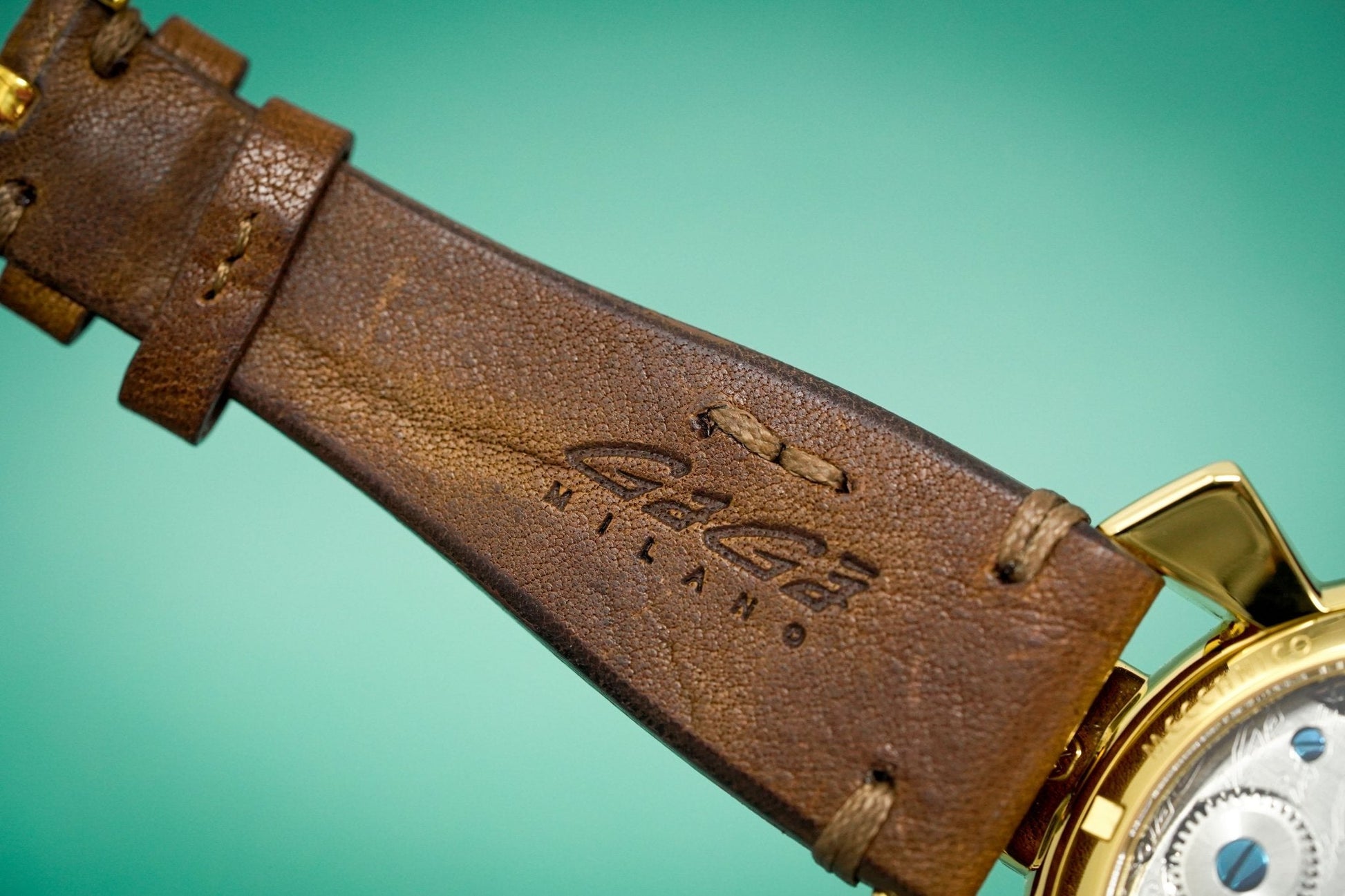 Screw Down Crown at 12 O'Clock - Open Sapphire Crystal Case Back which shows off the balance spring, the Manual Wind Mechanism and The GaGà Milano craftsmanship