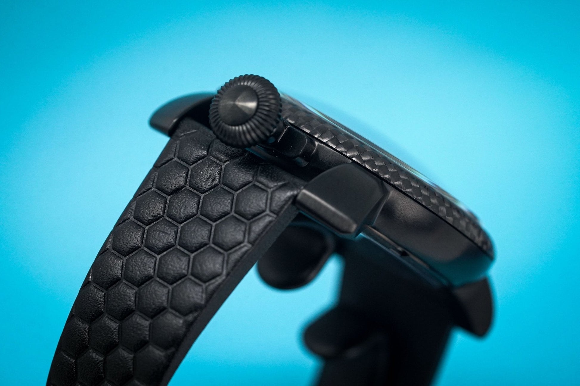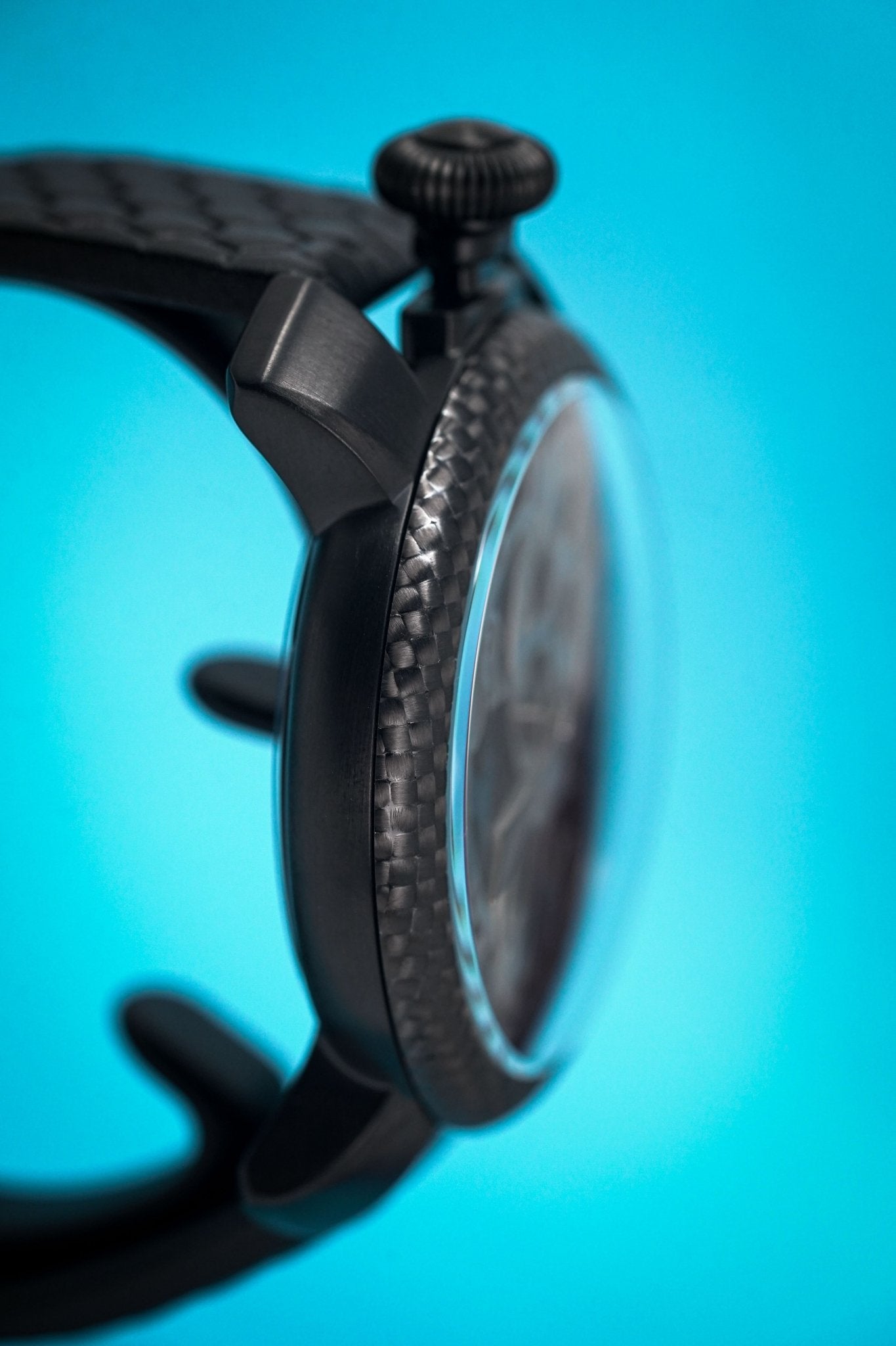 48 mm x 16 mm Black PVD 316L Stainless Steel Case, Convex shaped mineral glass with scratch resistant treatment, Black Carbon Fibre Bezel