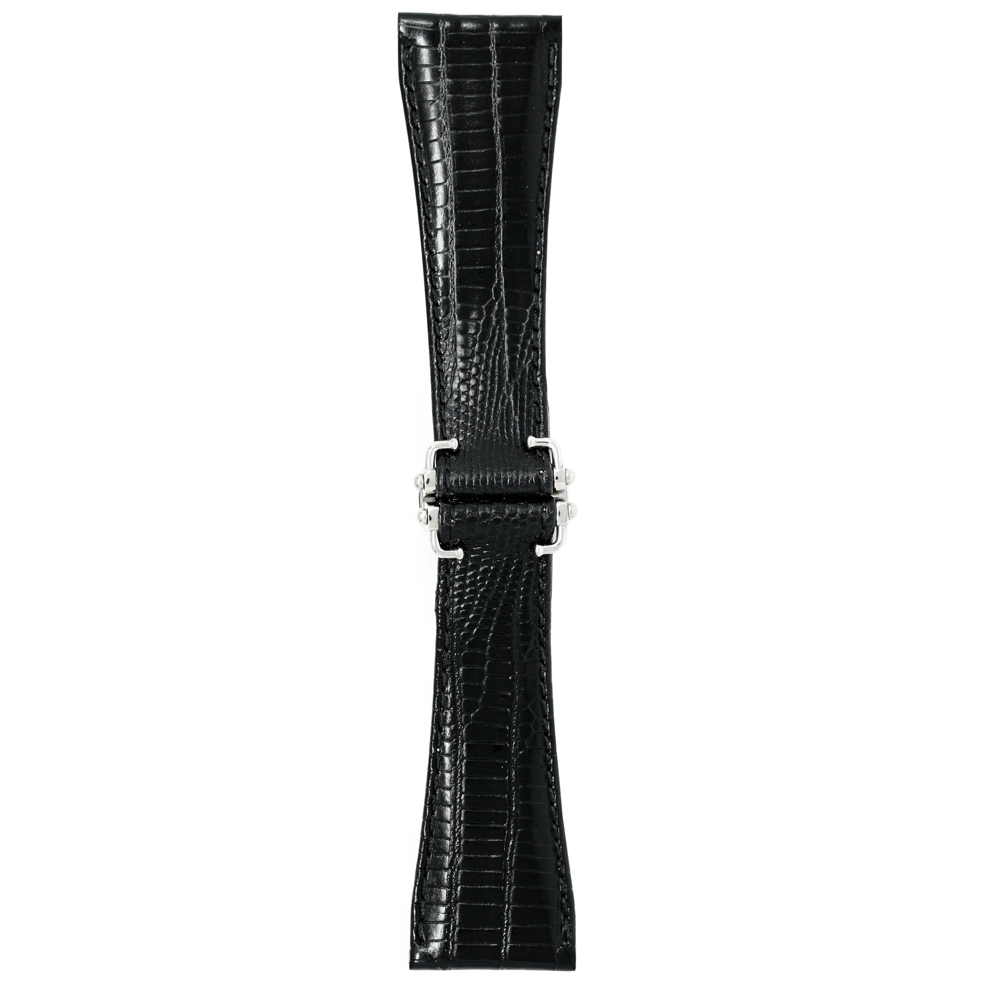 23/16mm width x 19cm Length Black Lizard Handmade in Italy Leather Strap with Green Stitchings - Fitted With a Stainless Steel Push Button Butterfly Clasp.