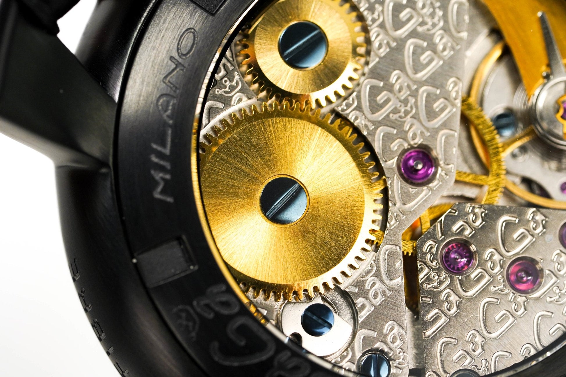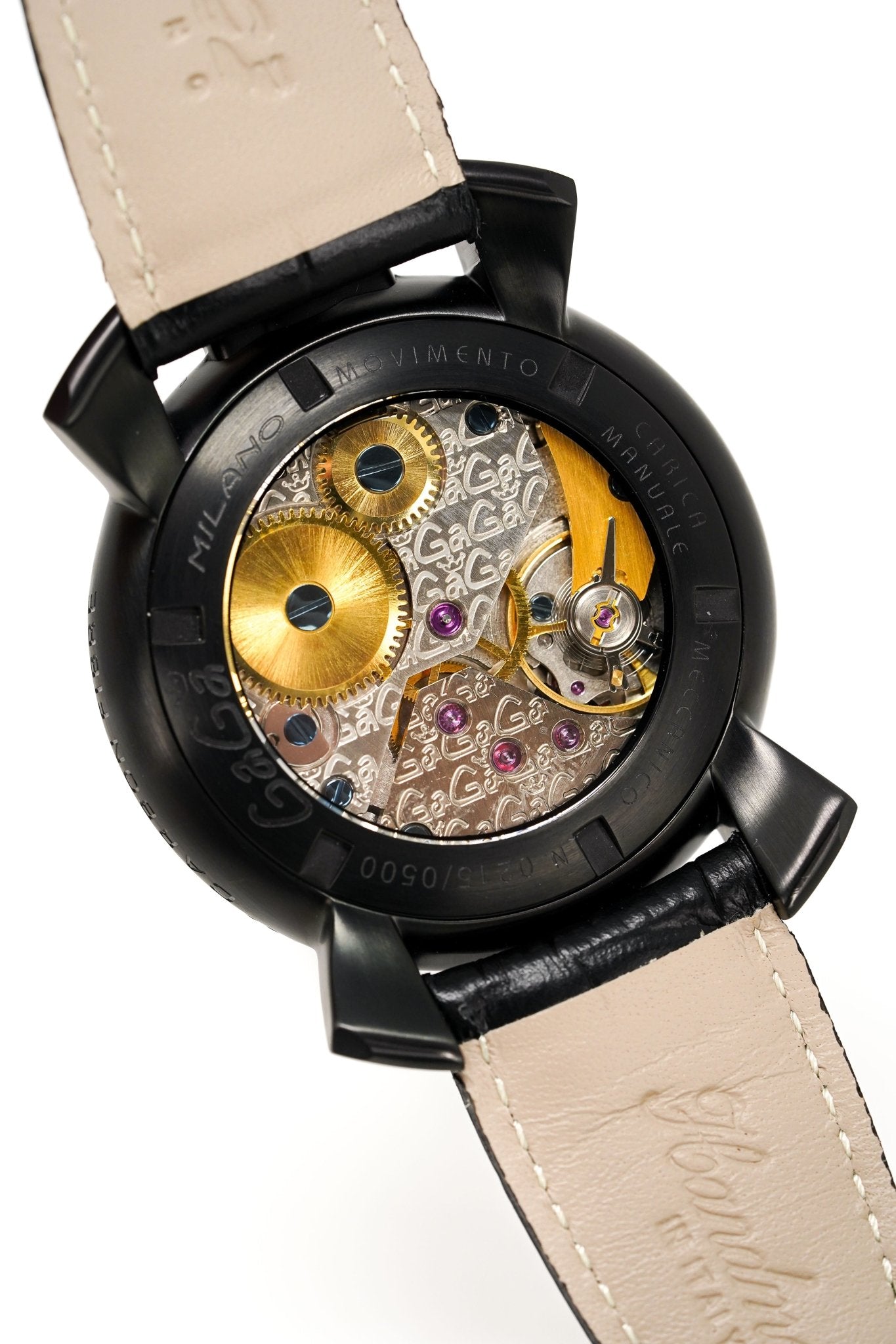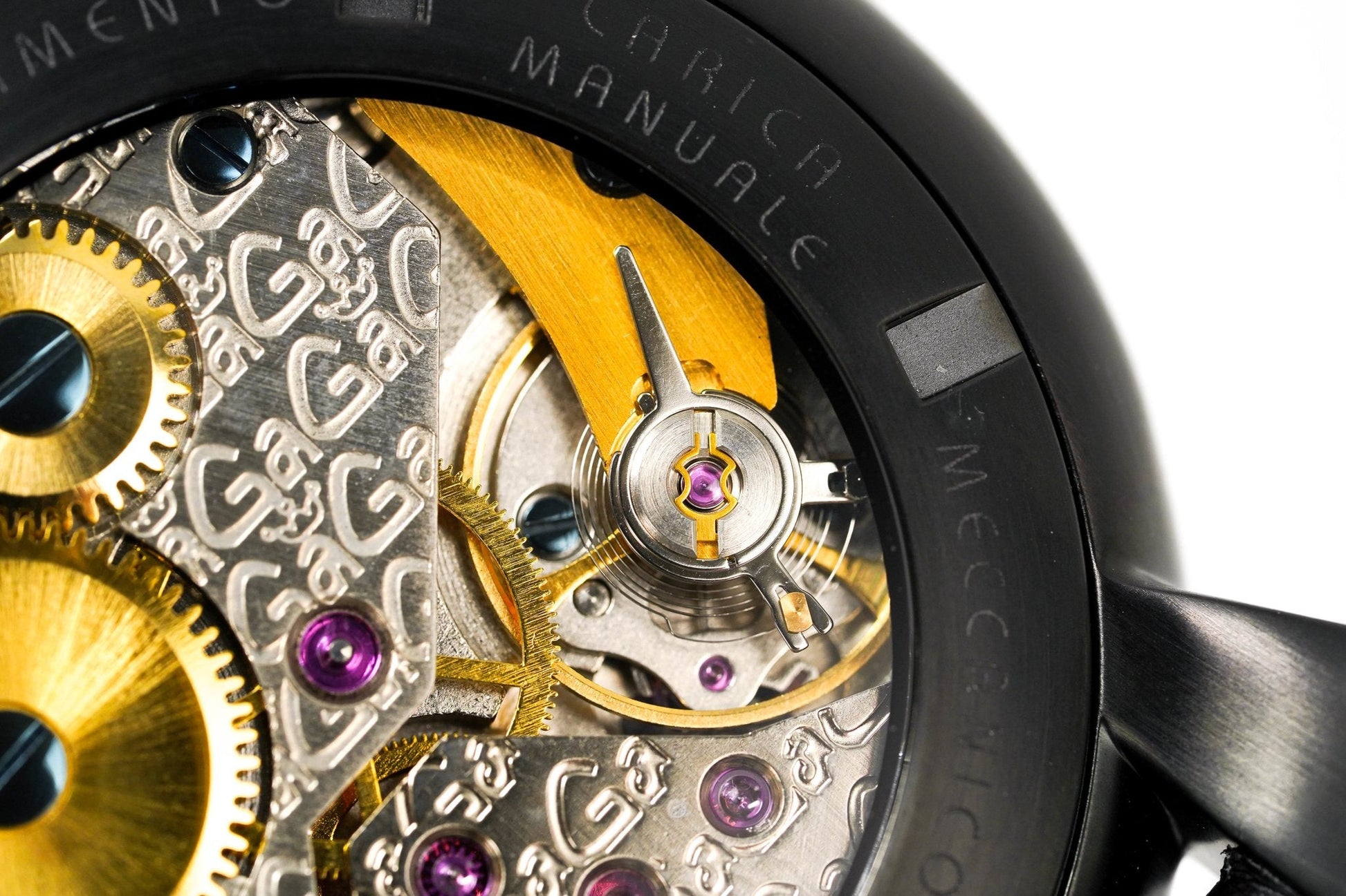 48mm x 16mm Black PVD 316L Stainless Steel Case - Black Carbon Fibre Bezel - Sapphire Crystal - Exhibition Caseback which Shows off the Balance Spring, the Wind Mechanism, and The GaGà Milano craftsmanship - Push-Pull Crown.
