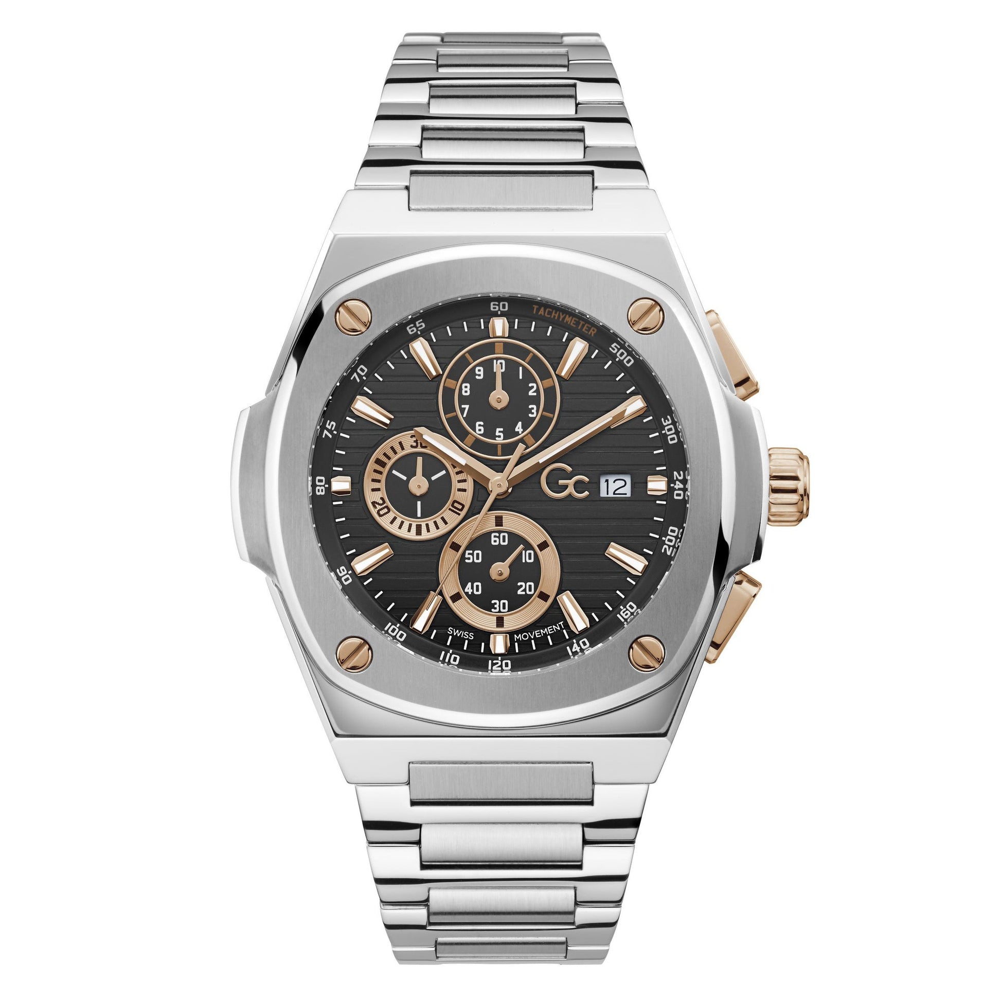 Bold styling and strong character for the Gent version of the Gc coussin shape.With its 44mm case and highly detailed black square pattern dial, this chronograph offers a look of premium horological mastery.The screw design details on the bezel all in harmony with the rose gold accents on the dial are made for the fashion-conscious man of today