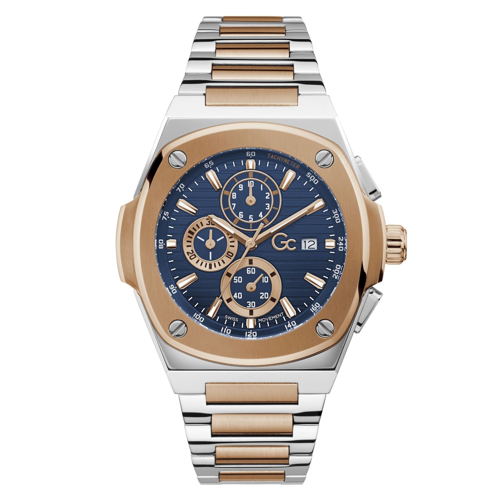 Bold styling and strong character for the Gent version of the Gc coussin shape.With its 44mm case and highly detailed blue square pattern dial, this chronograph offers a look of premium horological mastery.The screw design details on the bezel all in harmony with the two tone rose gold & silver accents on the dial and the bracelet, are made for the fashion-conscious man of today