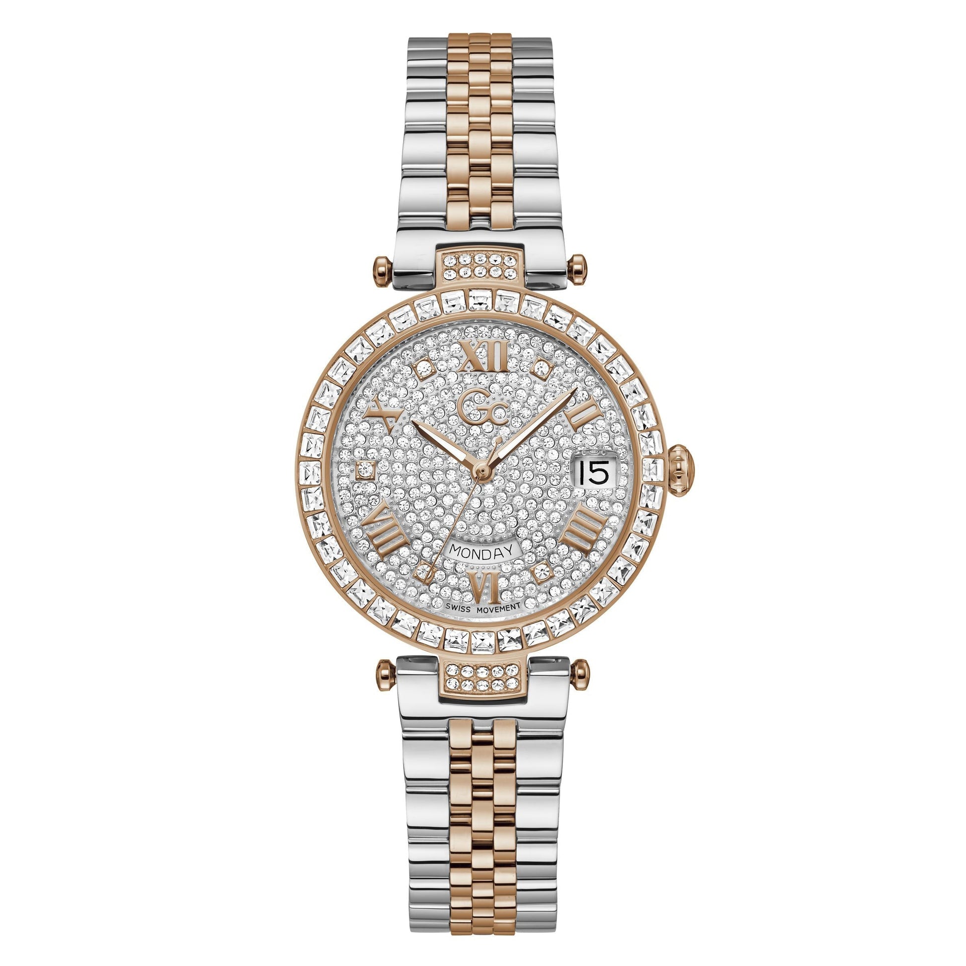 The Gc Flair (34mm) goes glamorously wild in this two-tone silver and rose gold PVD version with a sparkling full pave dial of crystals and an eye-catching set of crystals on the top ring. The day and the date are visible through the windows at 3 & 6 o'clock.
