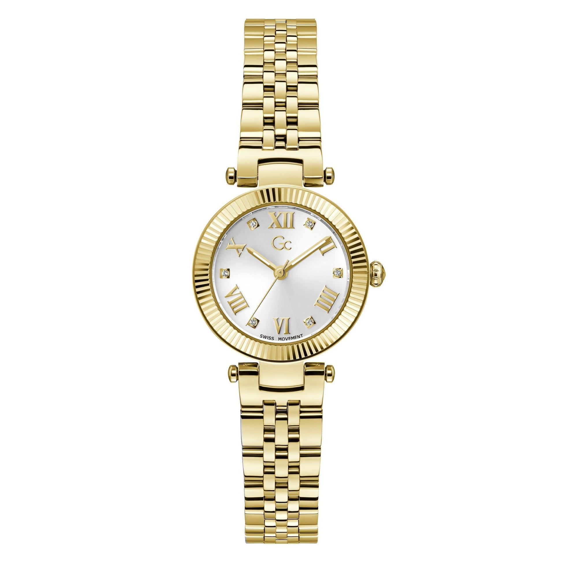 Add a touch of refinement to your everyday wardrobe with the Gc Flair petite size. It has a distinctive notched bezel and a comfortable, supple, five links bracelet and, for this yellow gold tone version, an eye-catching white sunray dial with Roman numbers and crystal indices.