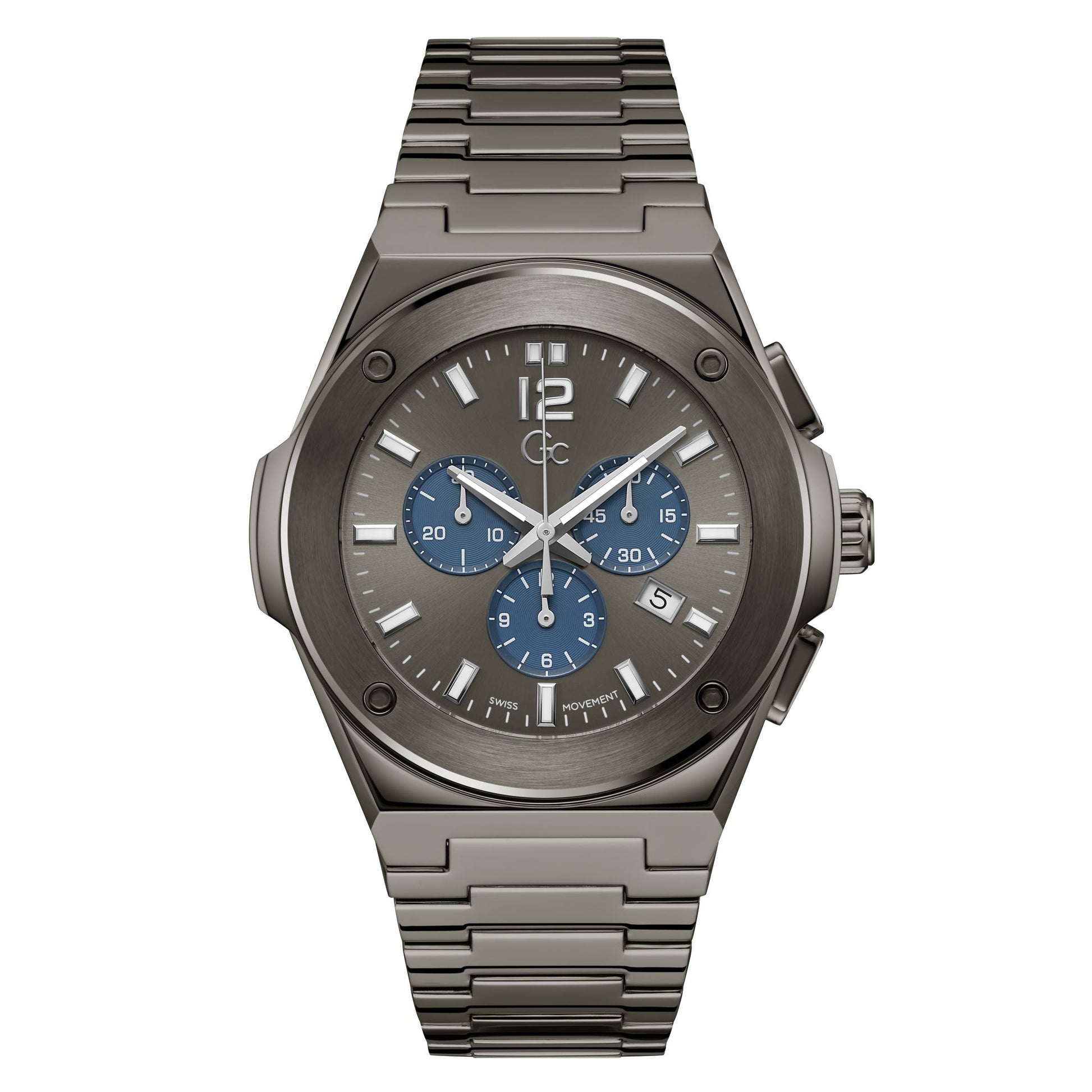 The Gc Idol hosts an integrated 44mm case with detailed top ring, contrasted dial, chronograph movement and smooth bracelet in full gunmetal PVD.