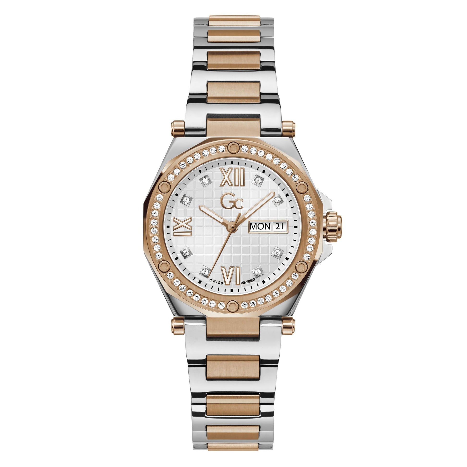 Stylish, sporty, and chic - the Gc Legacy hosts a unique 34mm case shape design with detailed top ring, patterned dial embellished with European crystals and structured H-link bracelet, here in two-tone silver and rose gold PVD with off-white di
