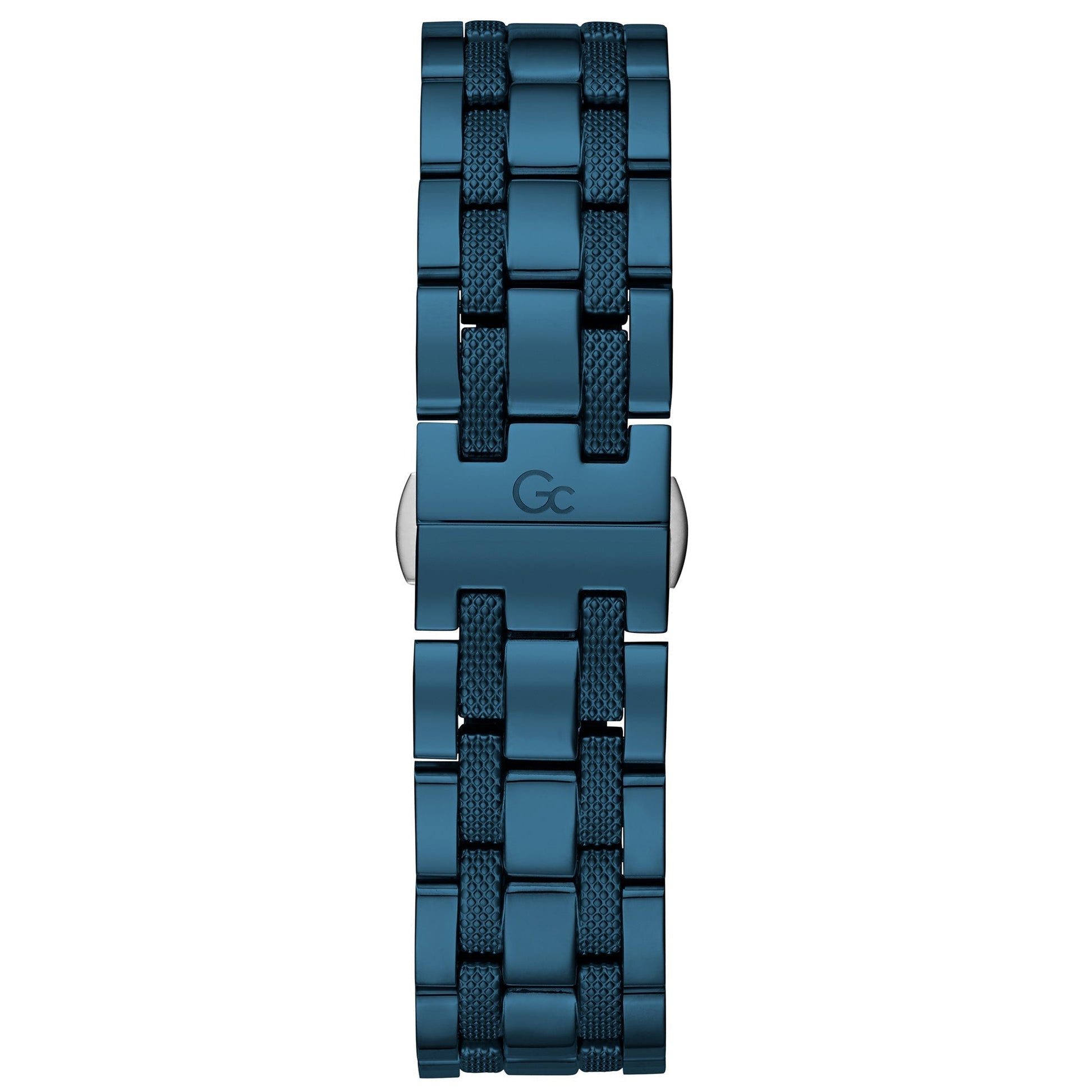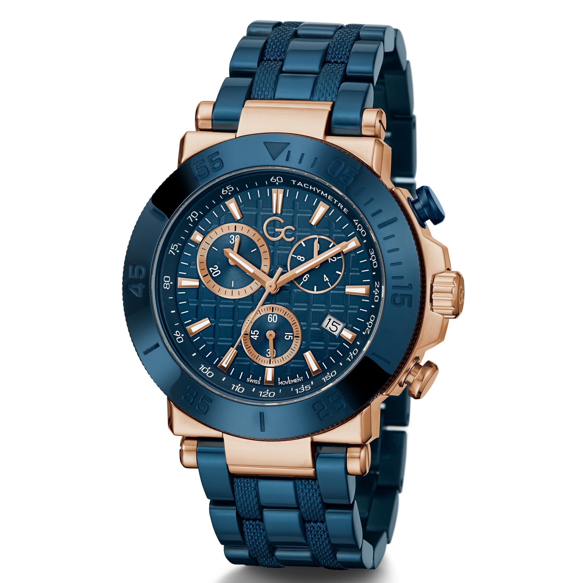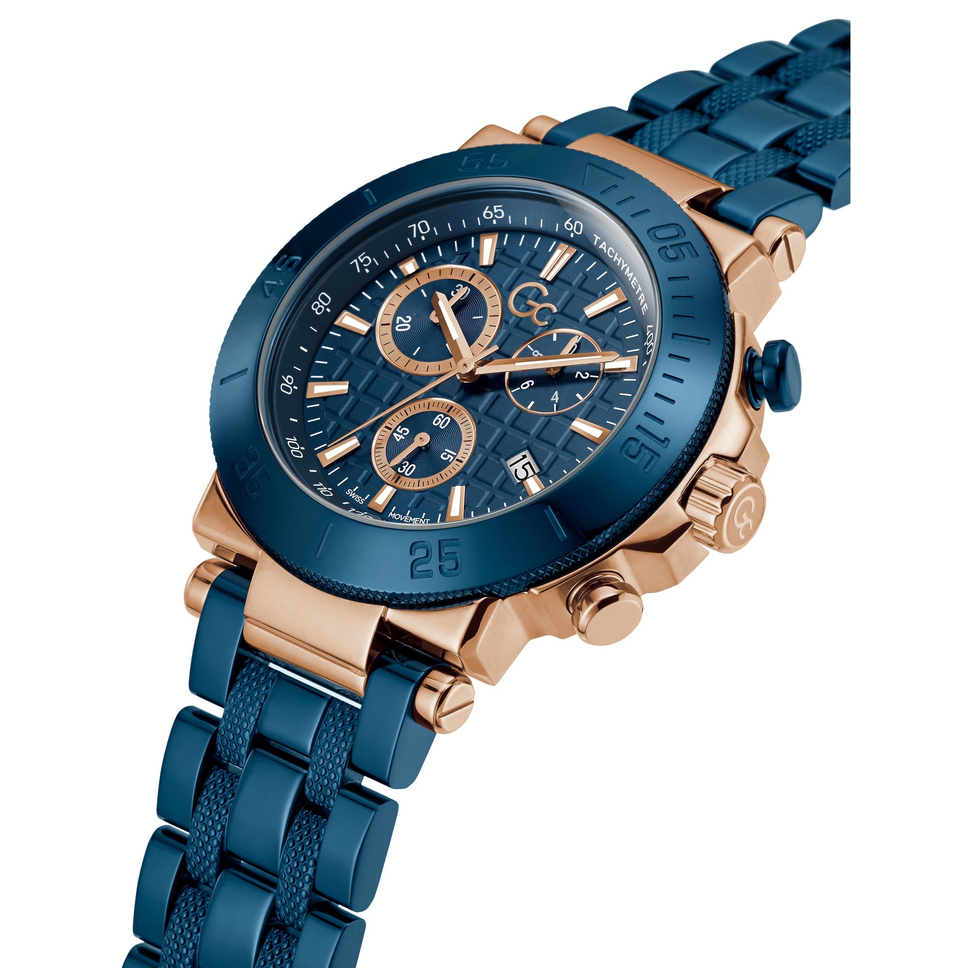 Impose yourself with this oversize modern take on the most iconic Gc chronograph, its brushed and polished rose gold tone case equipped with a blue etched bezel, matching checkered guilloche dial with tachymeter and three sub-counters, and blue metal bracelet with deployment buckle.