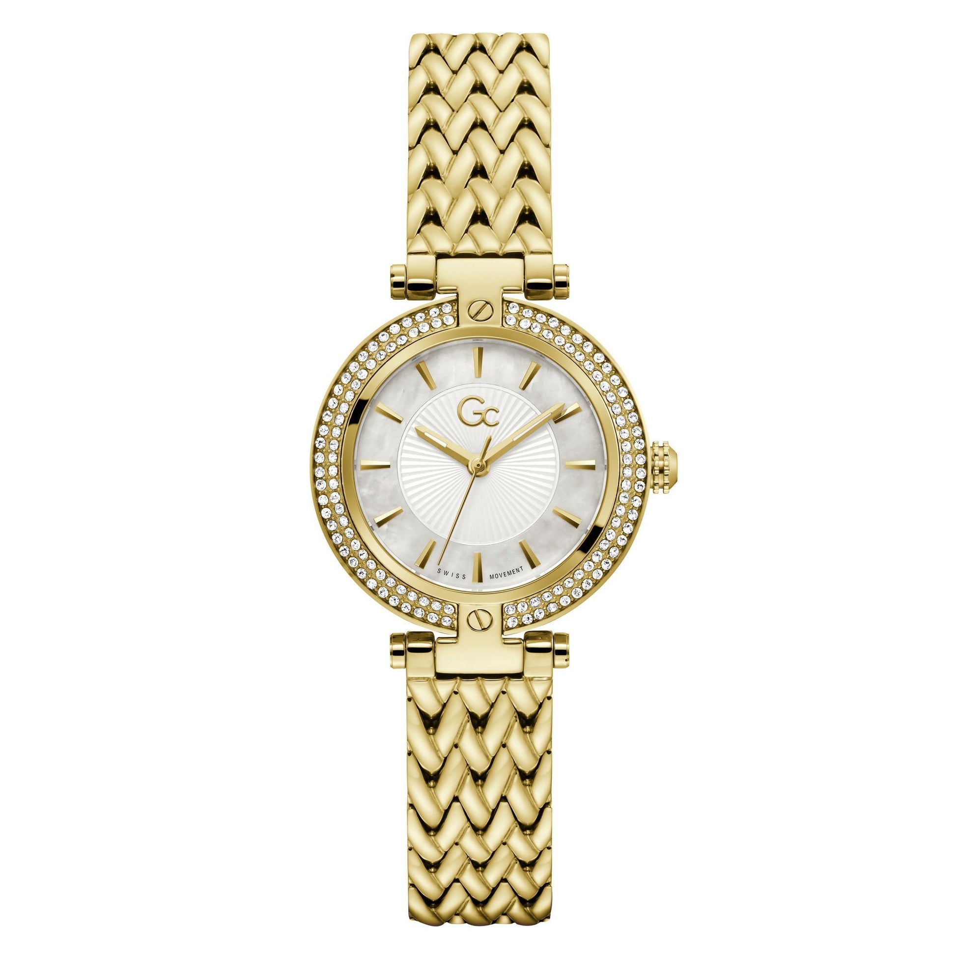 Refreshing and refined, the Gc Vogue features a 32mm case adorned with 2 rows of European crystals combined with a sophisticated bracelet, all in full yellow gold PVD, and a white mother-of-pearl dial.