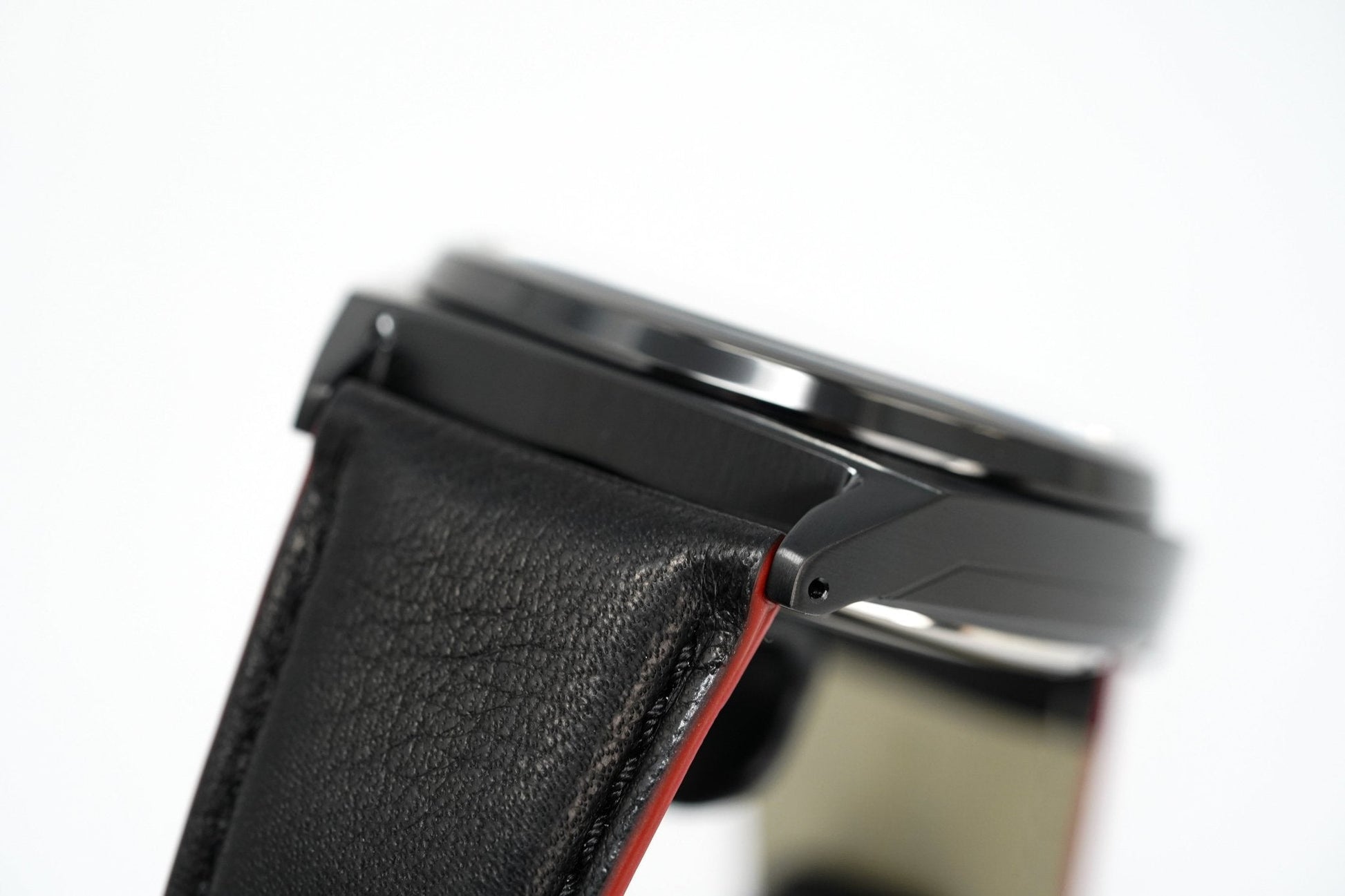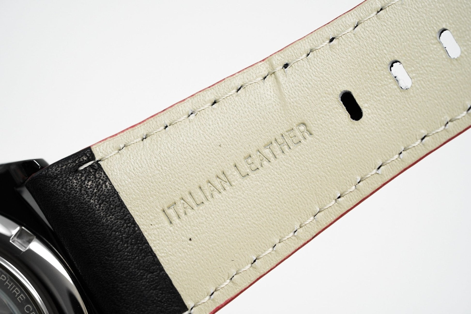 22mm x 19cm Black Italian Vegetable Tanned Leather Strap with Red Accents and a Black PVD 316L Stainless Steel Pin Buckle