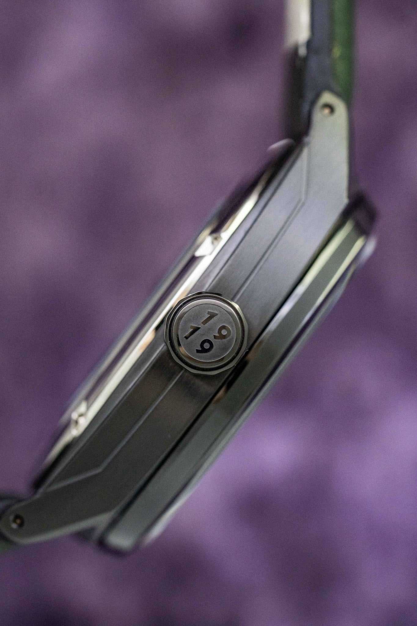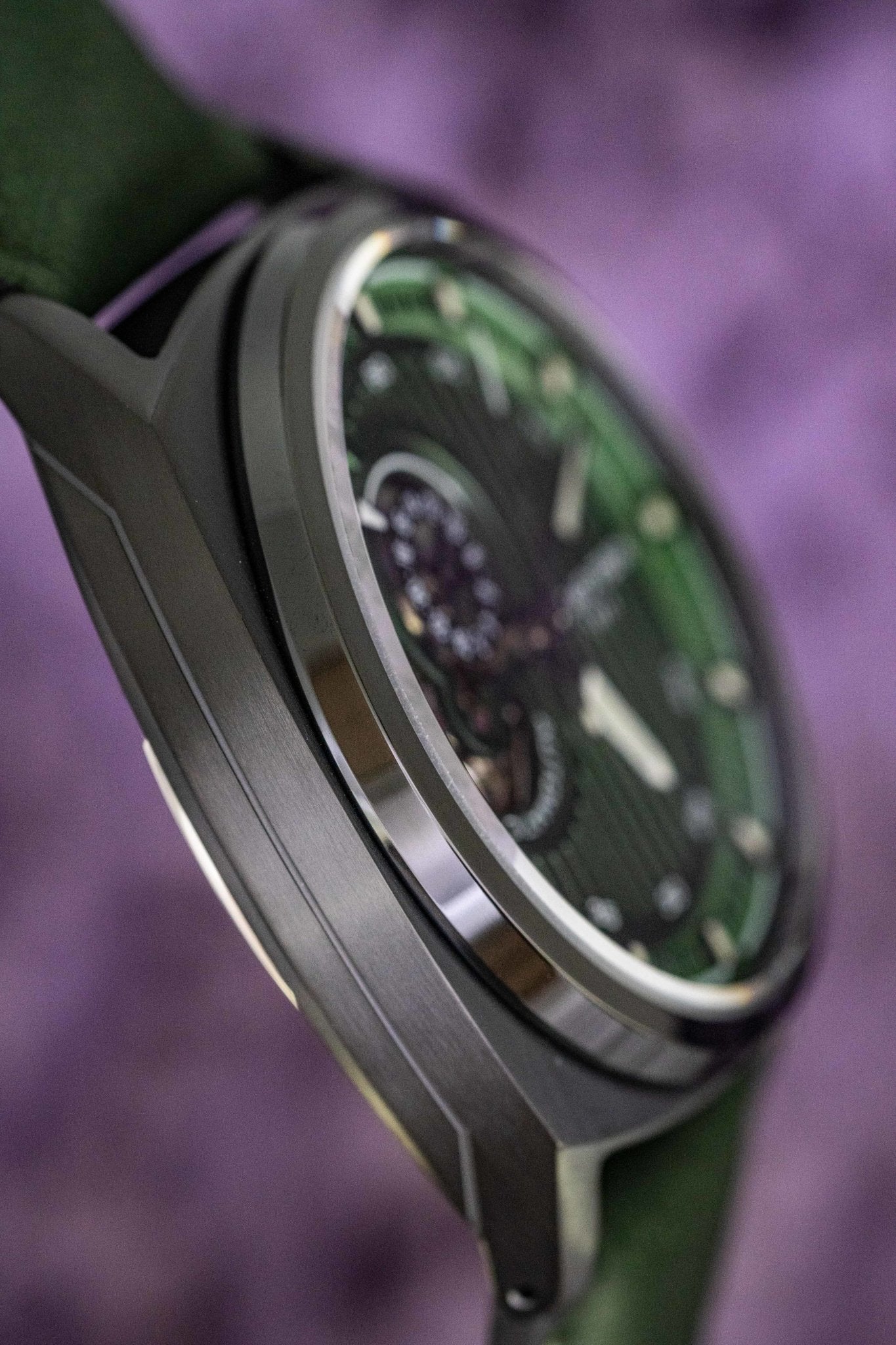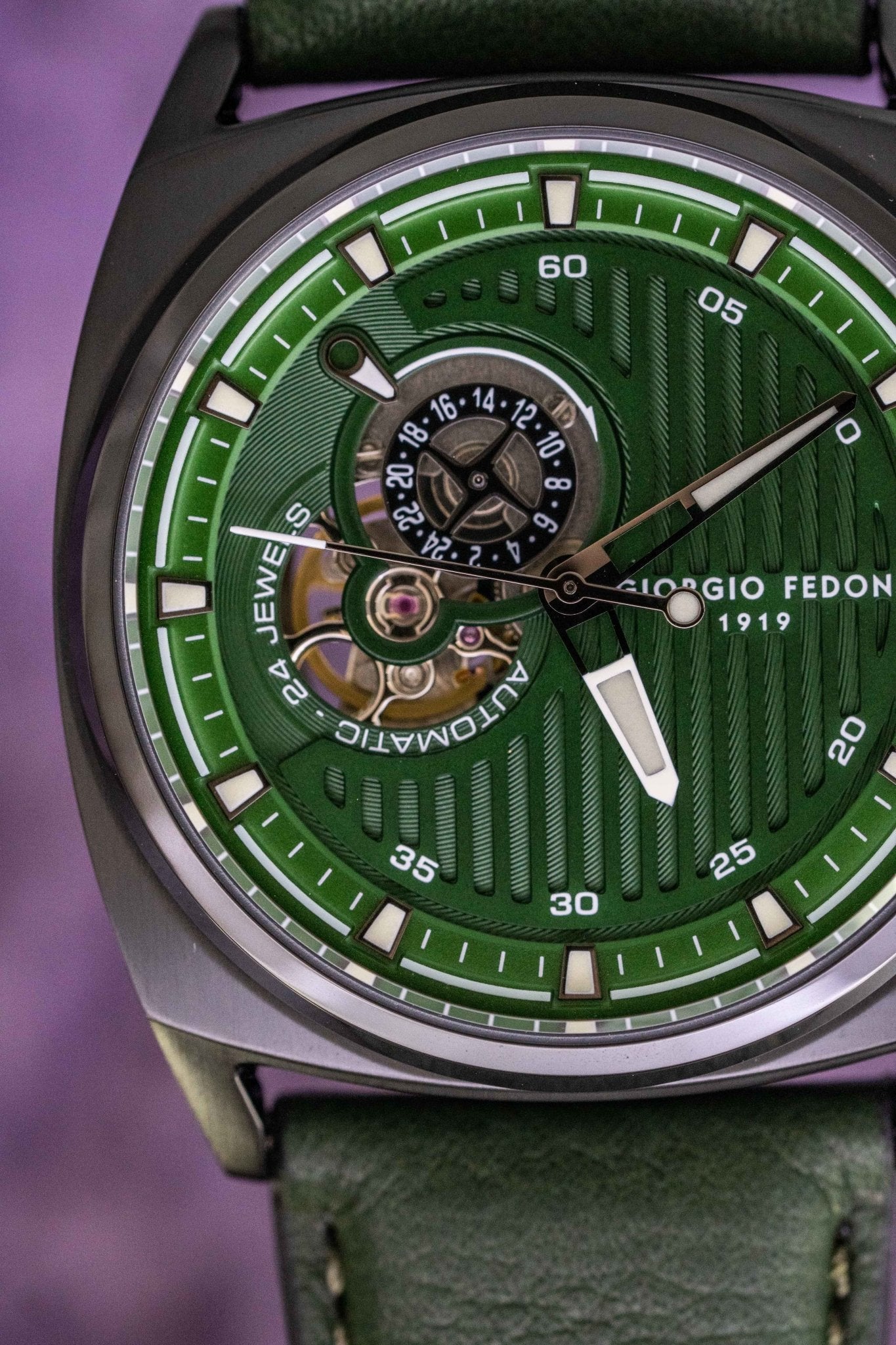 Green Textured Dial - Applied Stainless Steel Markers and Hands with Super LumiNova®. 24 Hour Indicator at 9 O'Clock. Open Heart Window showing the Balance Spring