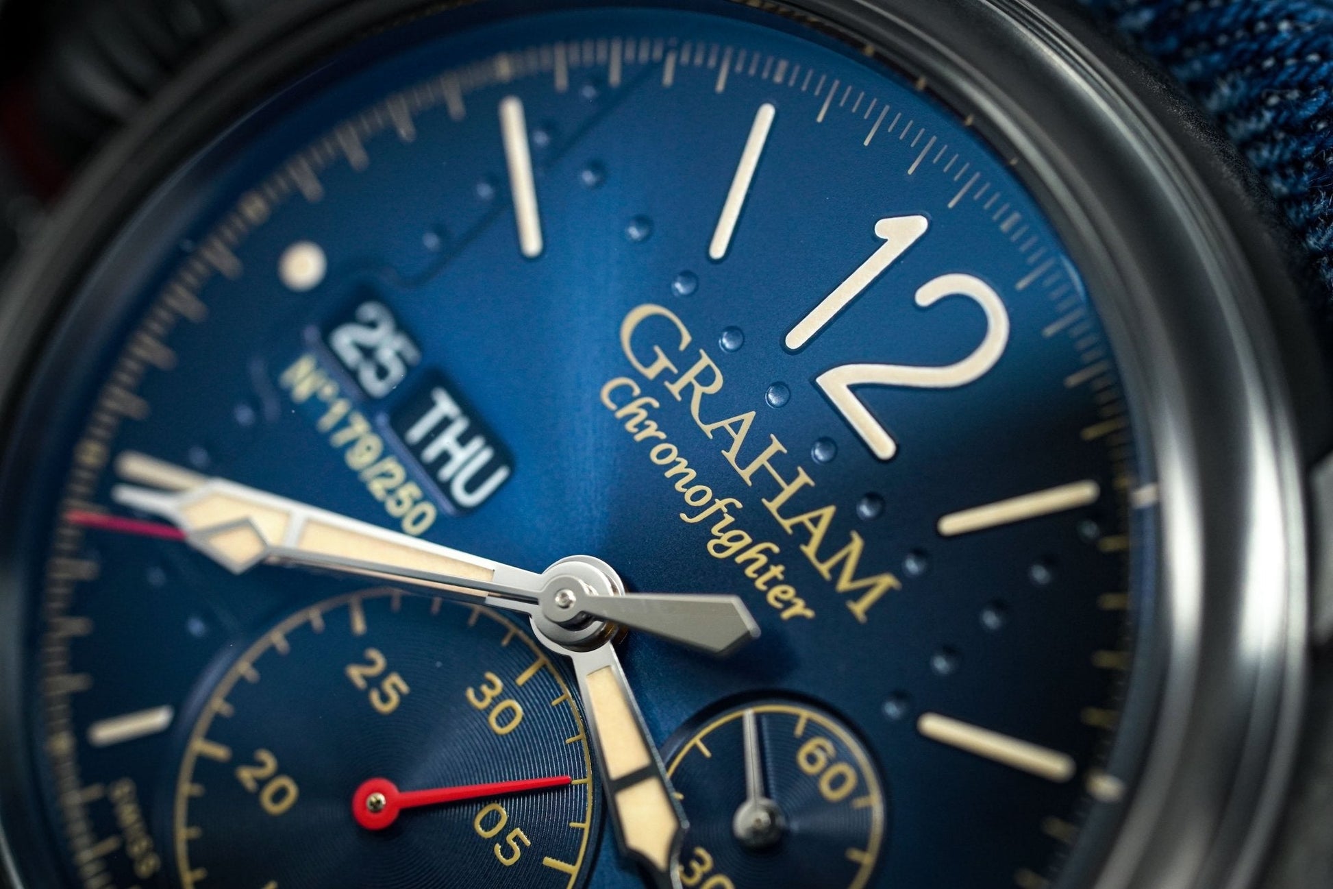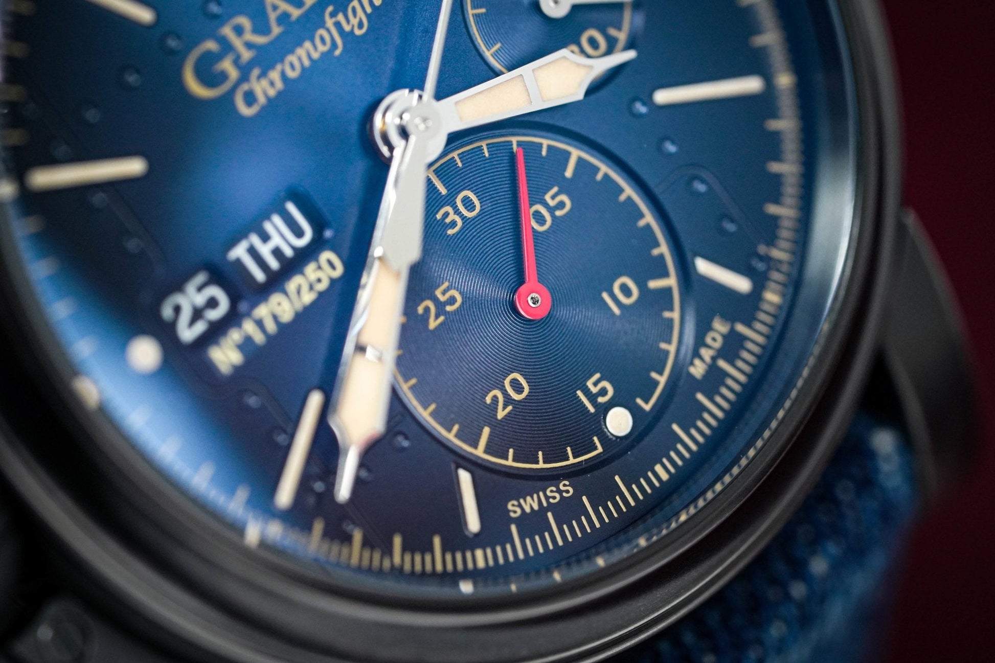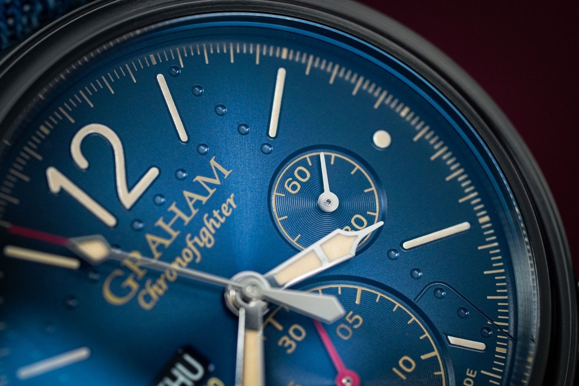 Blue Riveted Dial - Analog - White Super-Luminous Hands - Numerals and Indexes Hour Markers - White Chrono and Red Counter's - Limited Edition Number at 9 O'Clock Position