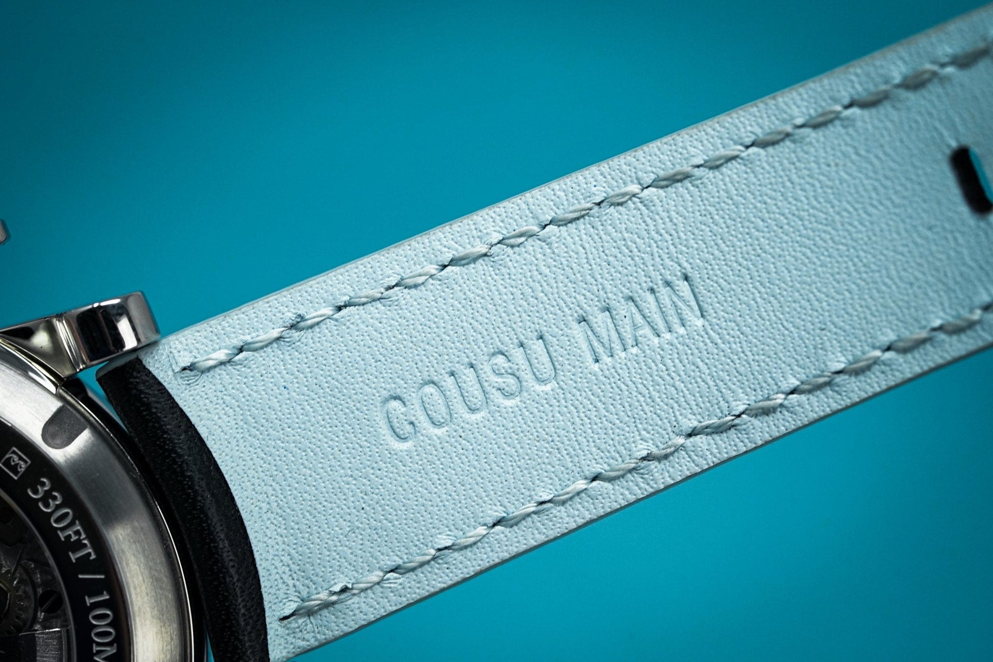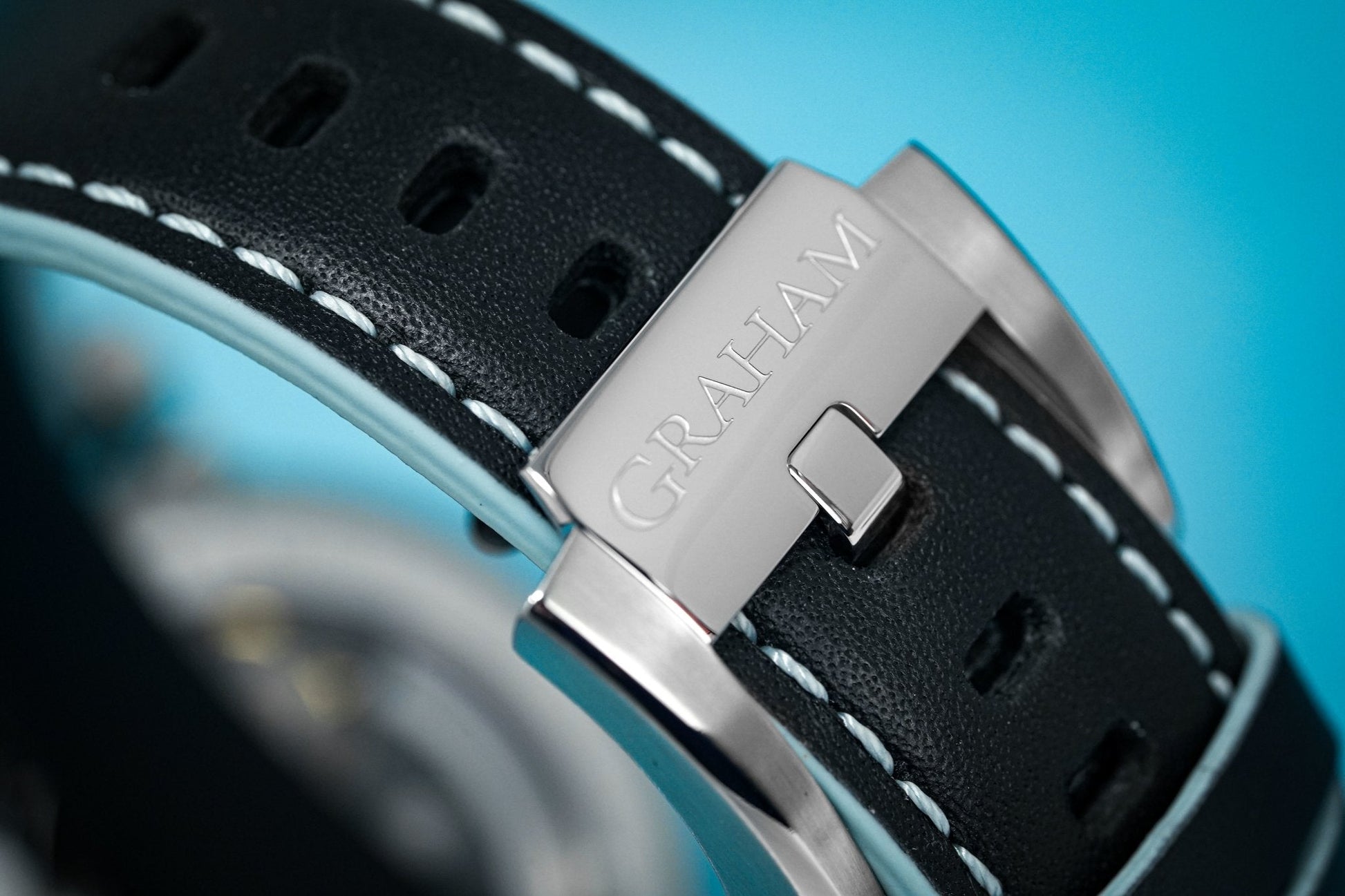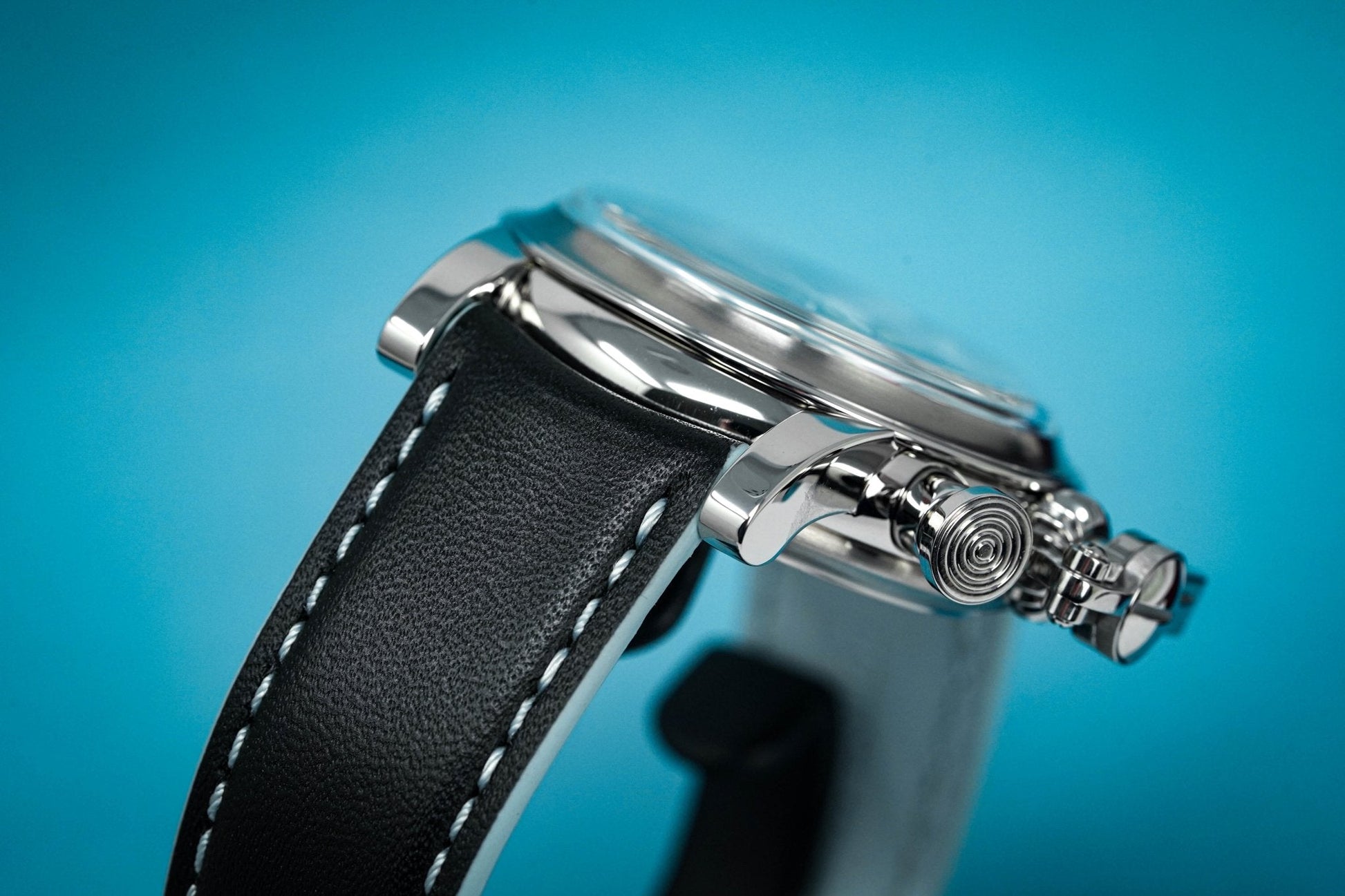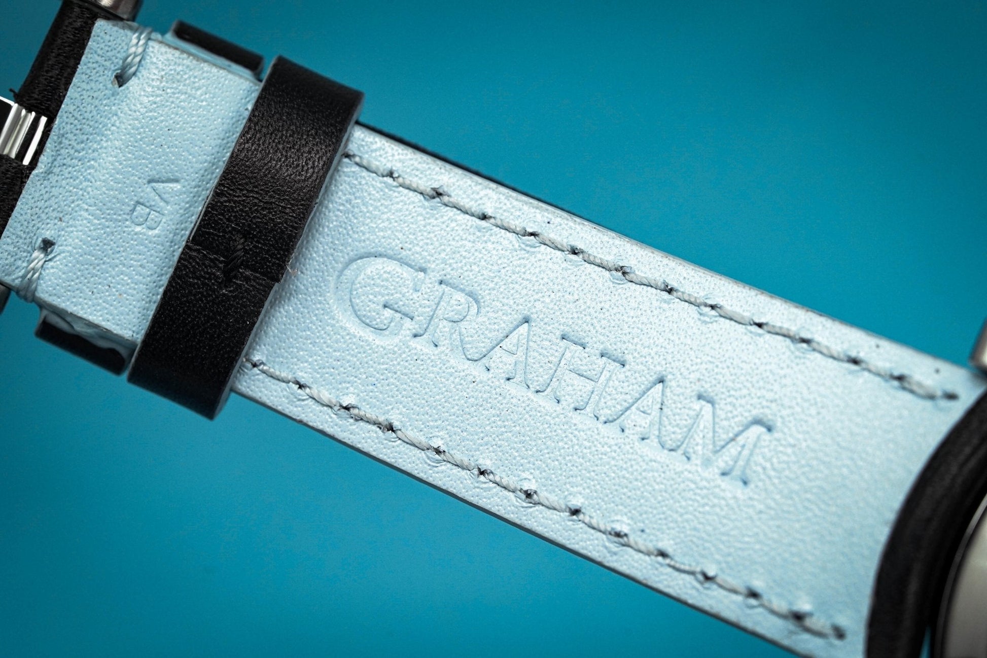 24mm x 19cm Hand-sewn Black Calf Leather Strap with Blue Accents and a Stainless Steel Pin Buckle.