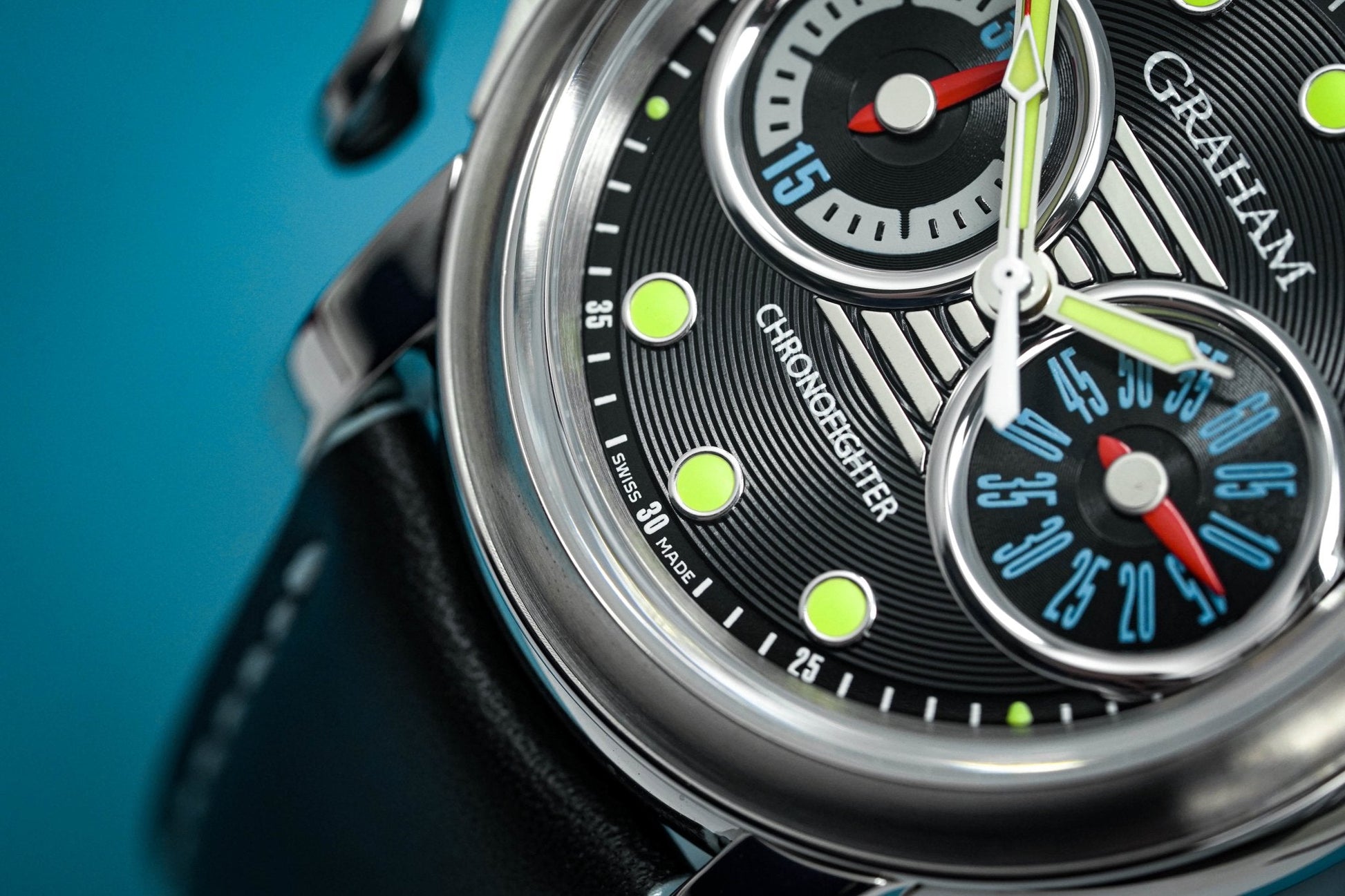 Black Snailed Dial - Stainless Steel Hands and Markers with Yellow Super-LumiNova Filling. Rhodium Ring around Sub-Dials. 30 Minute Counter and Small Seconds Counter.