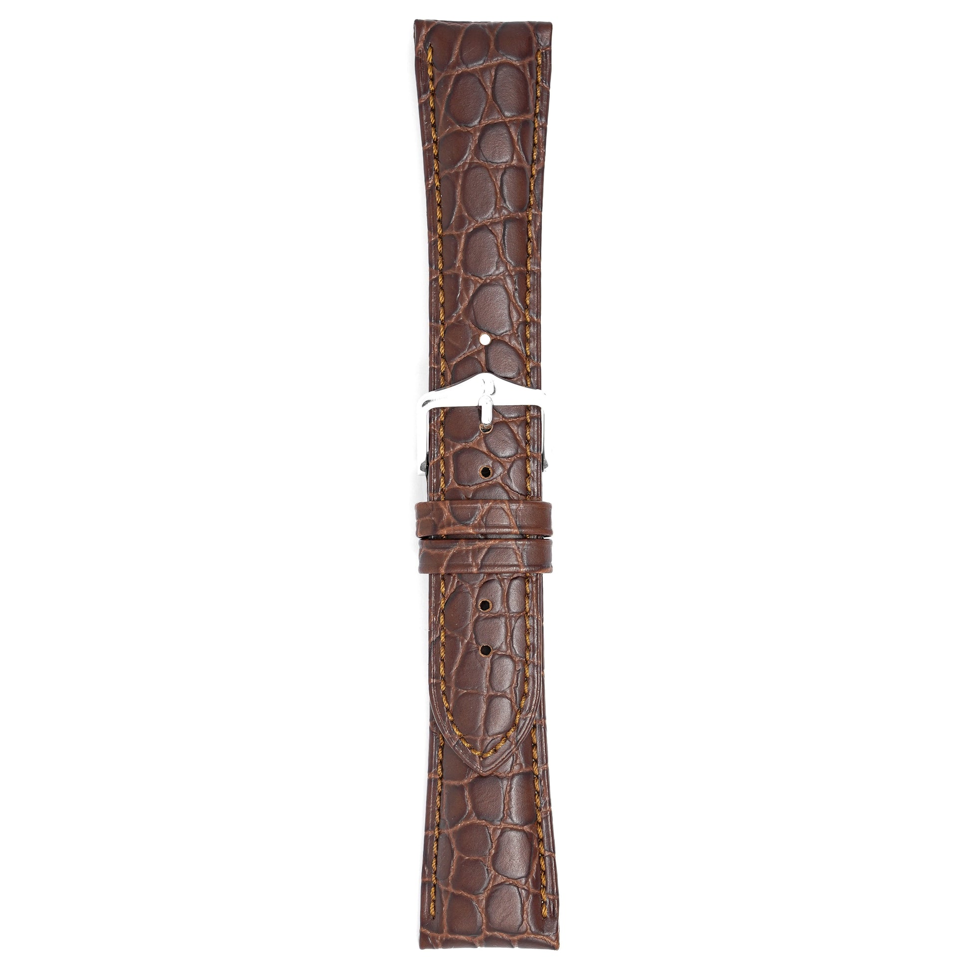 22mm width x 20cm Length Dark Brown Crocodile Embossed Leather Strap with Brown Stitchings - Fitted With a Polished Stainless Steel Buckle.