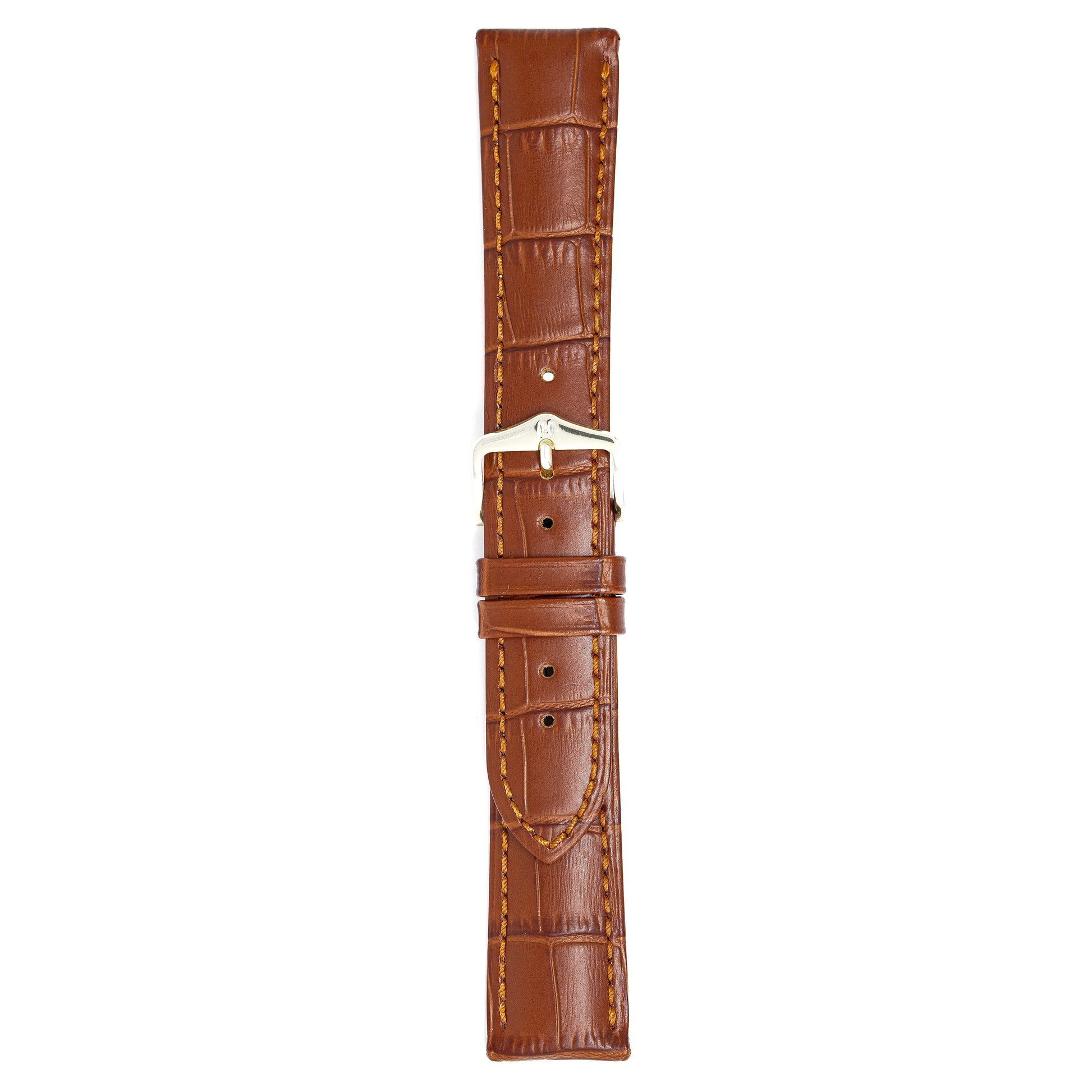20mm width x 20cm Length Brown Alligator Embossed Leather Strap with Brown Stitchings - Fitted With a Polished Gold Plated Stainless Steel Buckle.
