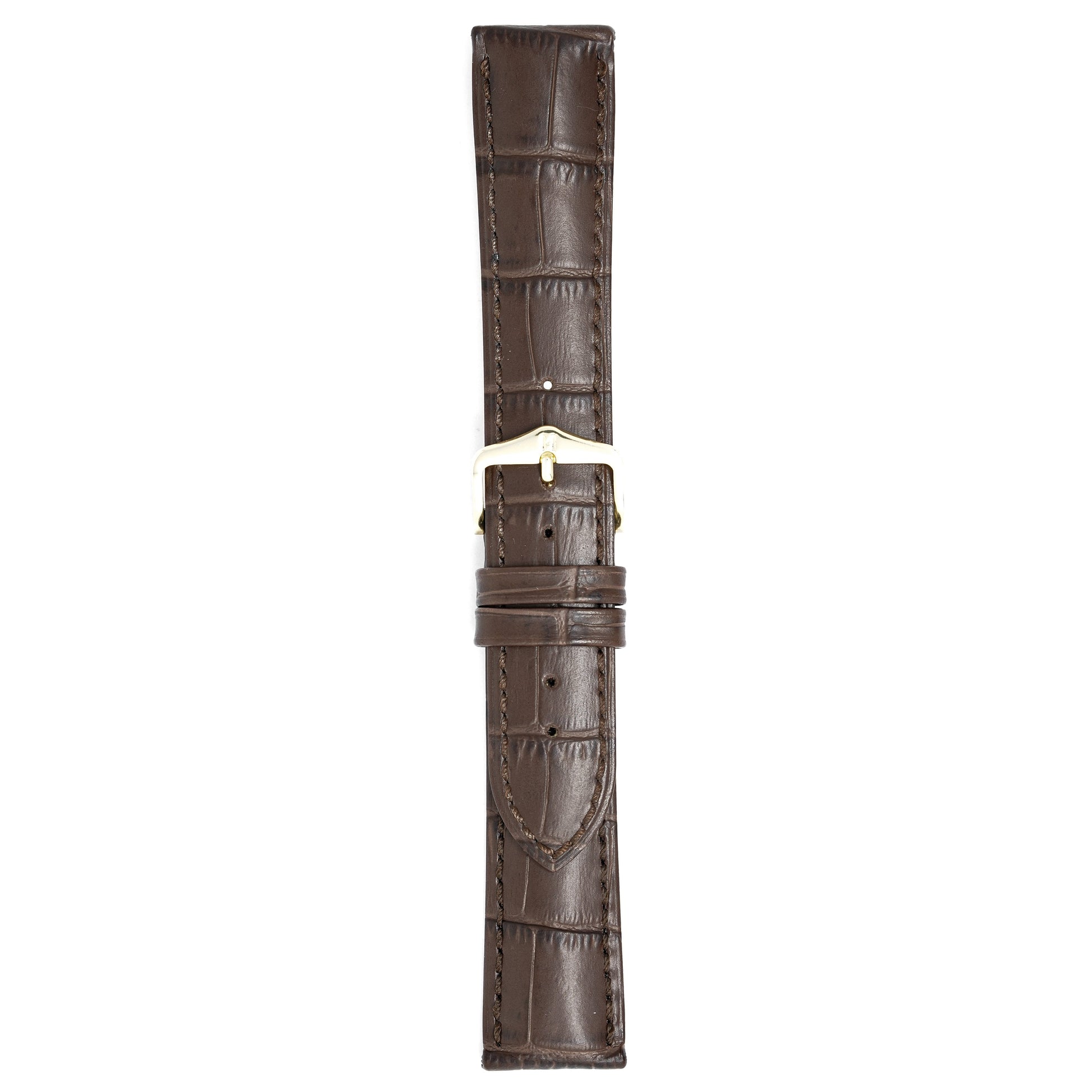 20mm width x 20cm Length Dark Brown Alligator Embossed Leather Strap with Brown Stitchings - Fitted With a Polished Gold Plated Stainless Steel Buckle.