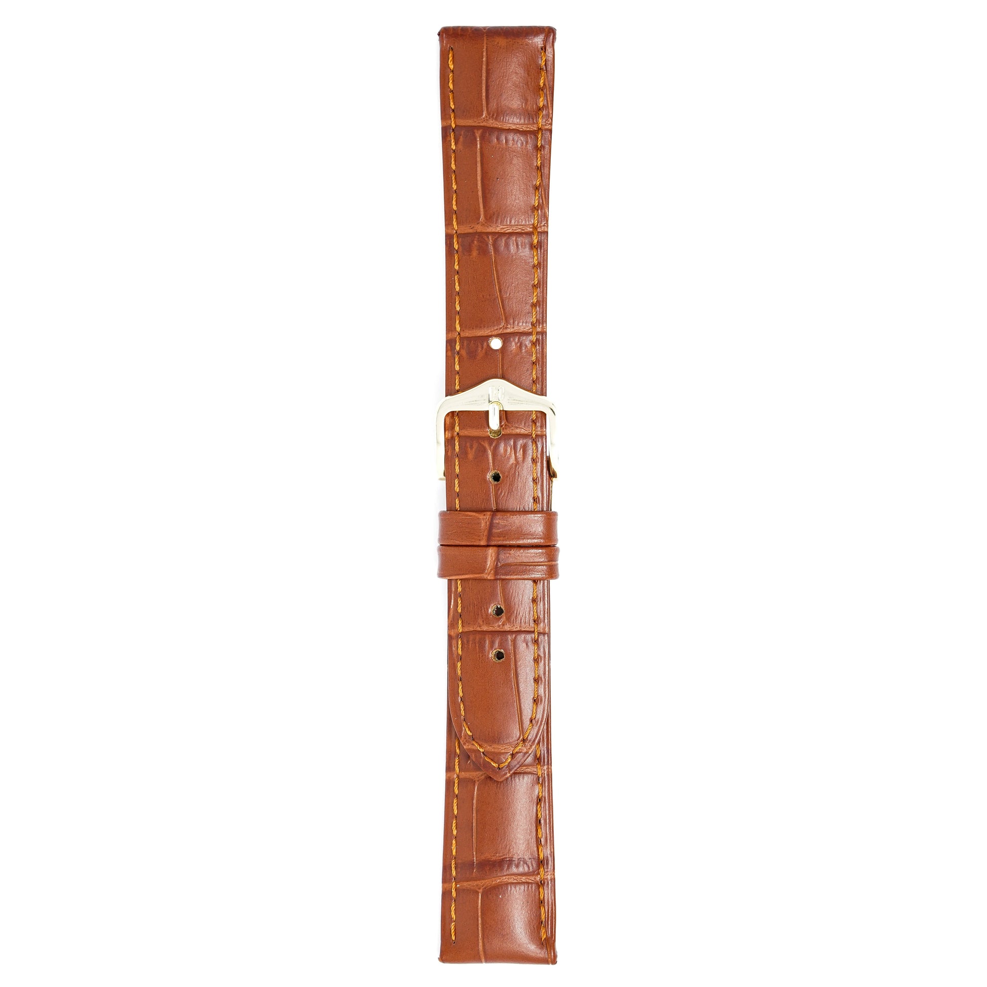 18mm width x 20cm Length Brown Alligator Embossed Leather Strap with Brown Stitchings - Fitted With a Polished Gold Plated Stainless Steel Buckle.