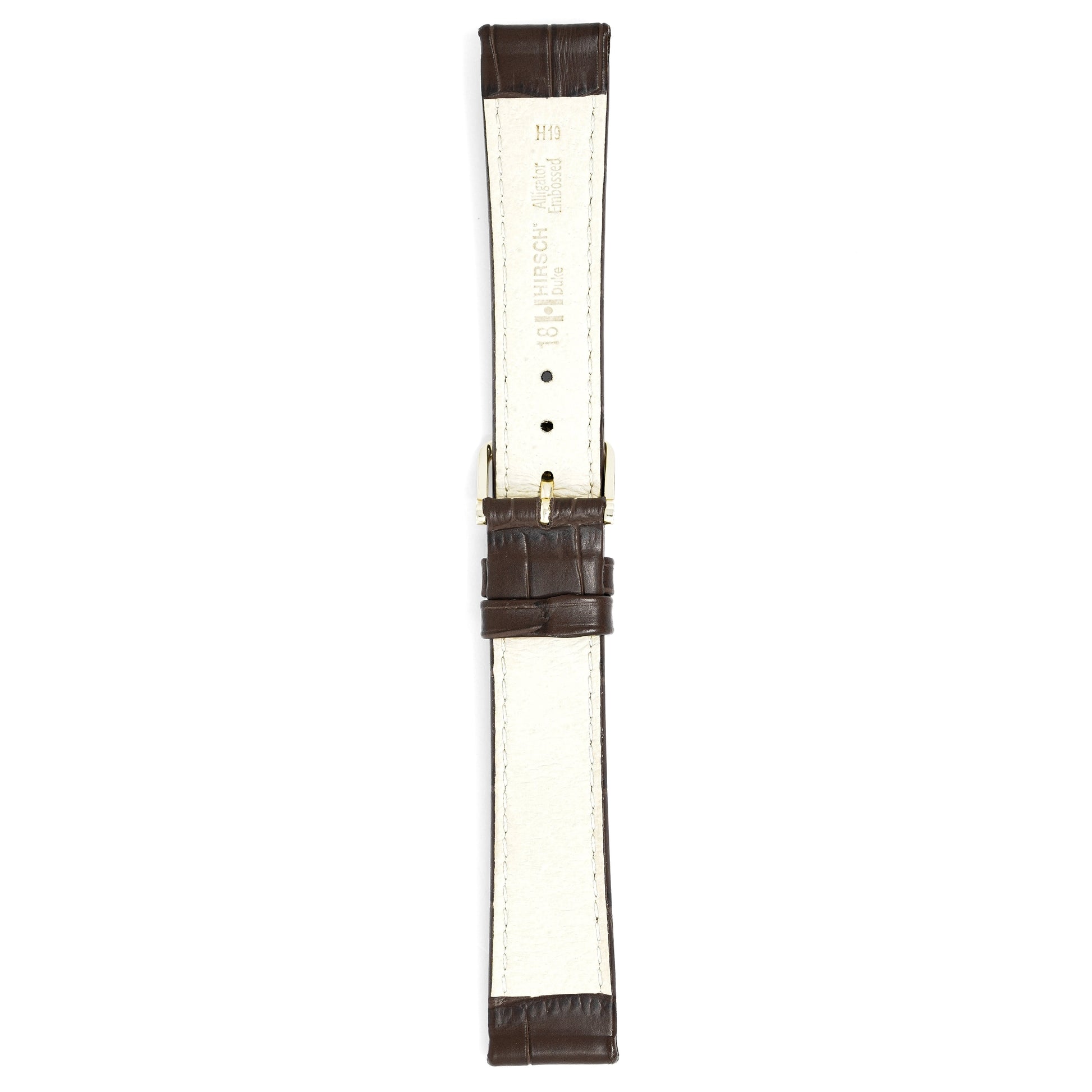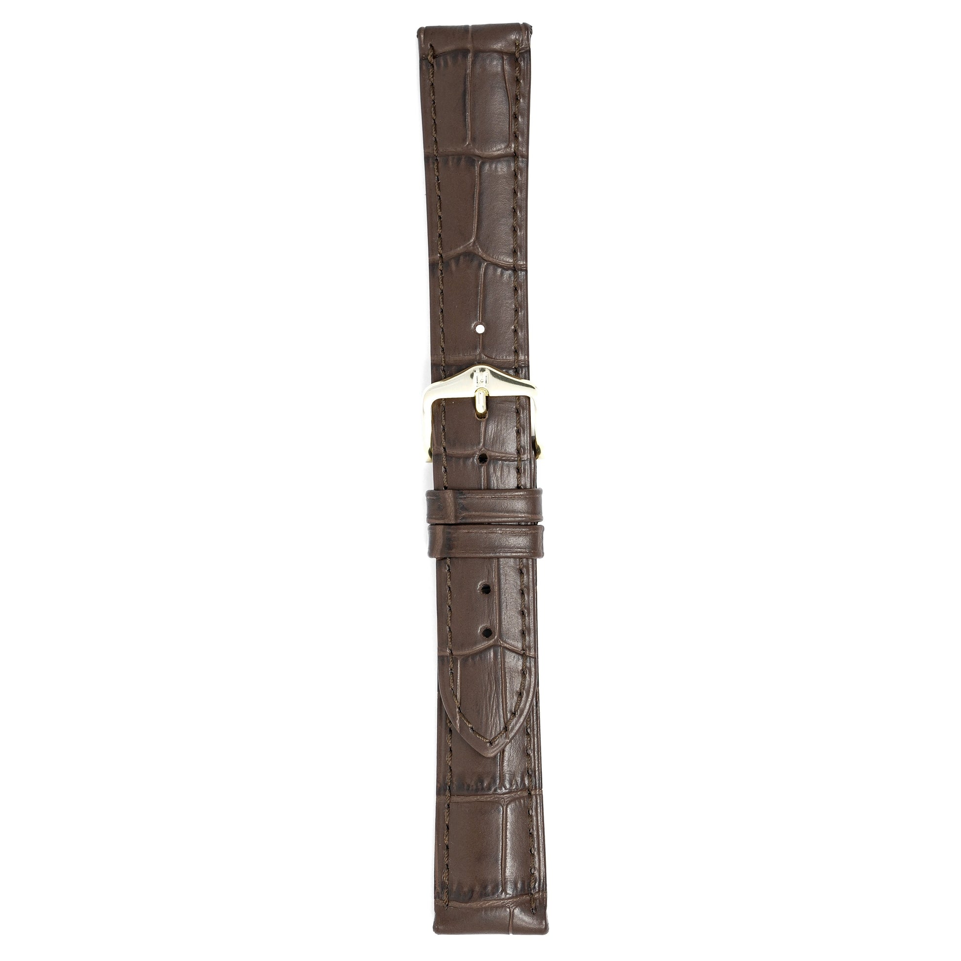18mm width x 20cm Length Brown Alligator Embossed Leather Strap with Brown Stitchings - Fitted With a Polished Gold Plated Stainless Steel Buckle.