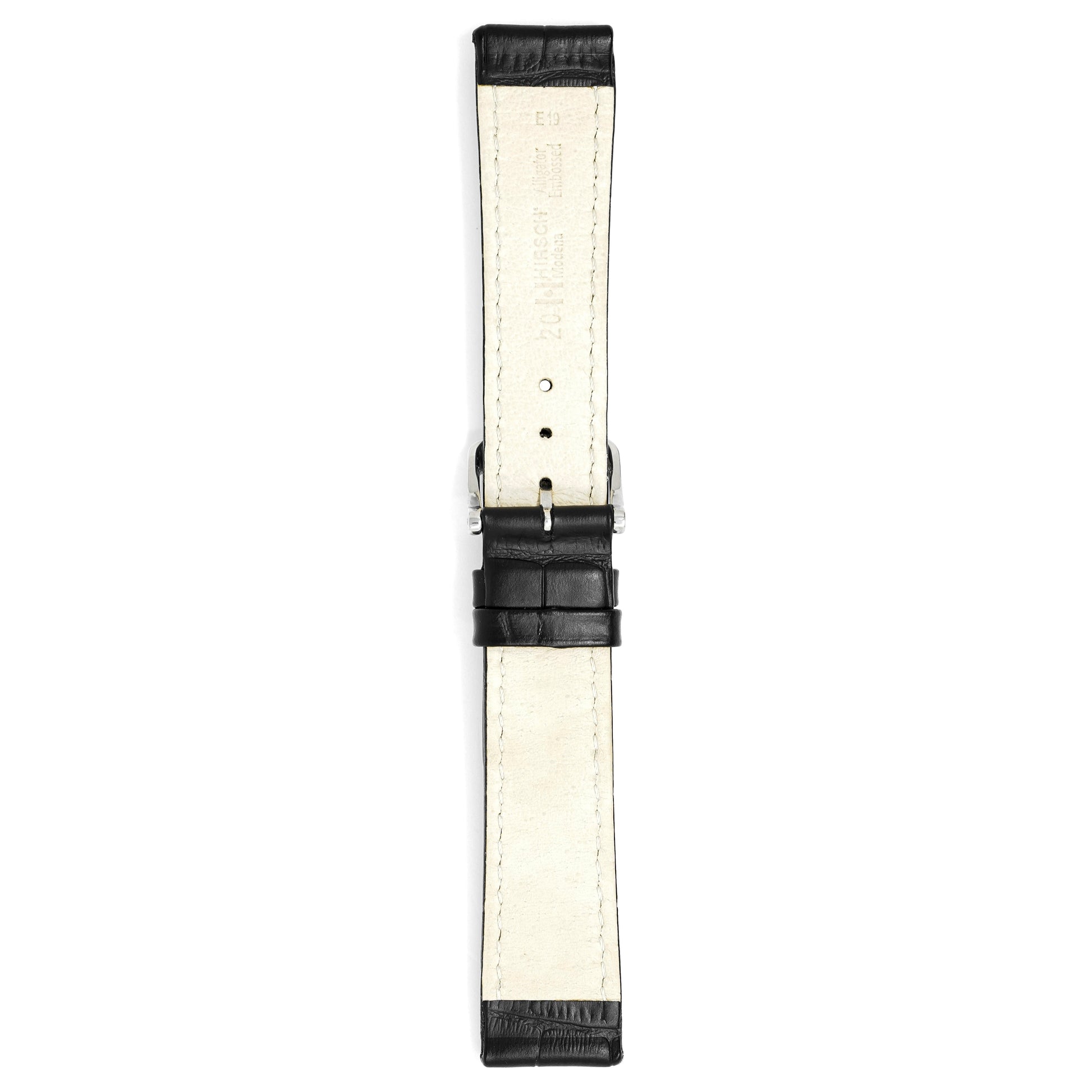 20mm width x 20cm Length Black Alligator Embossed Leather Strap with White Stitchings - Fitted With a Polished Stainless Steel Buckle.