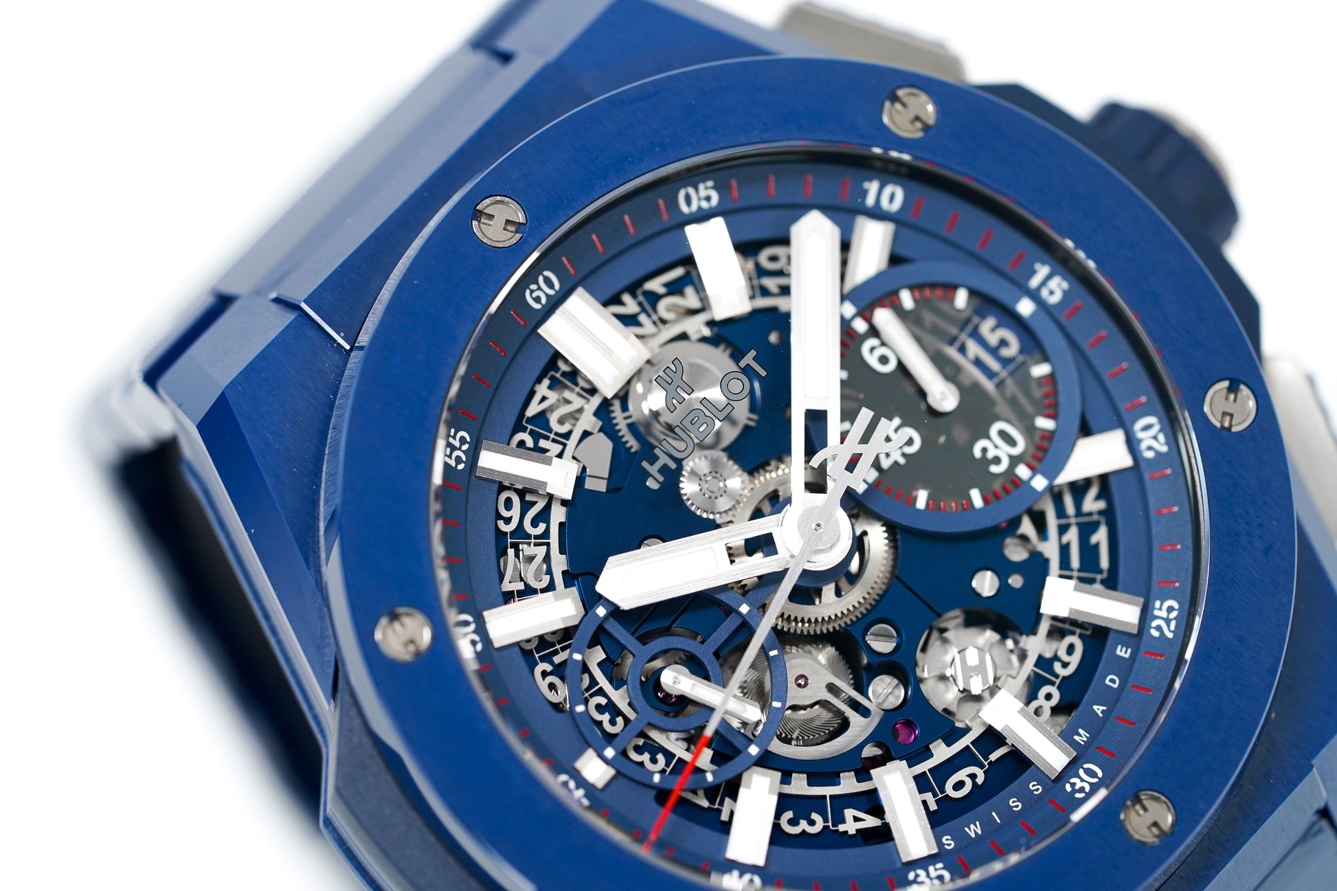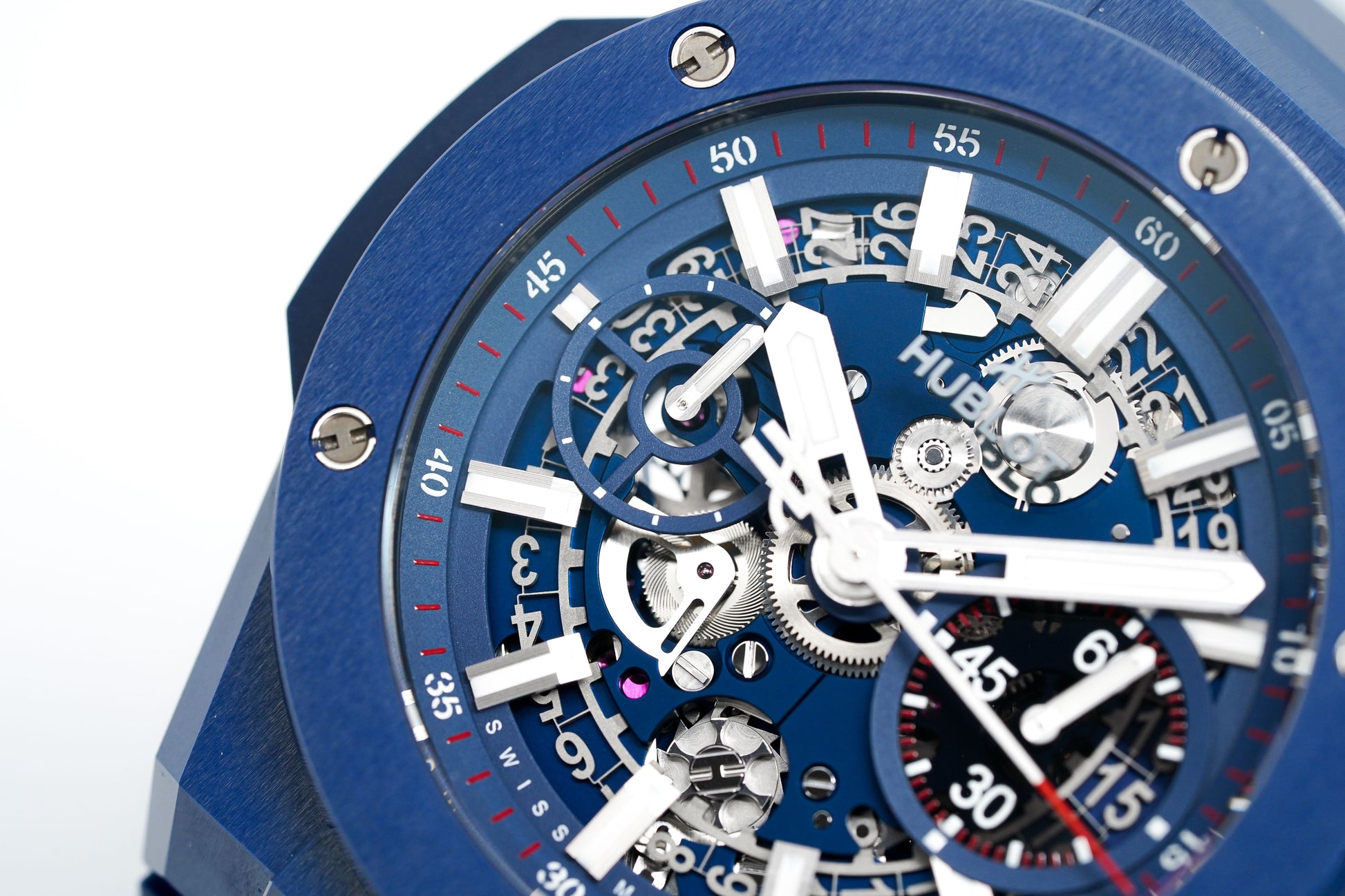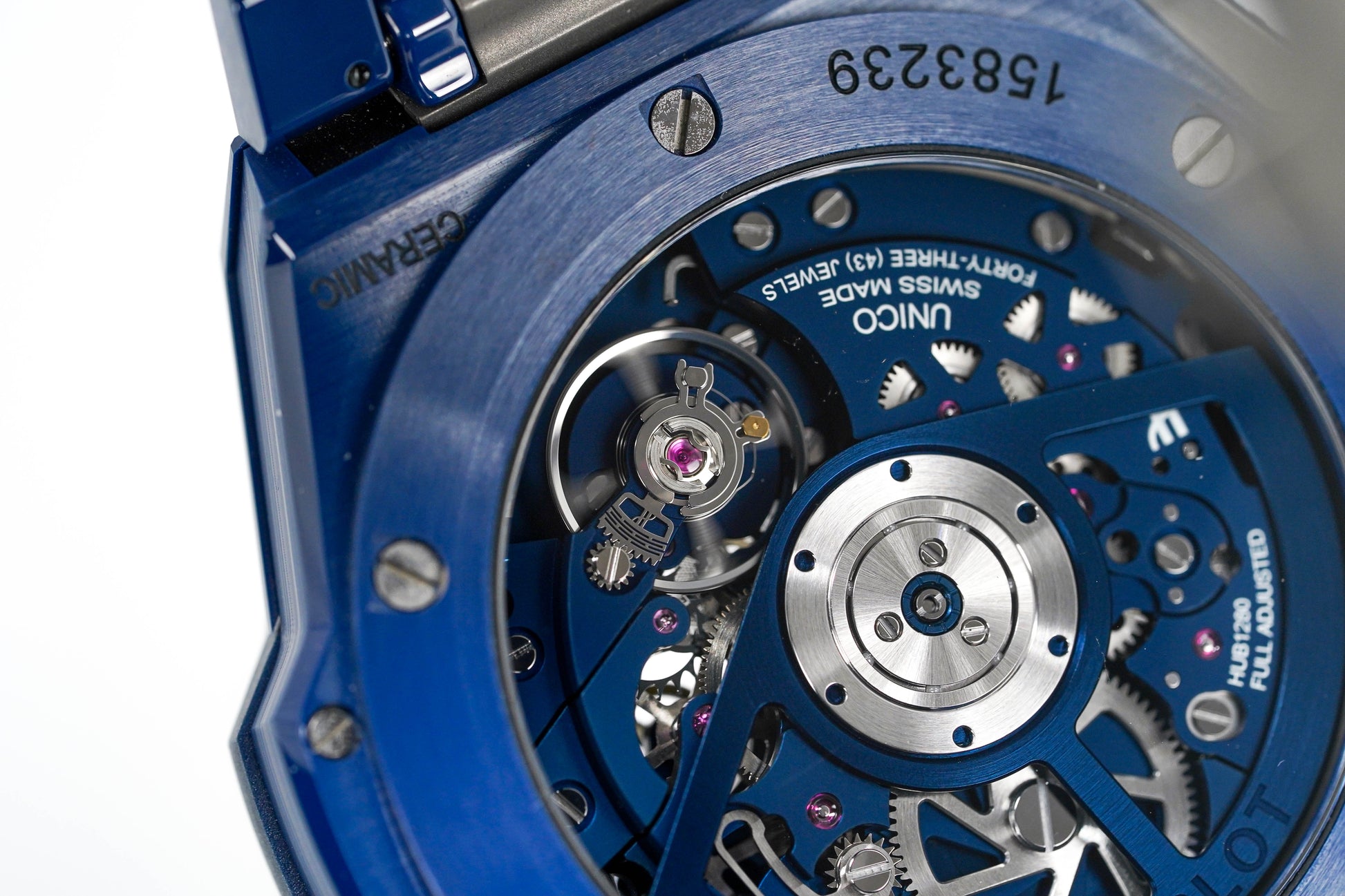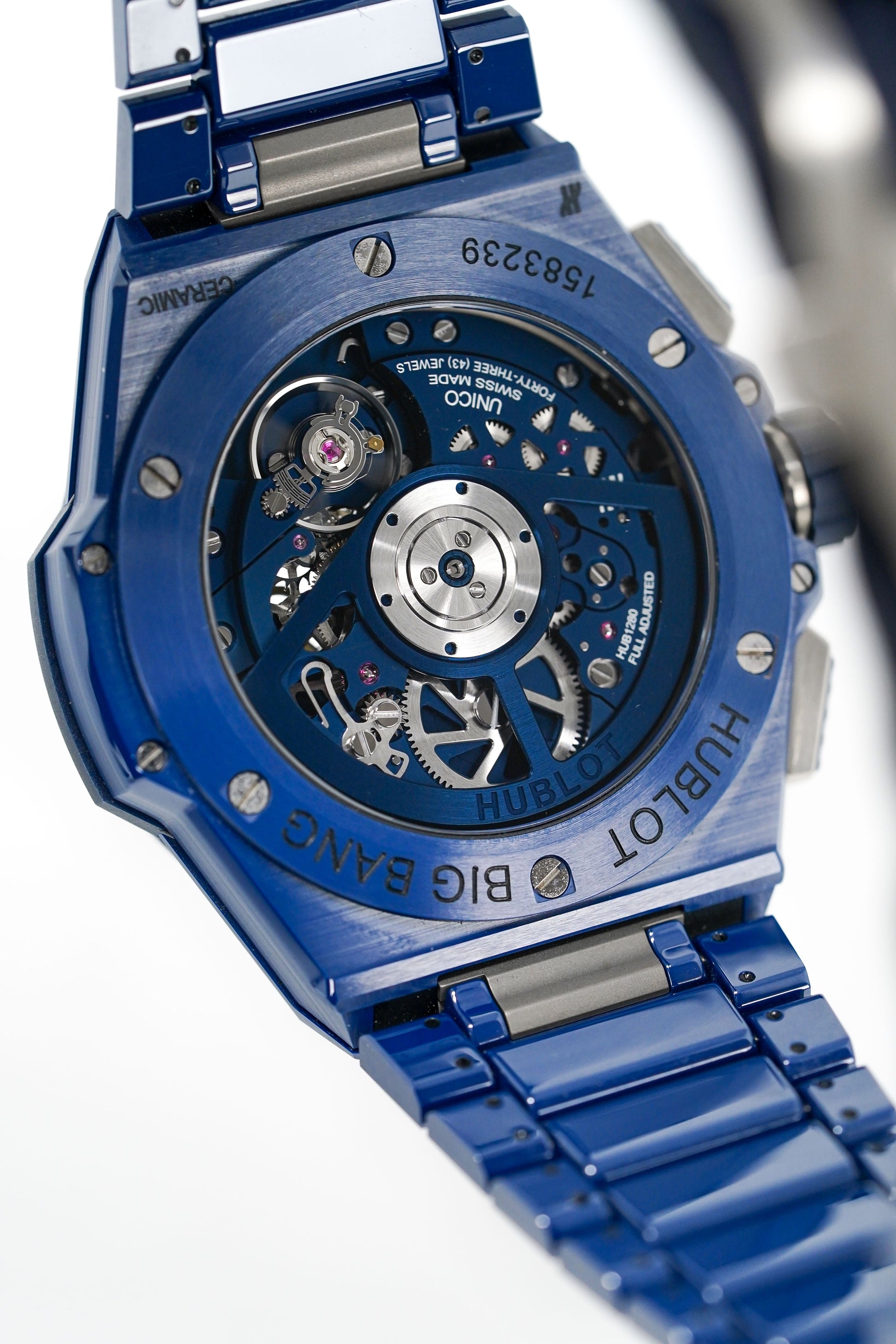 42mm Blue Satin-Finished Ceramic Case. Anti-Reflective Sapphire Crystal Glass. Sapphire Crystal Open Caseback.