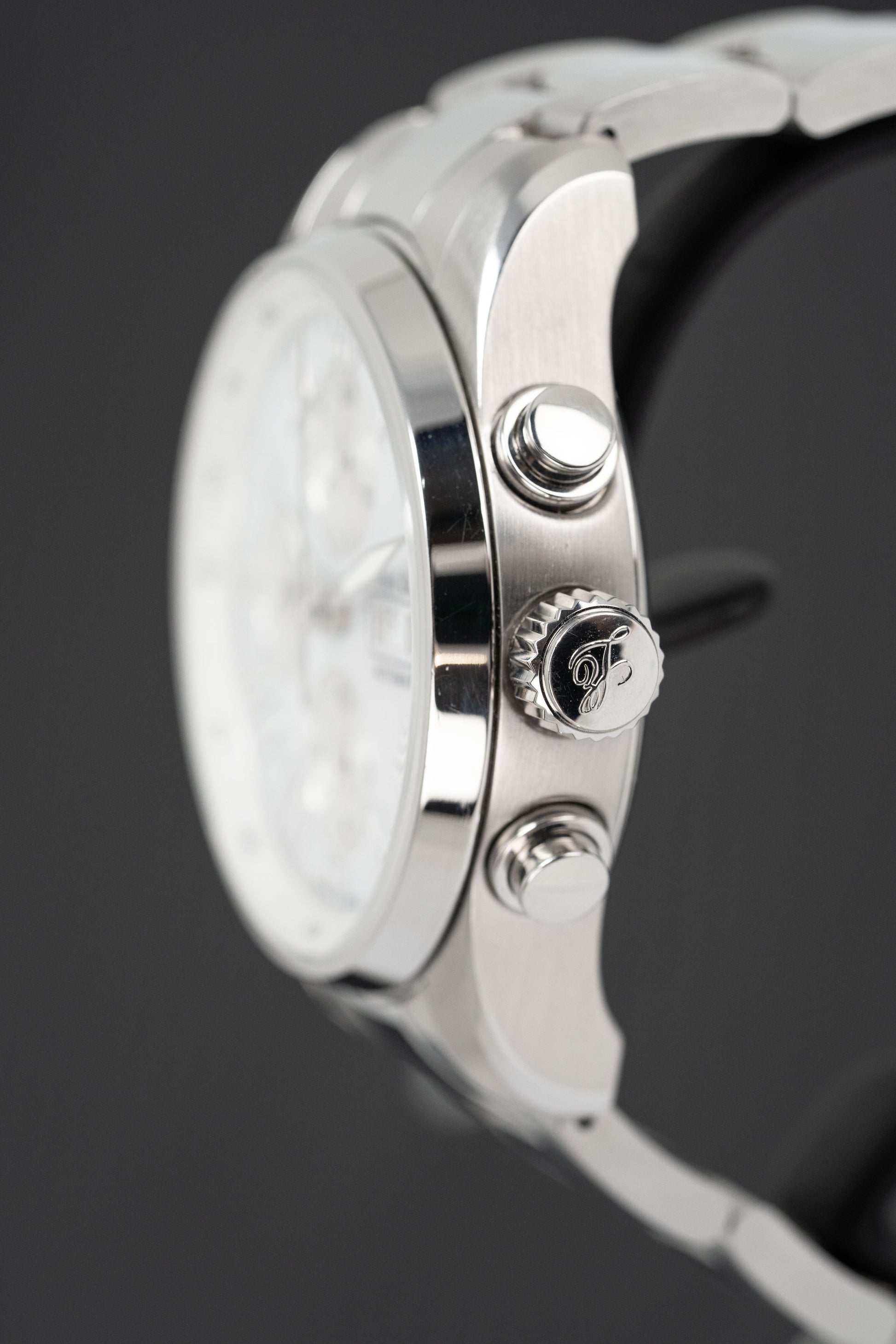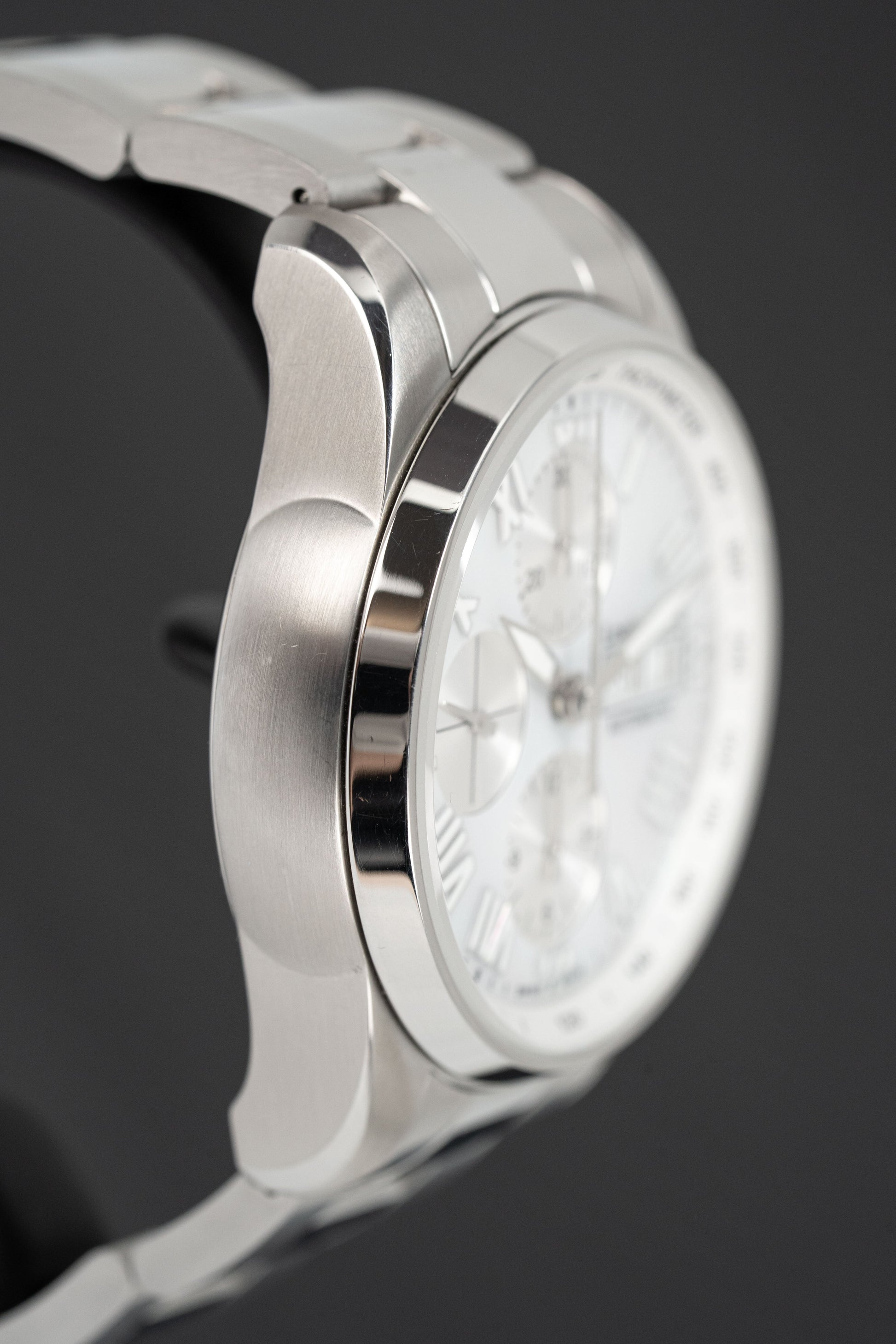White Mother of Pearl Dial - Luminous Roman Numeral Hour Indices - Luminous Steel Hour and Minute Hands - Silver Applied Seconds Hand - Day and Date Window at 3 O'Clock - Small Seconds, 30 Minute and 12 Hour Sub Dial.