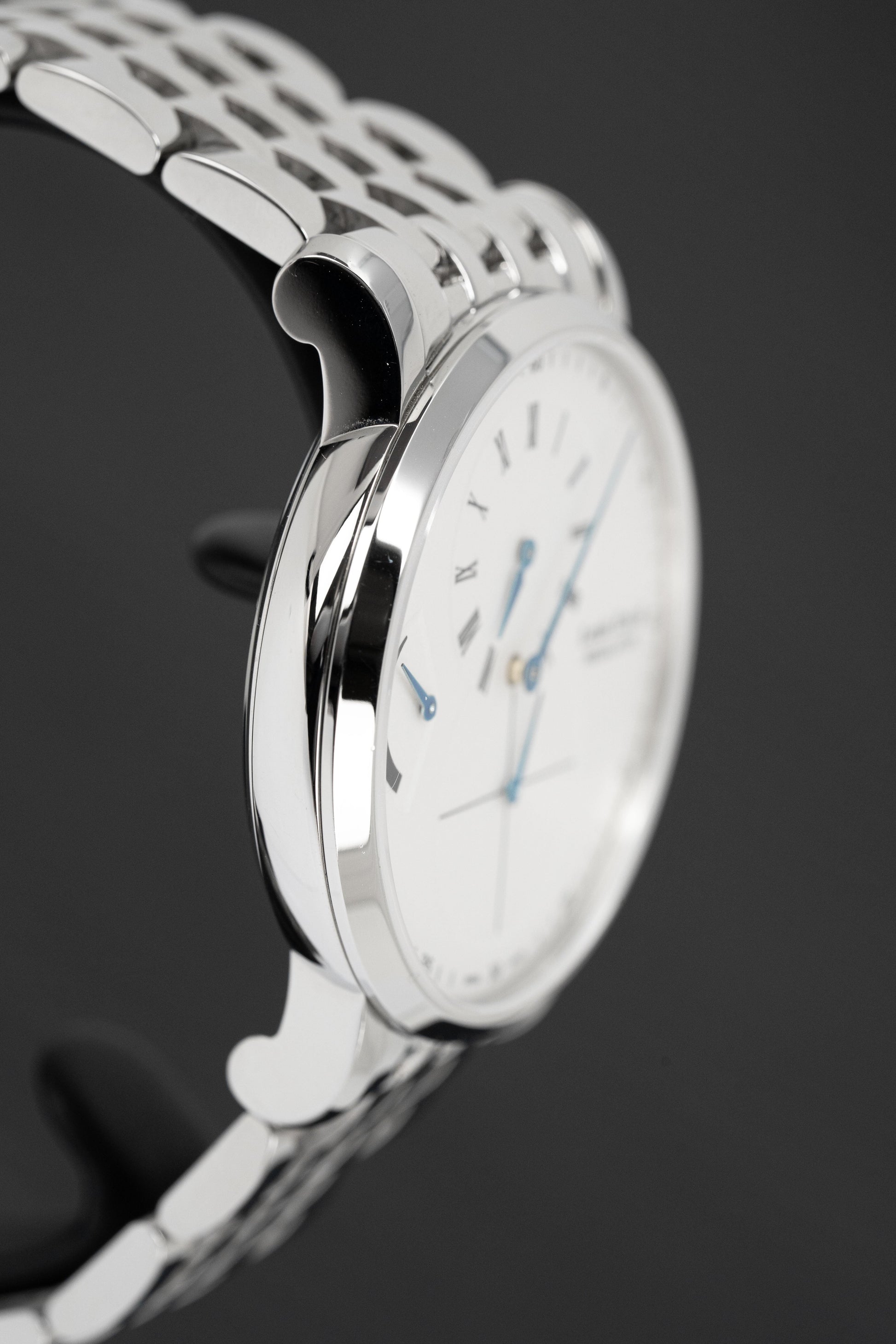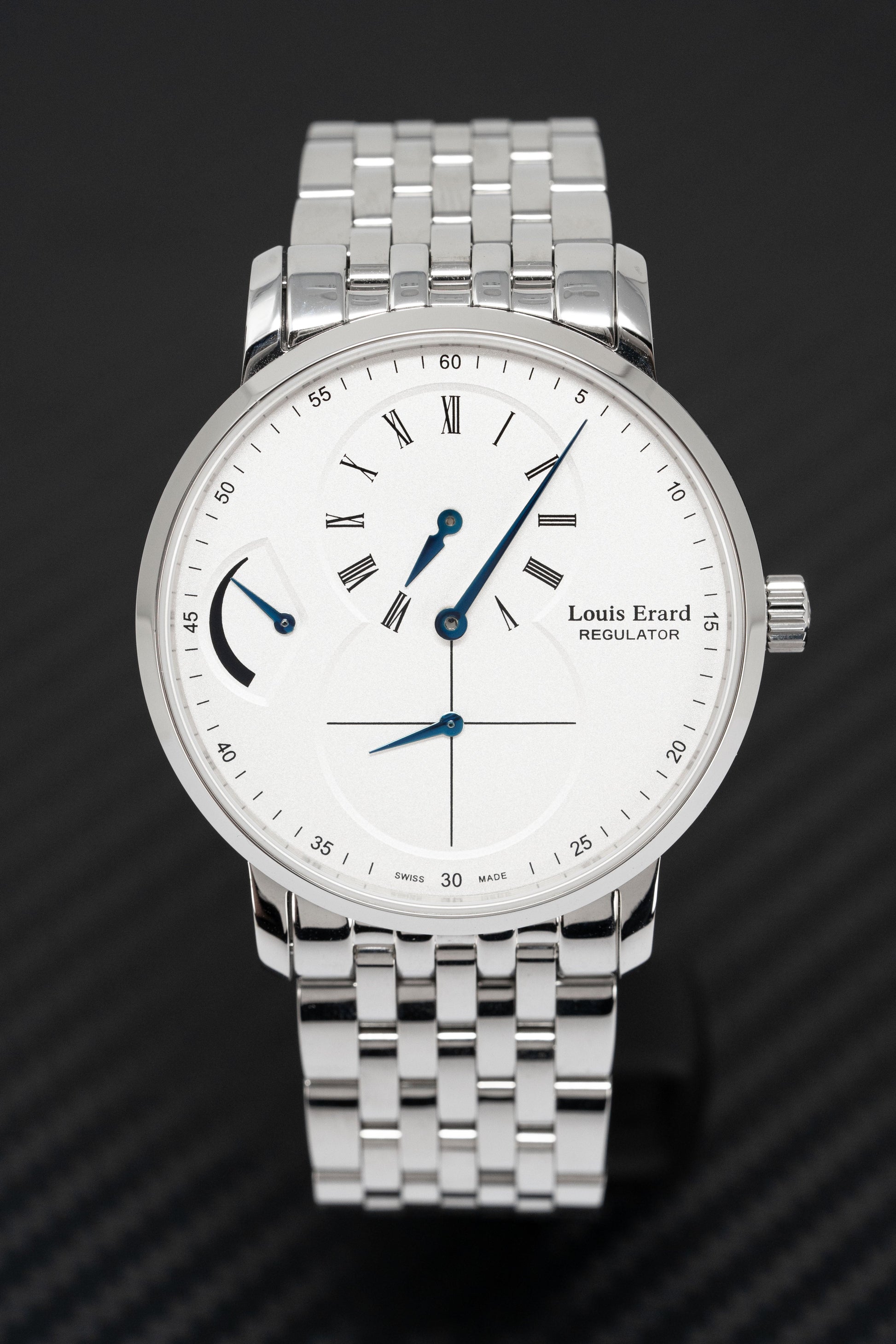 White Dial with Sub-Hour, Seconds, and Regulator - Blue Applied Steel Hands and Black Roman Numeral Hour Indexes - Black Arabic Minute Indexes.