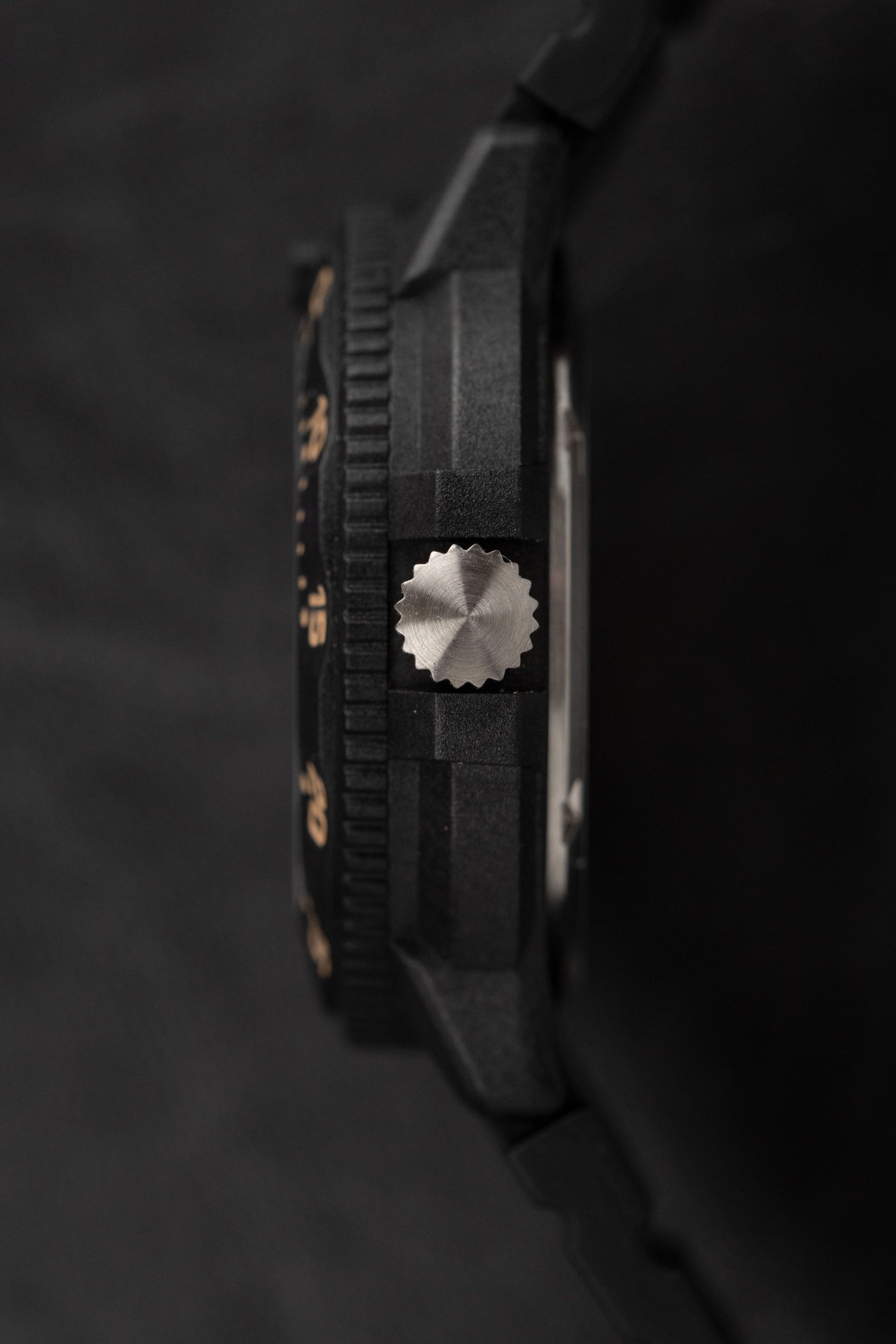 43mm x 13mm Black CARBONOX™ Case - Scratch-Resistant and Anti-Reflective Hardened Mineral Crystal - Uni-Directional Rotating Bezel - Screw Down Crown with Protection - Solid Caseback.