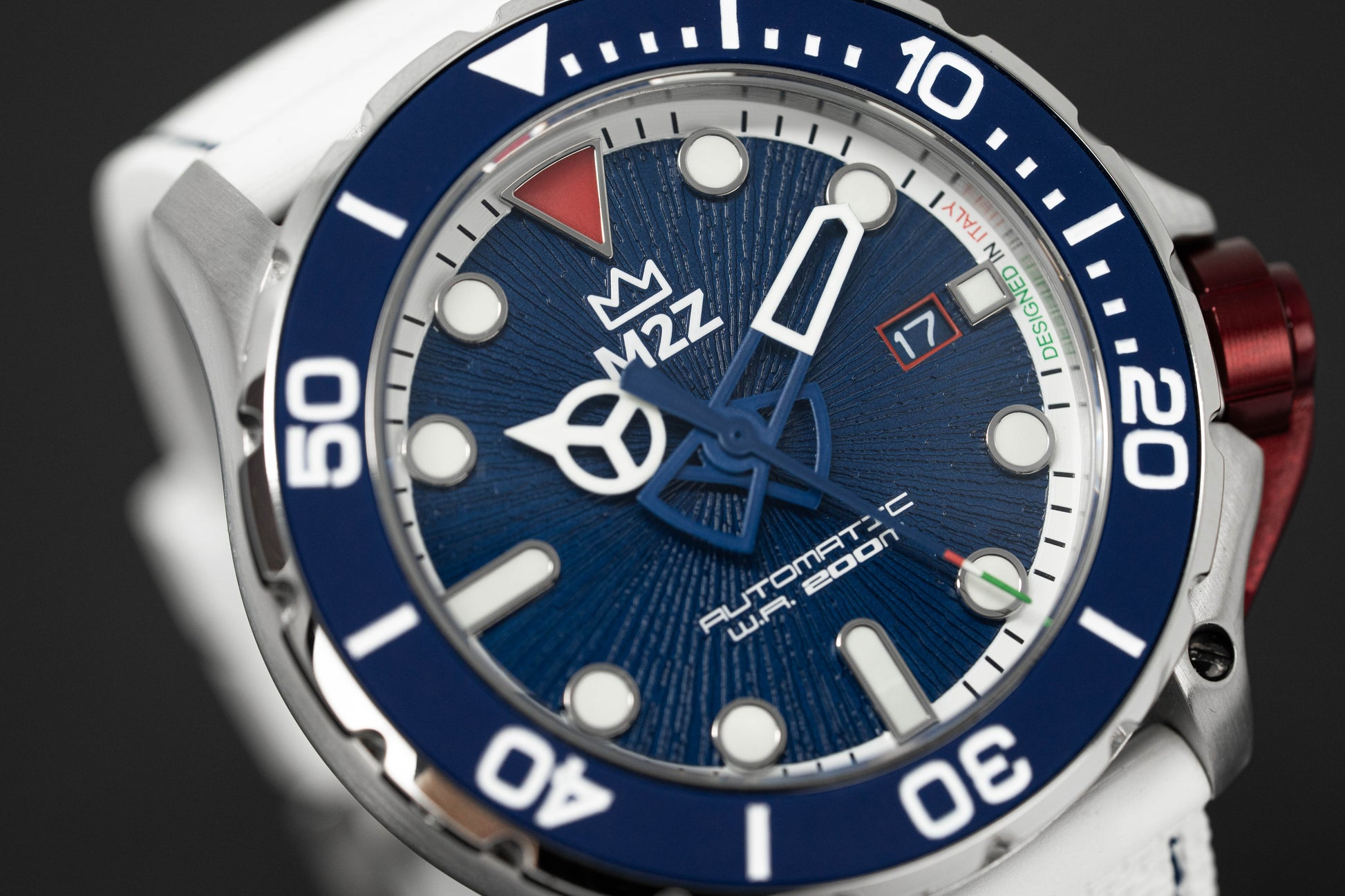 Blue Guilloché Dial with Luminous Hour Markers - Blue/White Applied Hour and Minute Hand - Blue/Italian Colours Applied Seconds Hand - Date at 3 O'Clock.