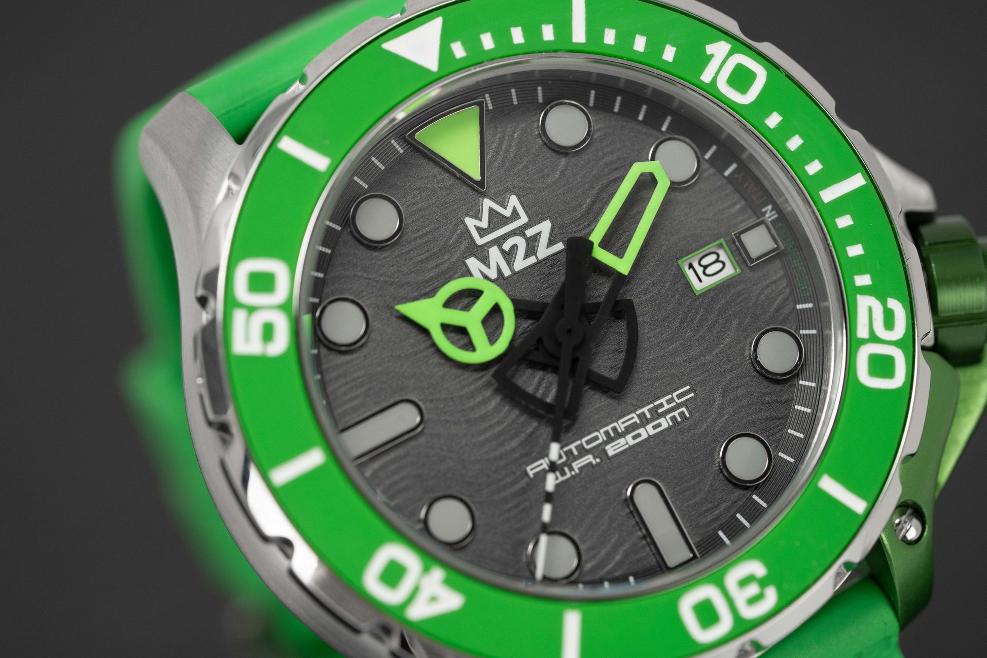 Green/Grey Wavy Guilloché Dial with Luminous Hour Markers - Black/Green Applied Hour and Minute Hand - Black/White Applied Seconds Hand - Date at 3 O'Clock.