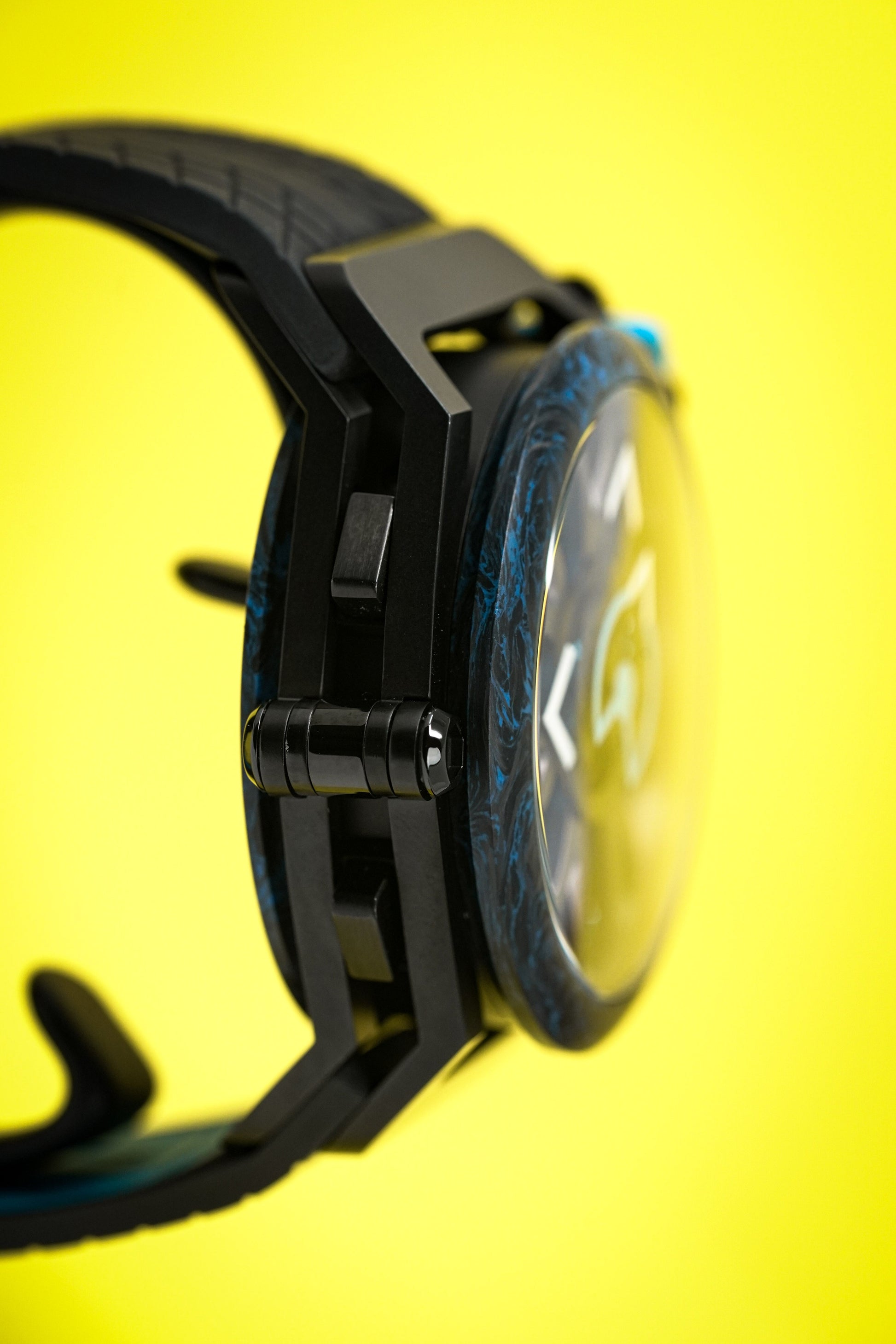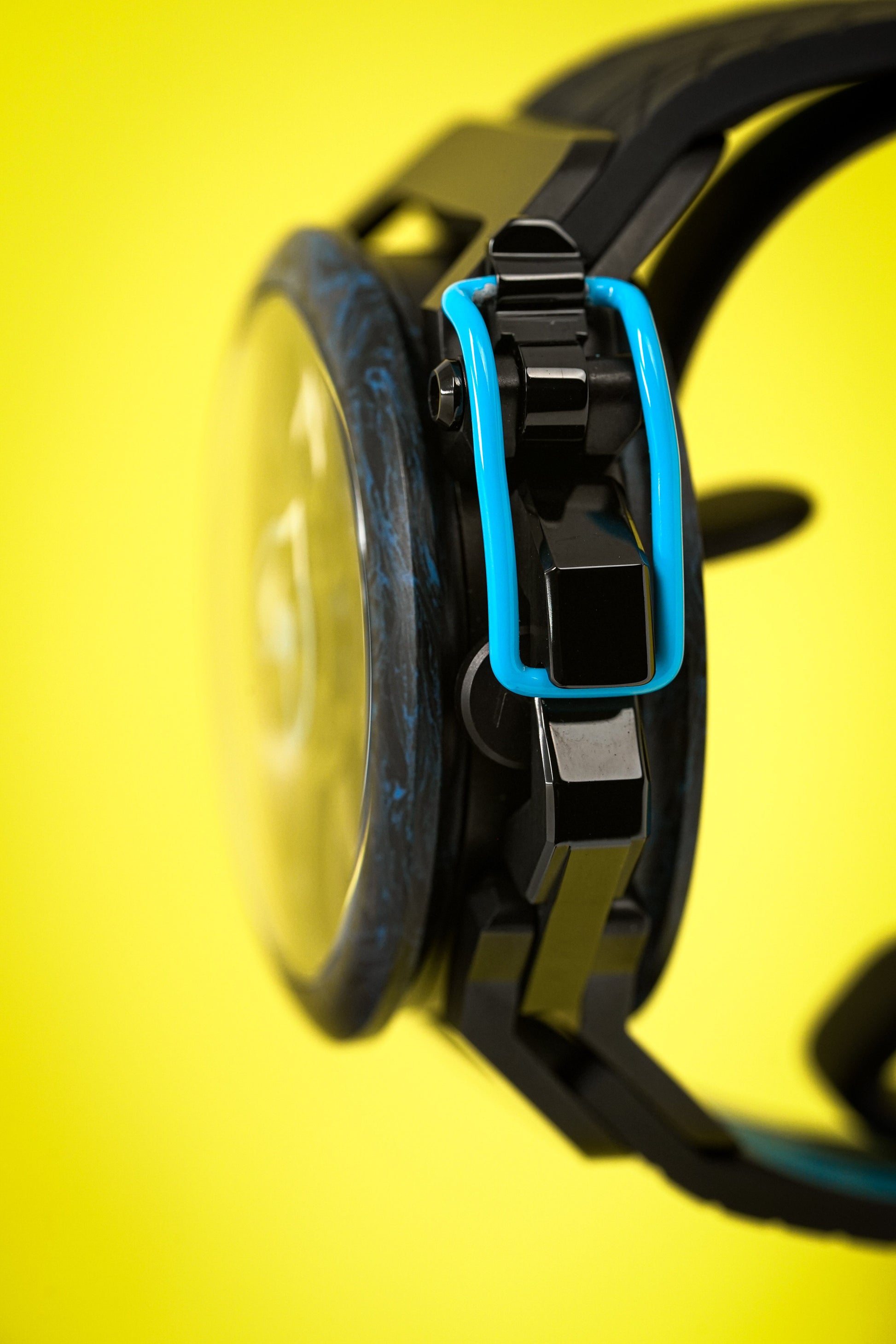 The ‘Reverse’ system allows the case to be inverted fully in both directions. A quick-release catch releases the crown from its protection by rotating the crown protector. Two special arms allow the case to rotate freely, and a clearly recognizable click tells you when the case is in the correct position to be locked back into place.