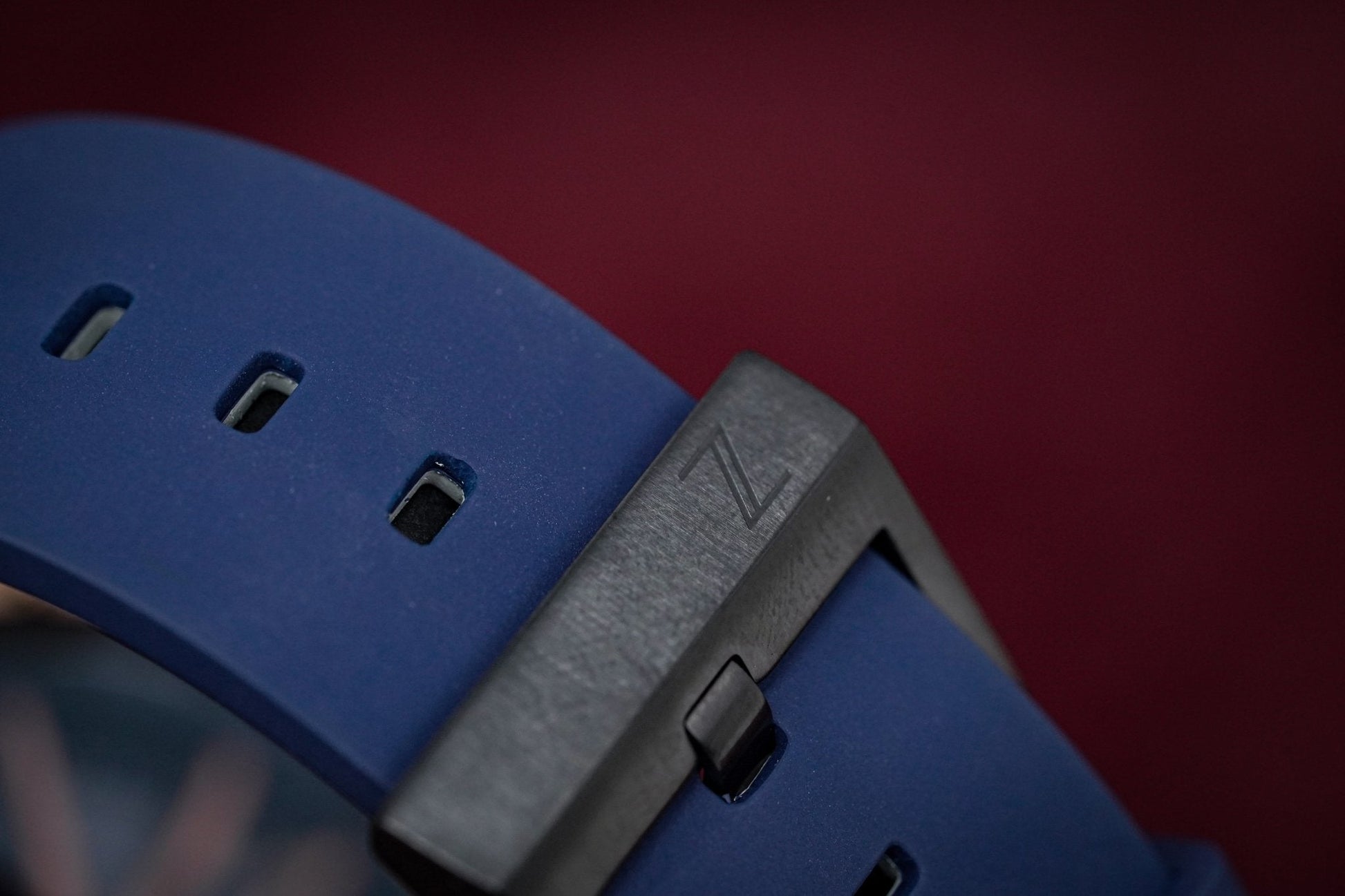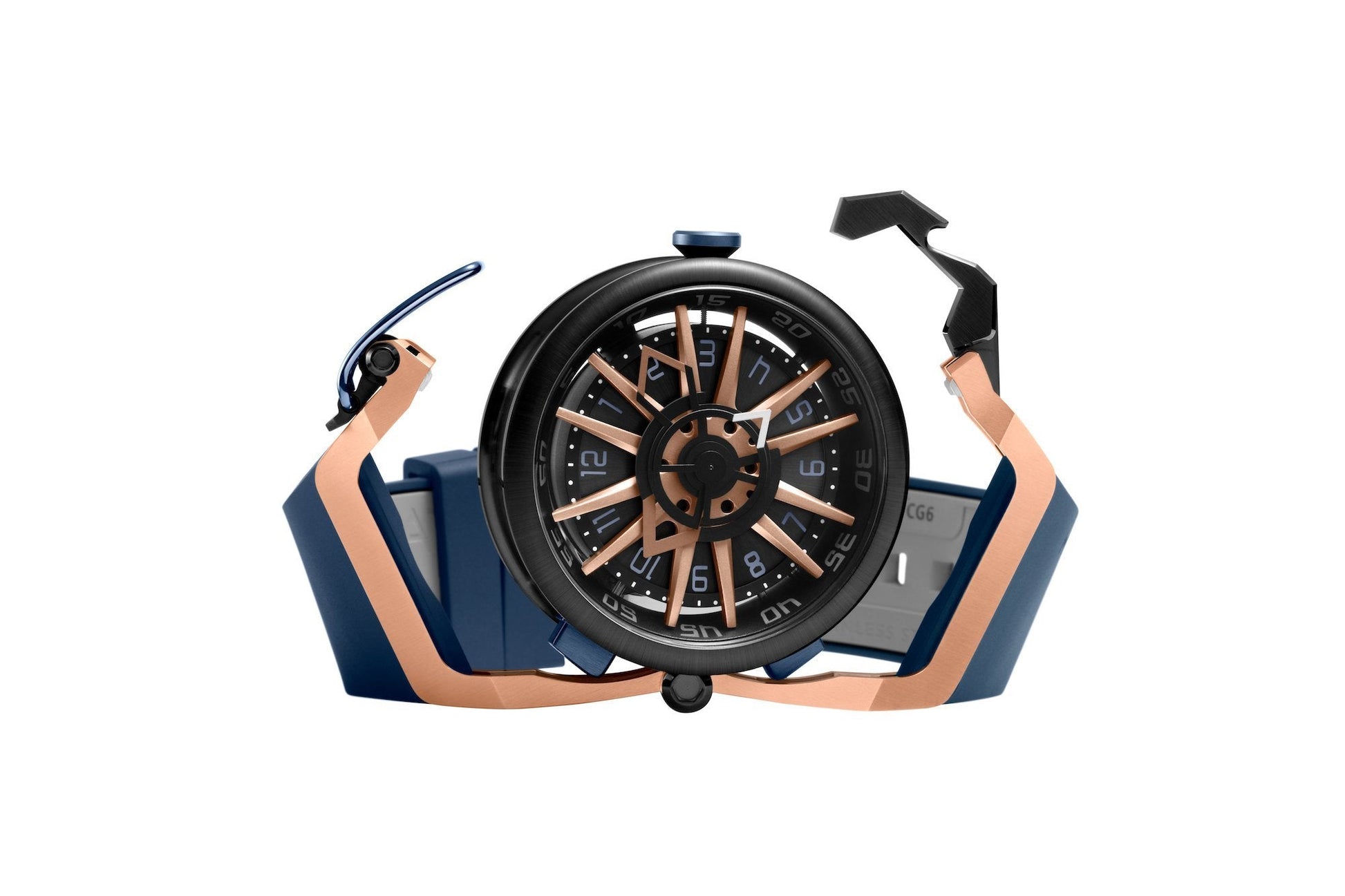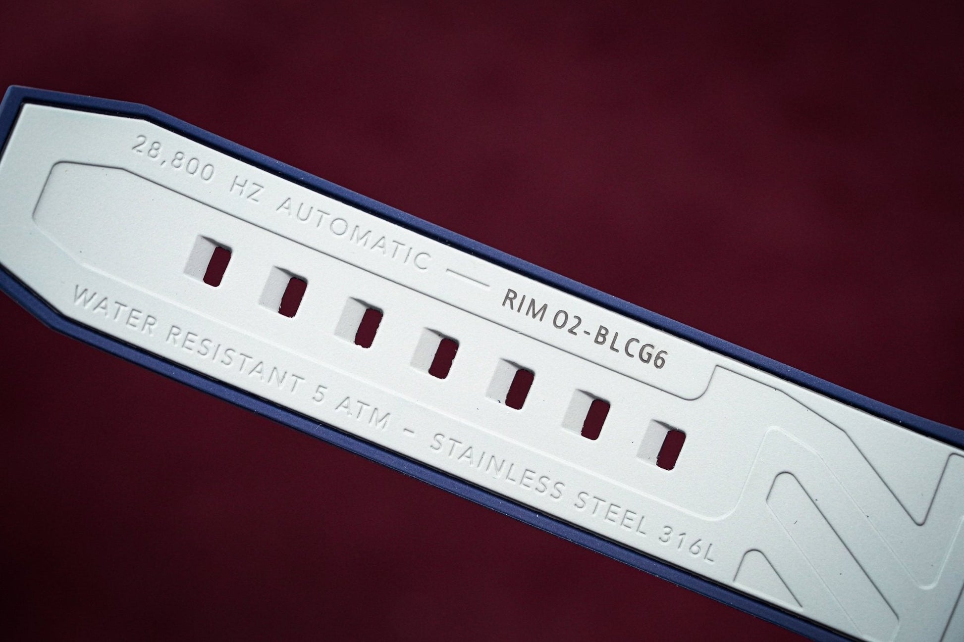 The ‘Reverse’ system allows the case to be inverted fully in both directions. A quick-release catch releases the crown from its protection by rotating the crown protector. Two special arms allow the case to rotate freely, and a clearly recognizable click tells you when the case is in the correct position to be locked back into place. A simple maneuver that transforms RIM into an elegant and sporty chronograph watch.