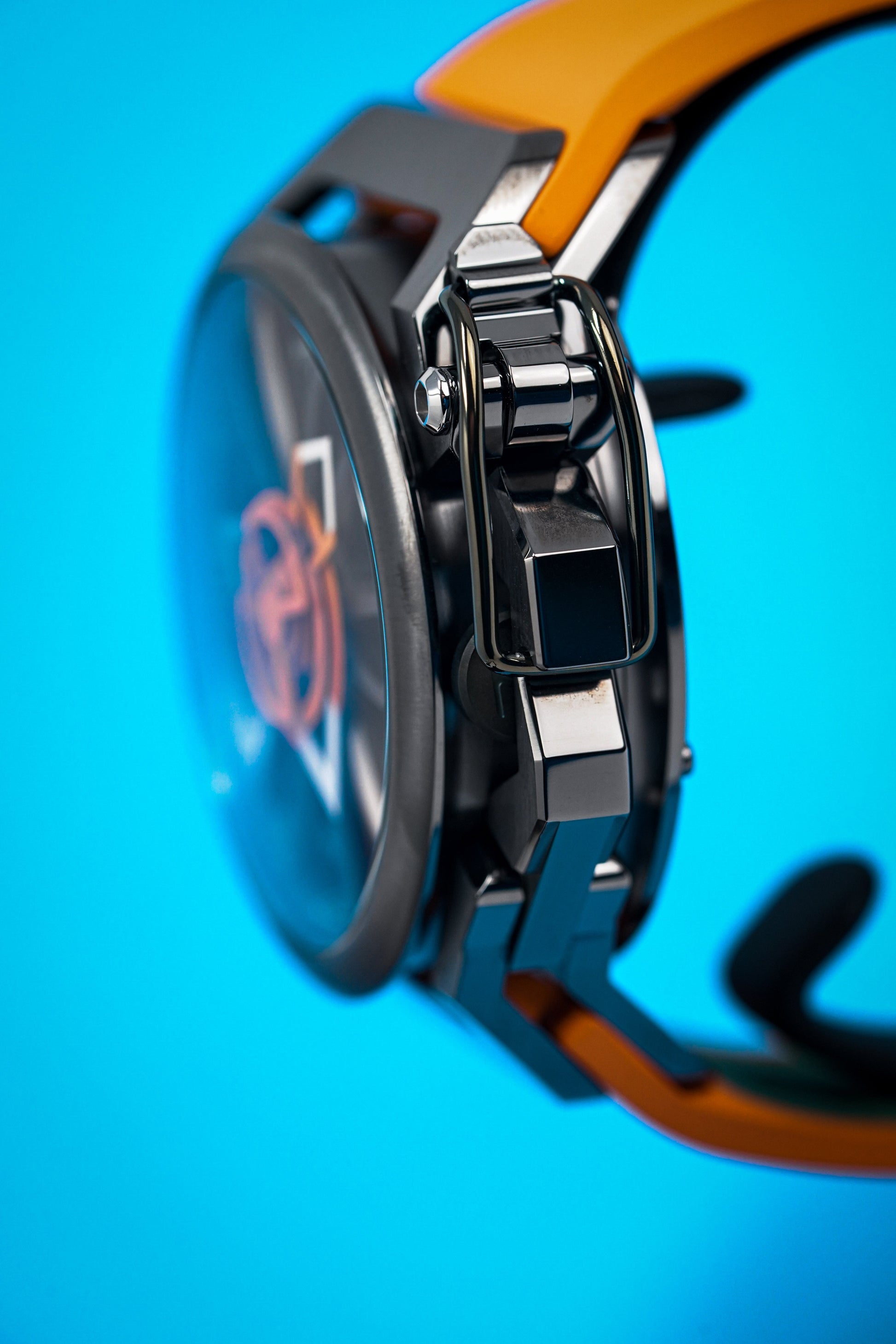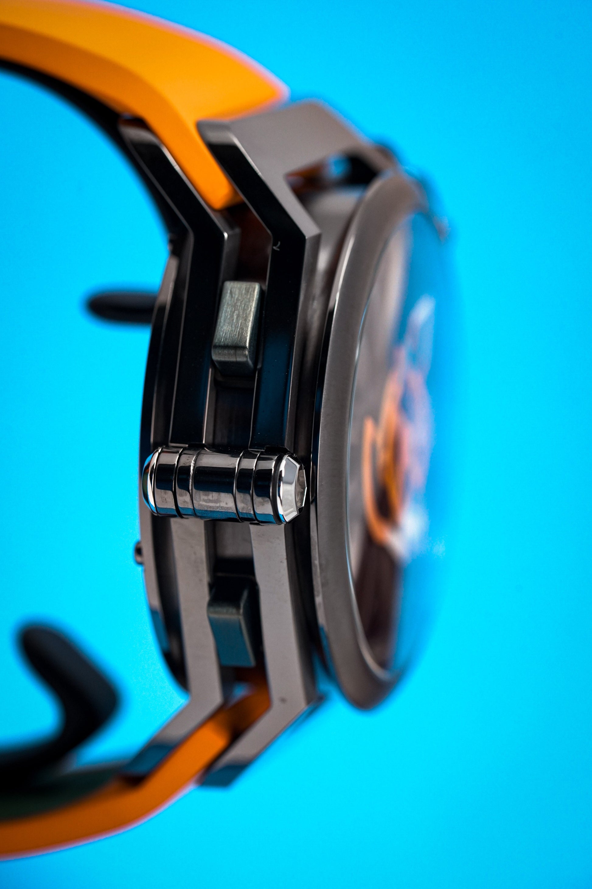 The ‘Reverse’ system allows the case to be inverted fully in both directions. A quick-release catch releases the crown from its protection by rotating the crown protector. Two special arms allow the case to rotate freely, and a clearly recognizable click tells you when the case is in the correct position to be locked back into place. A simple maneuver that transforms RIM into an elegant and sporty chronograph watch.