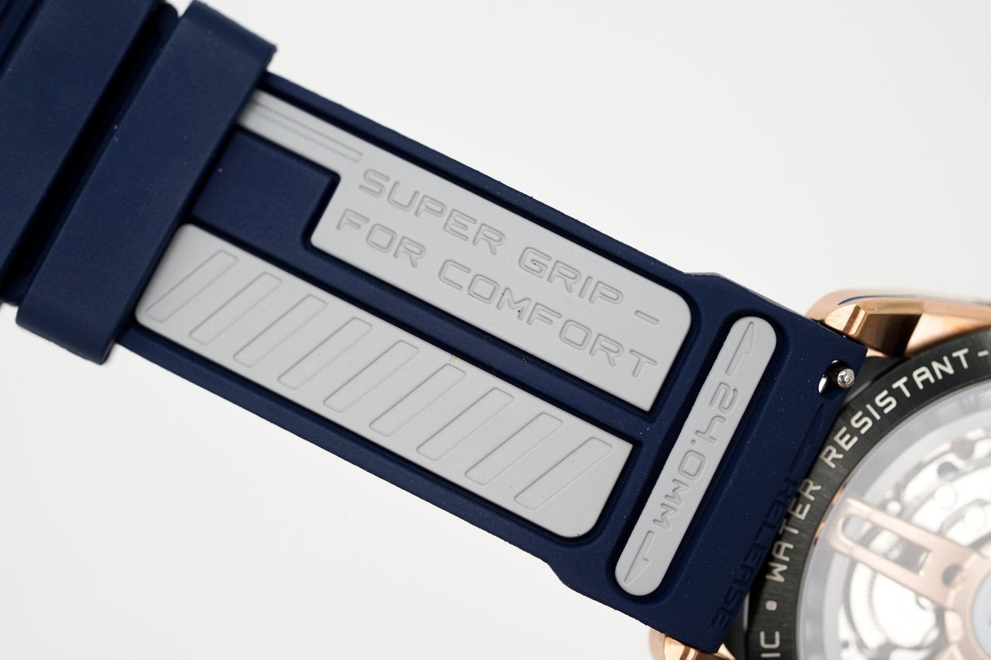 17cm x 24/22mm Two-Tone Blue/Grey Double Compression FKM Strap with IP Rose Gold 316L Stainless Steel Buckle - Strap Equipped with “Easy Spring Bar” for Easy Strap Interchange.