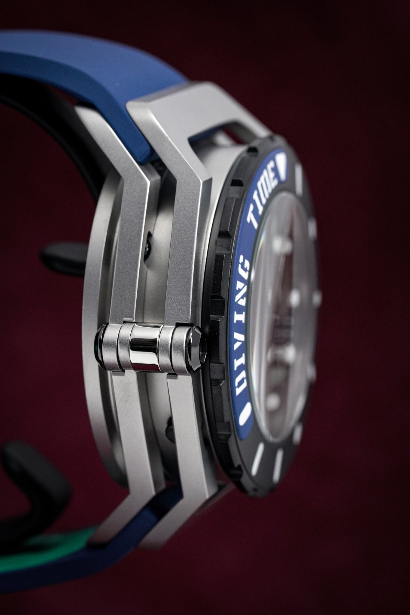 The ‘Reverse’ system allows the case to be inverted fully in both directions. A quick-release button releases the crown from its protection by rotating the crown protector. Two special arms allow the case to rotate freely, and a clearly recognizable click tells you when the case is in the correct position to be locked back into place.