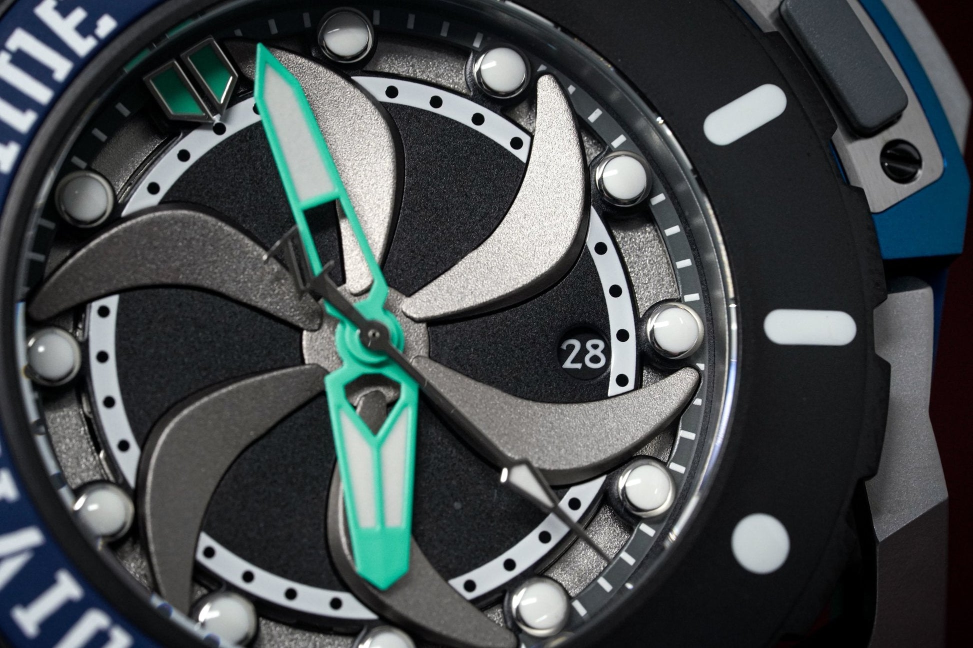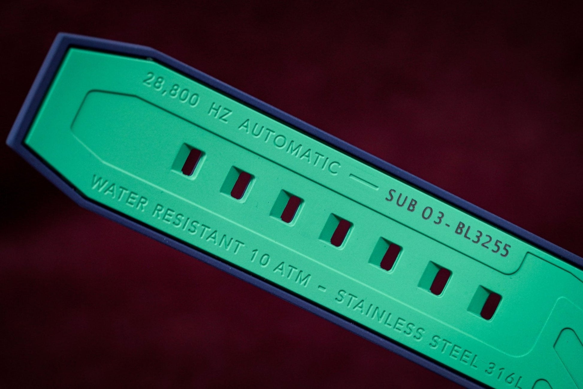 Side One: Propellor Design. Stainless Steel Hands with Luminous Filling. Date Window at 4 O'Clock. Side Two: Blue Dial. Stainless Steel Hands and Hour Markers with Lime Green Luminous Filling.
