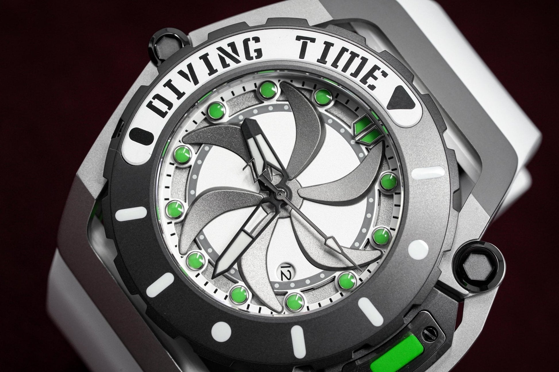 Side One: Propellor Design. Stainless Steel Hands with Luminous Filling. Date Window at 4 O'Clock. Side Two: White Dial. Stainless Steel Hands and Hour Markers with Coloured Luminous Filling.