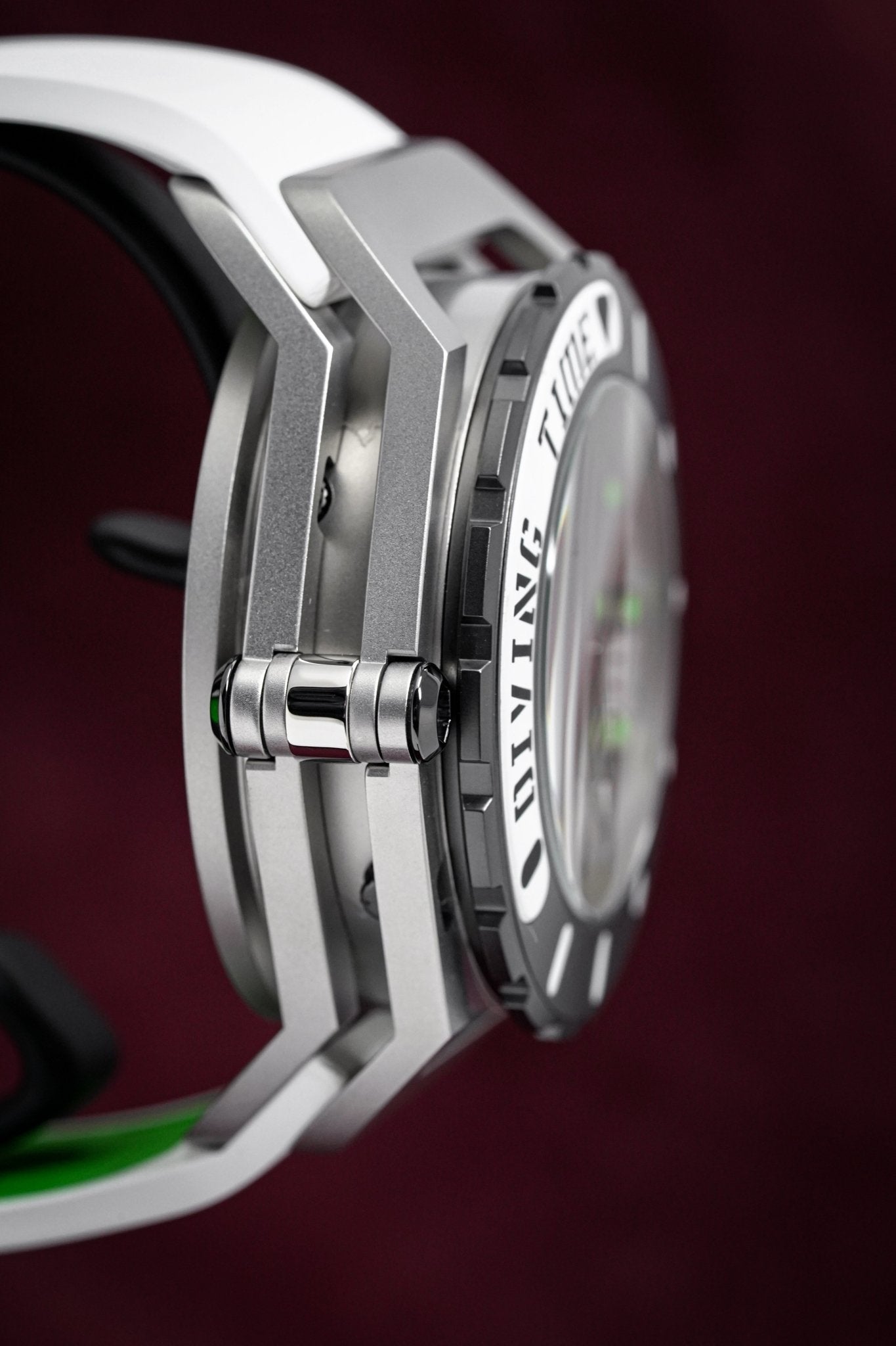 The ‘Reverse’ system allows the case to be inverted fully in both directions. A quick-release button releases the crown from its protection by rotating the crown protector. Two special arms allow the case to rotate freely, and a clearly recognizable click tells you when the case is in the correct position to be locked back into place.