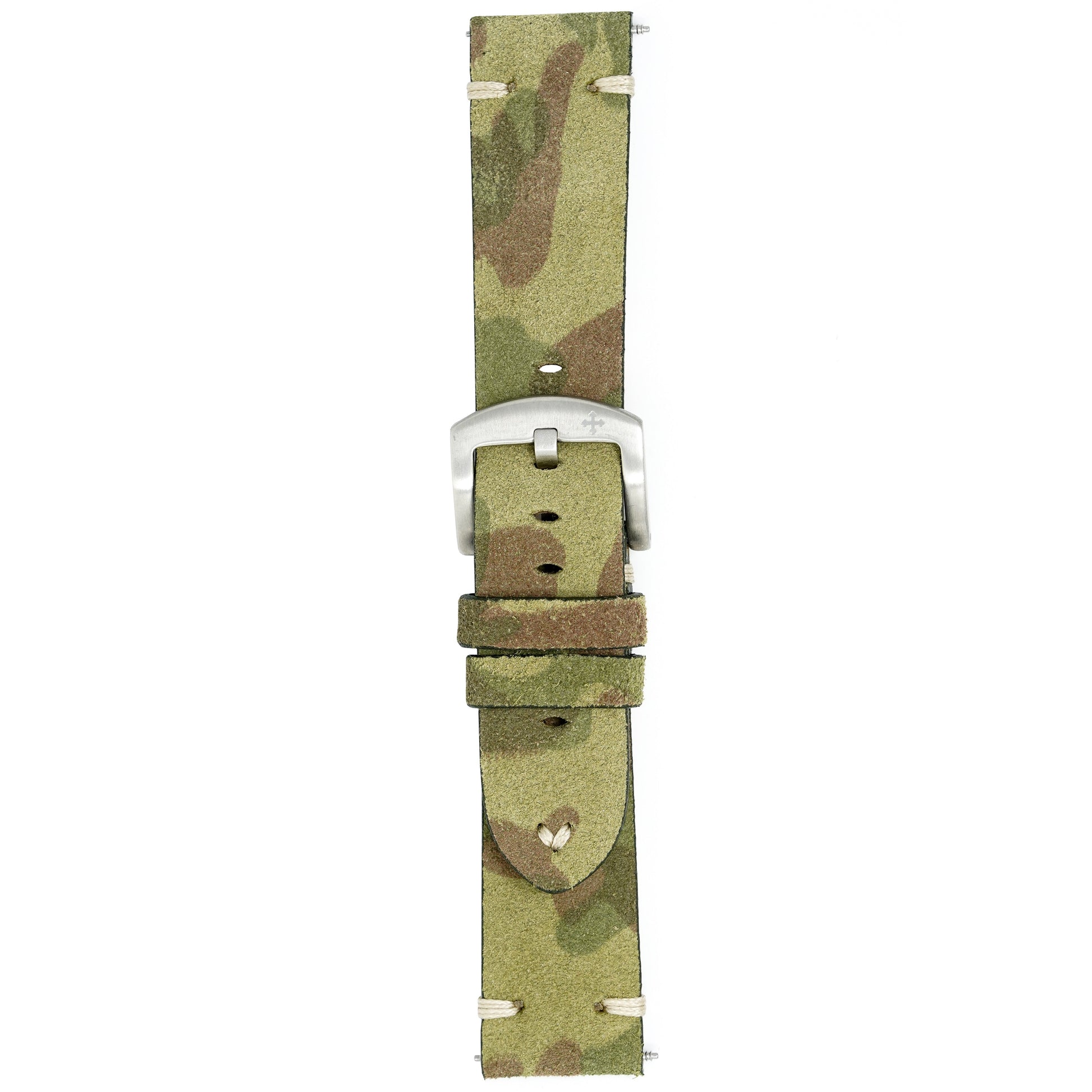 24/22mm width x 21.5cm Length Green Camo Handmade in Italy Leather Strap with Navy Stitchings - Fitted With a Brushed Stainless Steel Buckle.