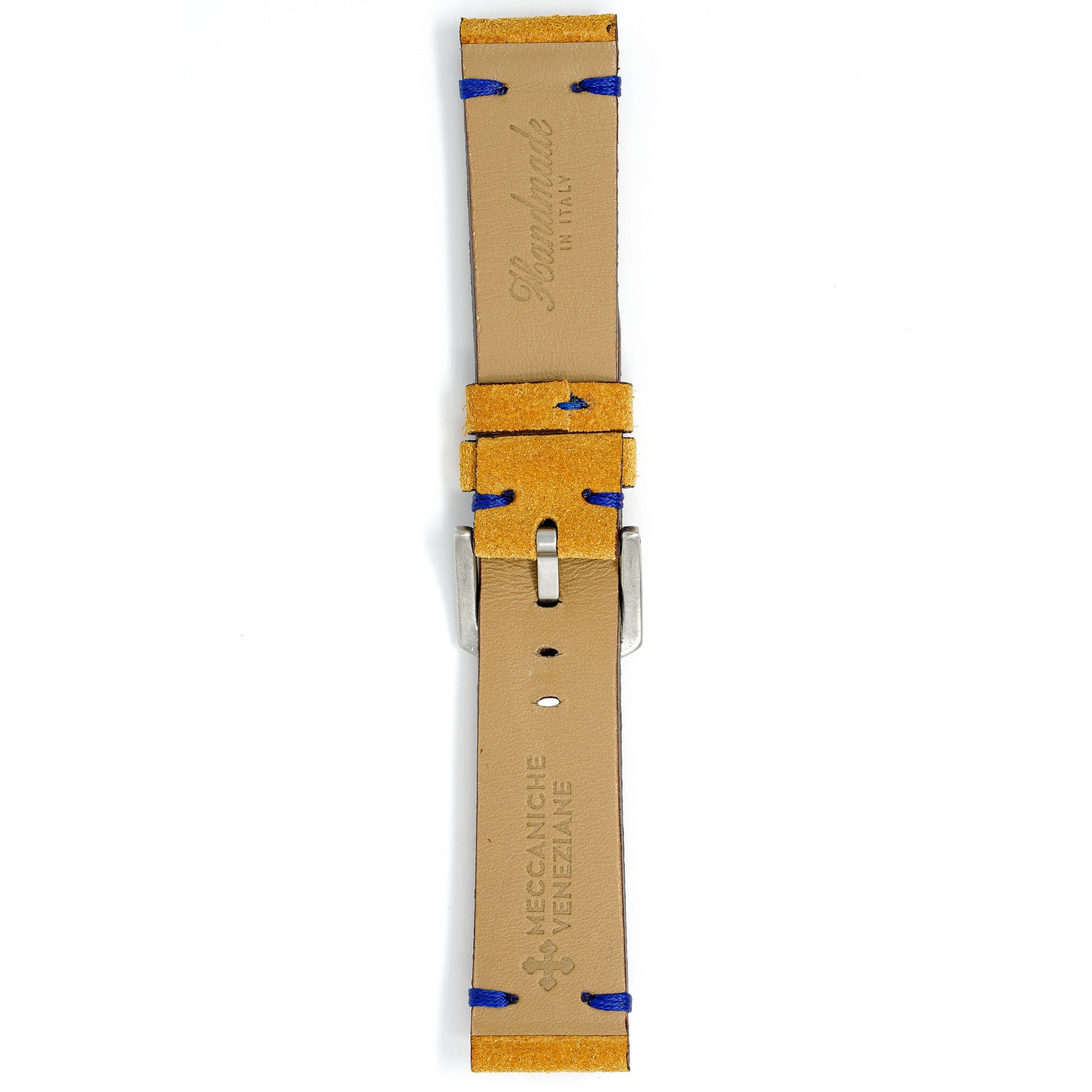 22/20mm width x 21.5cm Length Yellow Handmade in Italy Leather Strap with Blue Stitchings - Fitted With a Brushed Stainless Steel Buckle.